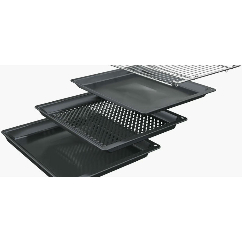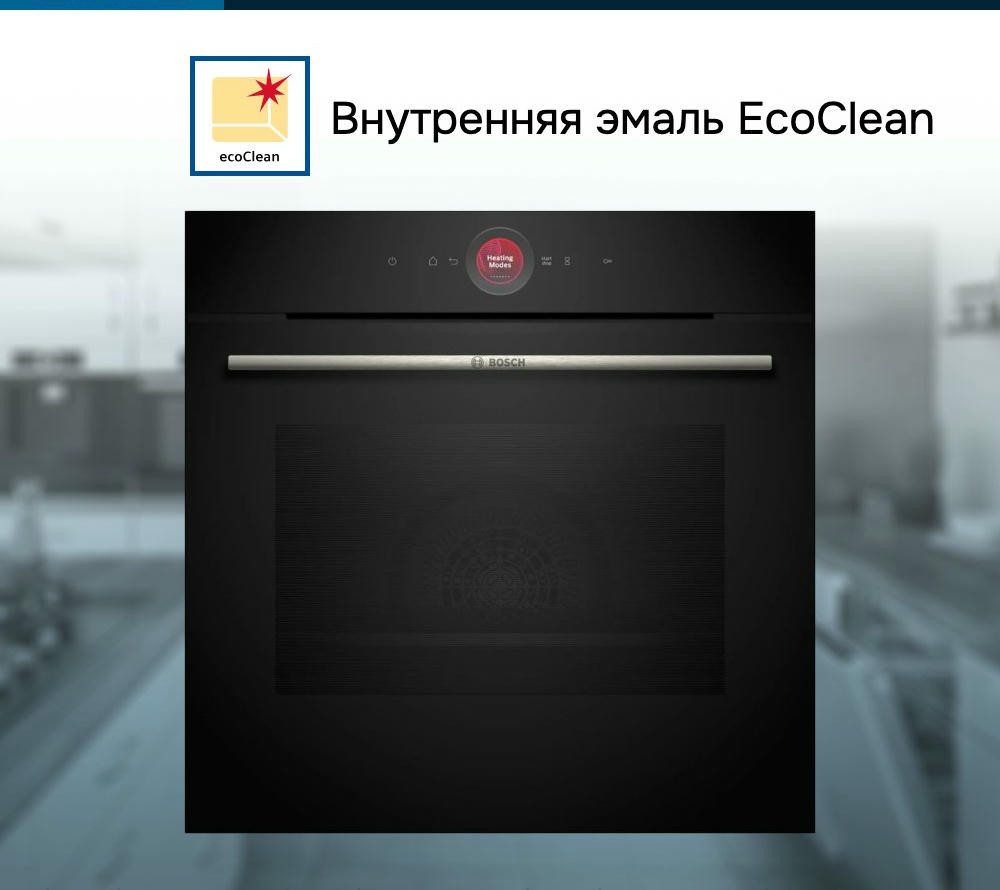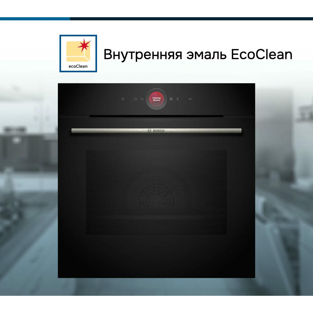 Духовой шкаф оснащен функцией Home Connect, которая позволяет управлять им дистанционно с помощью смартфона или планшета. Всего доступно 14 режимов нагрева, включая 3D-горячий воздух, верхний/нижний жар, большой гриль, режим для пиццы и другие. Диапазон температур варьируется от 30 до 300 градусов, что позволяет готовить самые разные блюда. Внутренний объем духового шкафа составляет 71 литр, что позволяет готовить большие порции еды для всей семьи. Внутреннее освещение на основе галогеновых ламп обеспечивает хорошую видимость в процессе приготовления пищи. Дверца шкафа откидная, с амортизатором SoftOpen для мягкого и безопасного открытия. Очистка духового шкафа производится с помощью системы EcoClean. Это специальные панели, расположенные на задней стенке, которые абсорбируют и разрушают жир и остатки пищи при повышенной температуре. Благодаря этому, вам не придется тратить много времени и усилий на очистку духового шкафа.