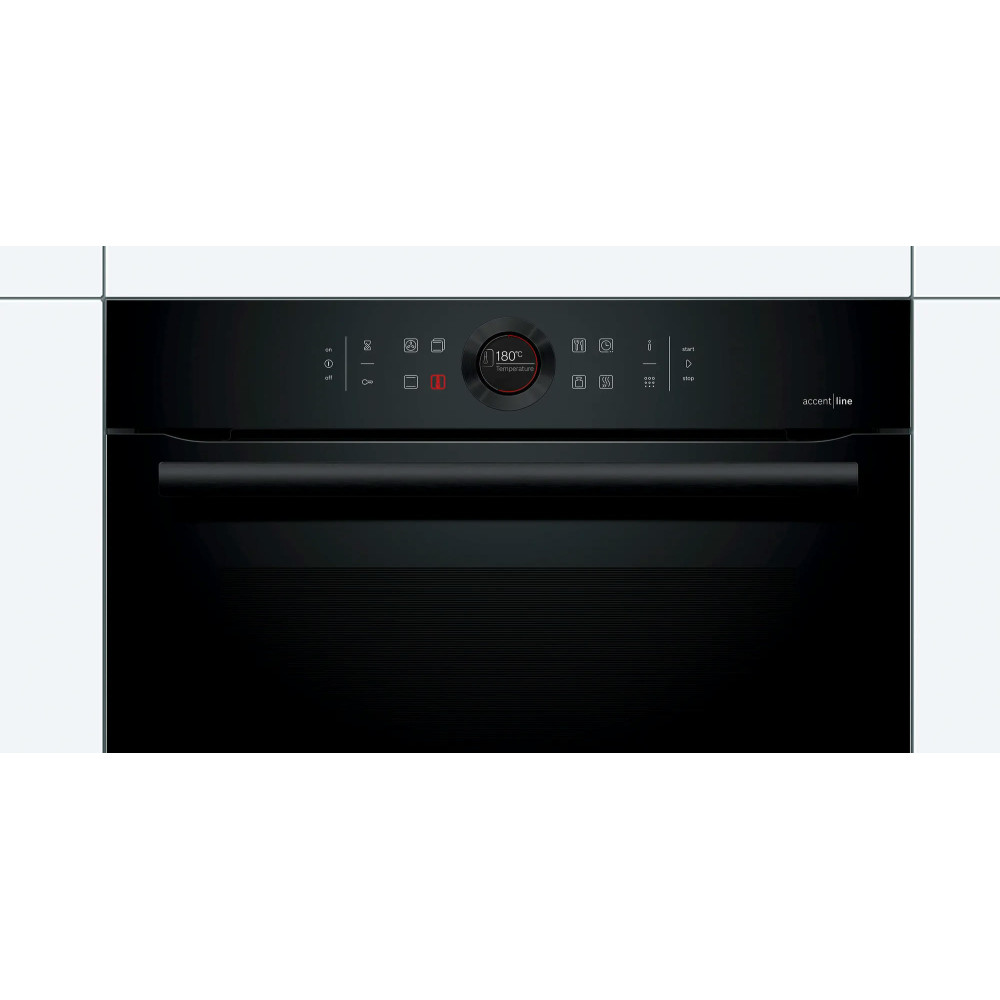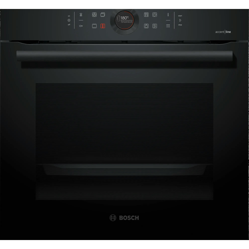 Электрический духовой шкаф Bosch HBG8755C0 из серии Serie | 8 — это высокотехнологичное и функциональное устройство, созданное в Евросоюзе. Он объединяет в себе элегантный дизайн и передовые технологии, обеспечивая идеальное приготовление пищи. Стильный черный цвет корпуса и фурнитуры придает прибору строгий и современный вид, который гармонично впишется в любую кухню. Компактные размеры позволяют встраивать духовой шкаф в нишу размером 58.5-59.5x56-56.8x55 см, что делает его идеальным решением для оптимизации пространства. Управление осуществляется с помощью сенсорных кнопок, размещенных на 7.5_ цветном TFT дисплее. Это не только удобно, но и помогает создать безупречный, минималистичный дизайн. Дисплей также позволяет легко следить за процессом приготовления и контролировать все режимы работы. Духовой шкаф оснащен 13 режимами нагрева, включая 4D-горячий воздух, верхний/нижний жар, гриль с конвекцией и бережное тушение. Это позволяет готовить любые блюда, от пиццы до деликатесов. Диапазон температур от 30 до 275 _C обеспечивает точное и равномерное нагревание. Особенностью прибора является наличие автоматического быстрого разогрева и 10 автоматических программ, которые облегчают процесс приготовления. Внутреннее освещение на галогенной основе обеспечивает отличную видимость, а система пиролитической очистки позволяет легко поддерживать чистоту внутри духового шкафа. Модель оснащена откидной дверцей с амортизатором SoftClose, что обеспечивает мягкое и бесшумное закрывание. Телескопические направляющие на трех уровнях упрощают процесс извлечения и установки противней. Блокировка от детей обеспечивает безопасность использования, а система охлаждения прибора предотвращает перегрев.