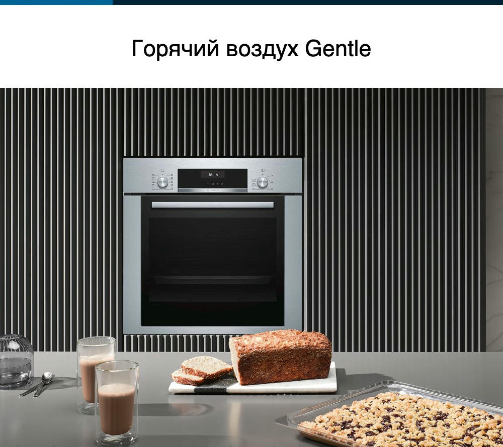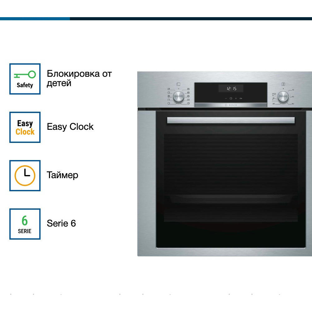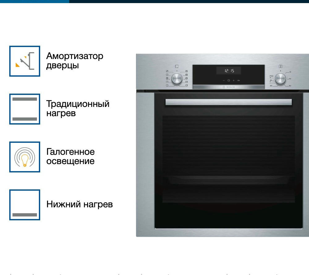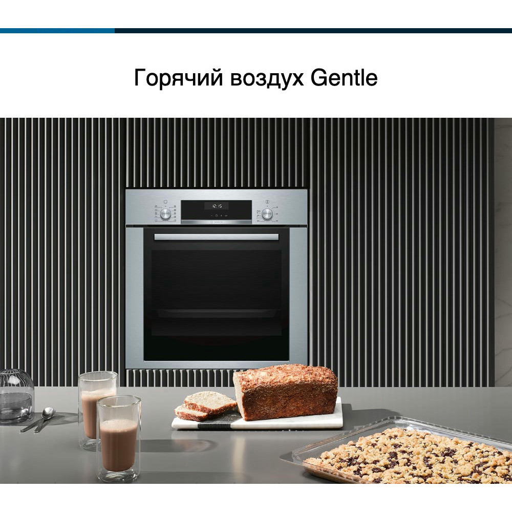 С помощью поворотных ручек и электронного программатора пользователь быстро и точно установит нужные настройки. Заданные параметры выводятся на дисплей. Помимо этого, в панели управления духового шкафа Бош HBJ354AS0Q предусмотрены сенсорные переключатели. Функция автоматического быстрого разогрева позволяет приготовить блюдо намного быстрее. Опция на некоторое время повышает мощность прибора до максимума, а затем переключает на ранее установленный уровень.