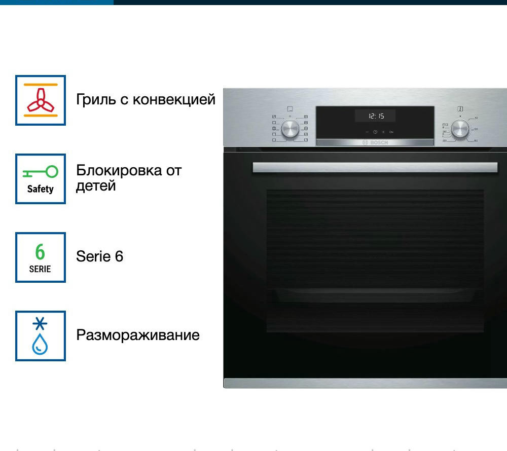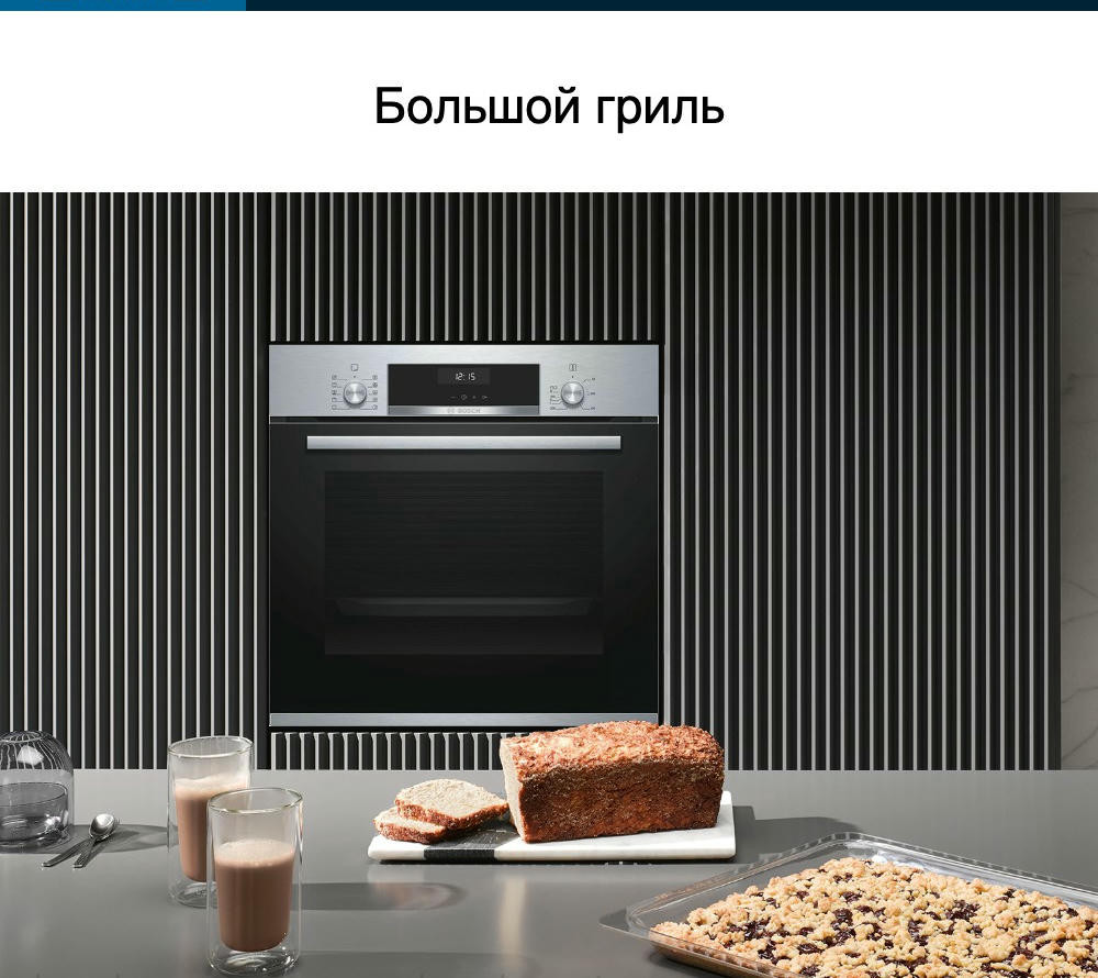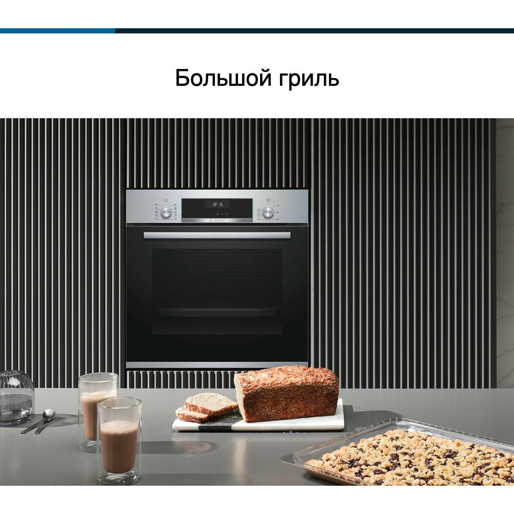 Встроенная панель управления включает в себя два утапливаемых переключателя и сенсорный дисплей. Такой тип управления — это не только достижение результата легким касанием руки. Это надежность, т.к. сенсорные панели укрывают электронику от внешних загрязнений. Это точность настроек, поскольку чувствительные датчики улавливают едва заметные перемещения пальцев. Благодаря подсветке внутренне камеры можно удобно следить за процессом готовки пищи. На двух уровнях духового шкафа Бош HBJ558YS0Q расположены выдвижные телескопические направляющие. За счет этого Вам будет особенно легко ставить тяжелые противни в прибор, а затем доставать их.