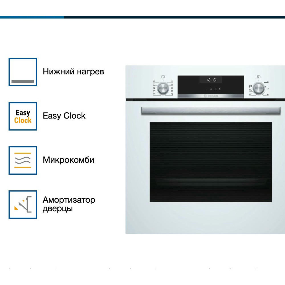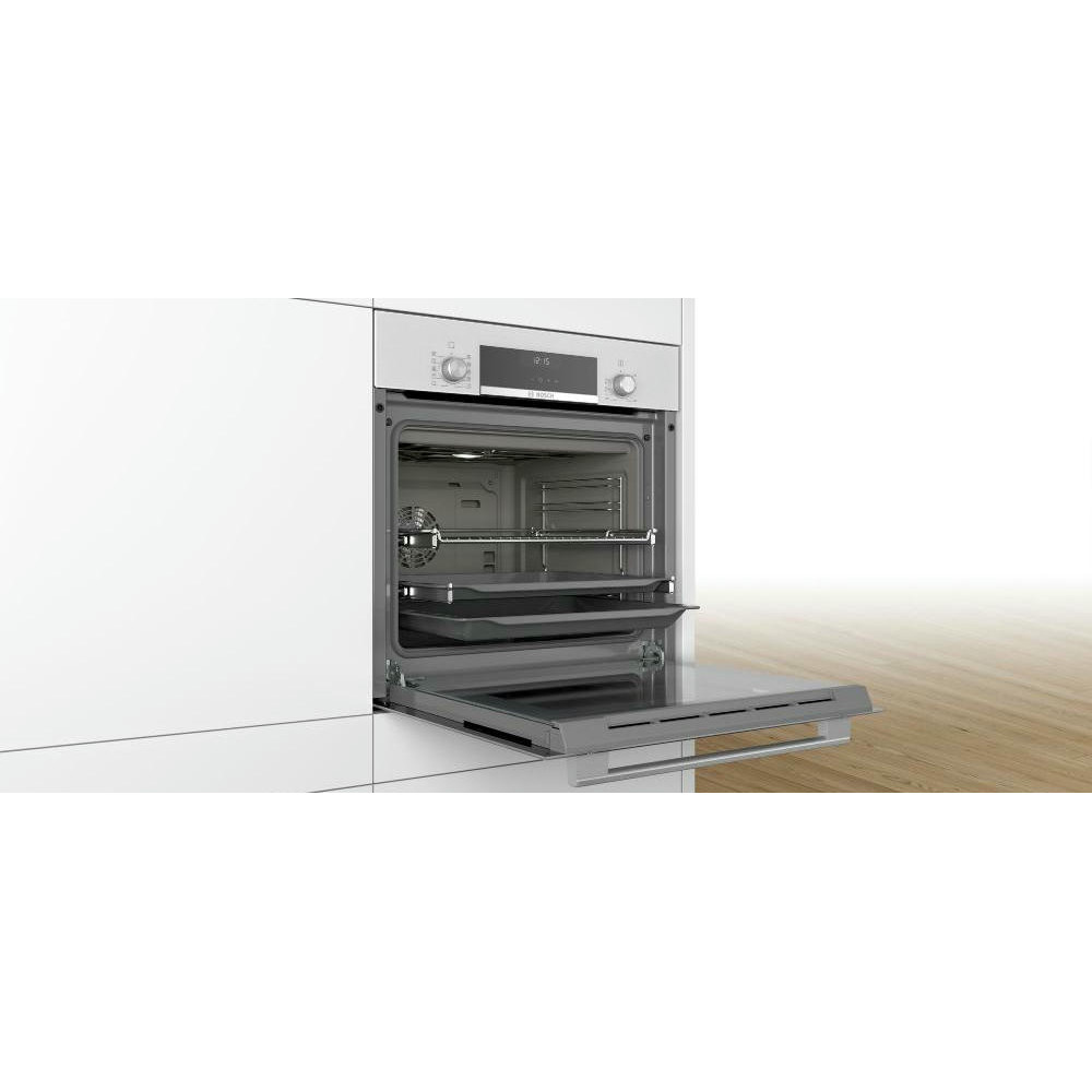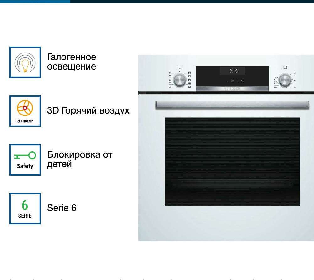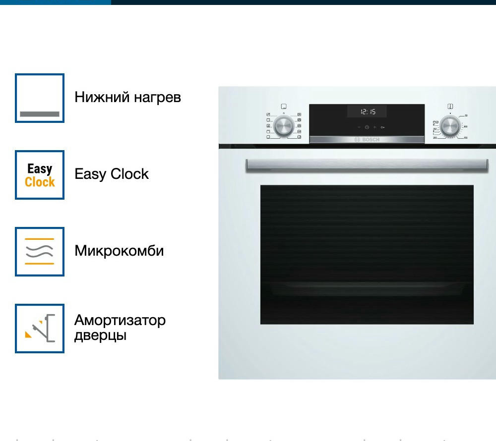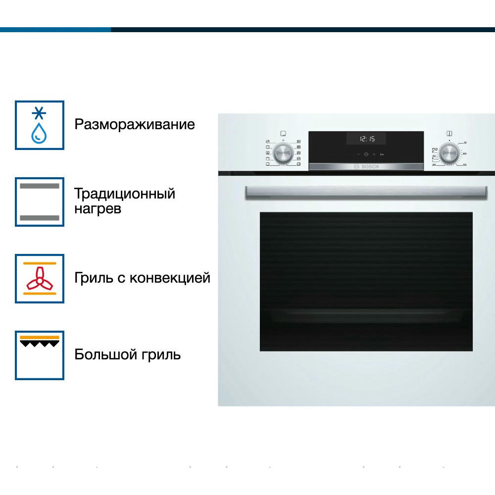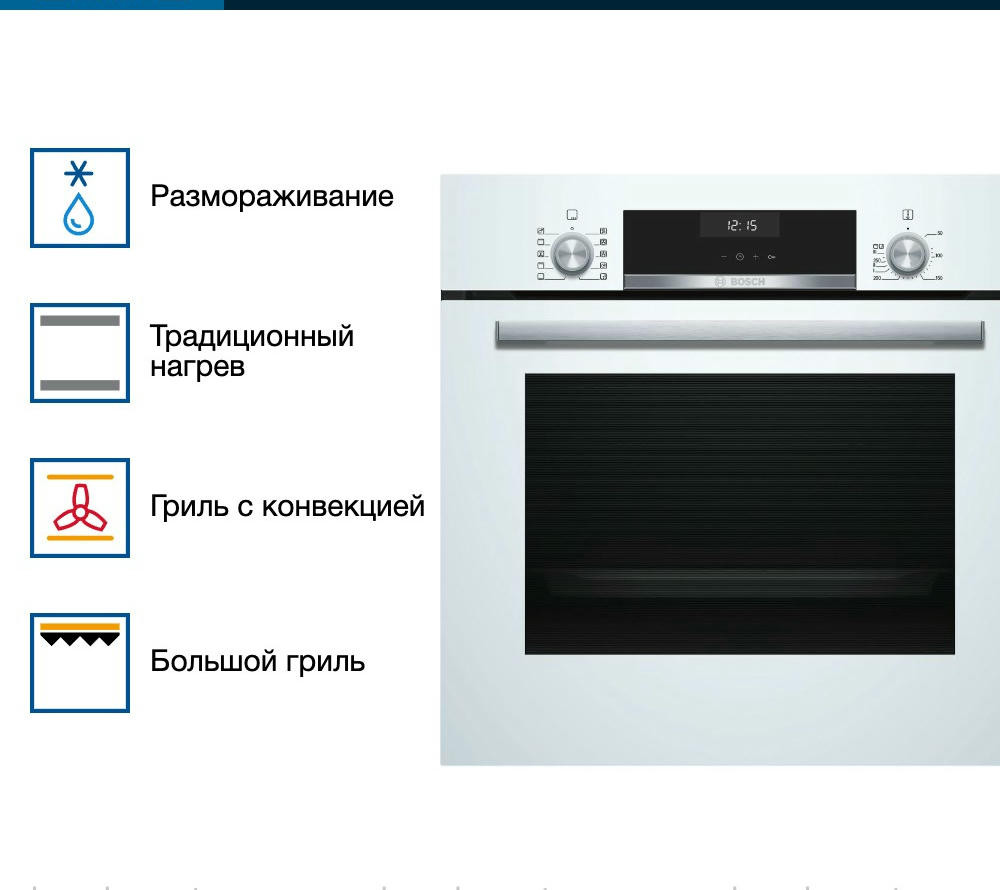 Духовой шкаф Bosch HBJ558YW0Q оснащен 8 режимами нагрева, среди которых — гриль, конвекция и размораживание. В камере предусмотрено пять уровней установки противней, на двух из них установлены телескопические направляющие. Наружное стекло нагревается не более чем до 40_С. В комплект входит комбинированная решётка и два противня (эмалированный и универсальный, противень для гриля).