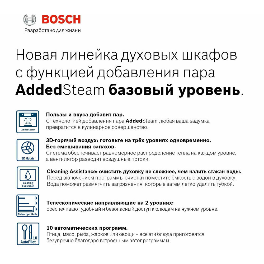 Bosch HIJ517YB1R имеет 10 автоматических программ приготовления. От вас требуется выставить вес и тип продукта, остальные характеристики прибор подберёт самостоятельно. Режим 3D горячий воздух обеспечивает равномерное распределение тепла для приготовления на трёх уровнях одновременно. Функция добавления пара AddedSteam позволит приготовить любимые блюда сочными и с хрустящей корочкой.