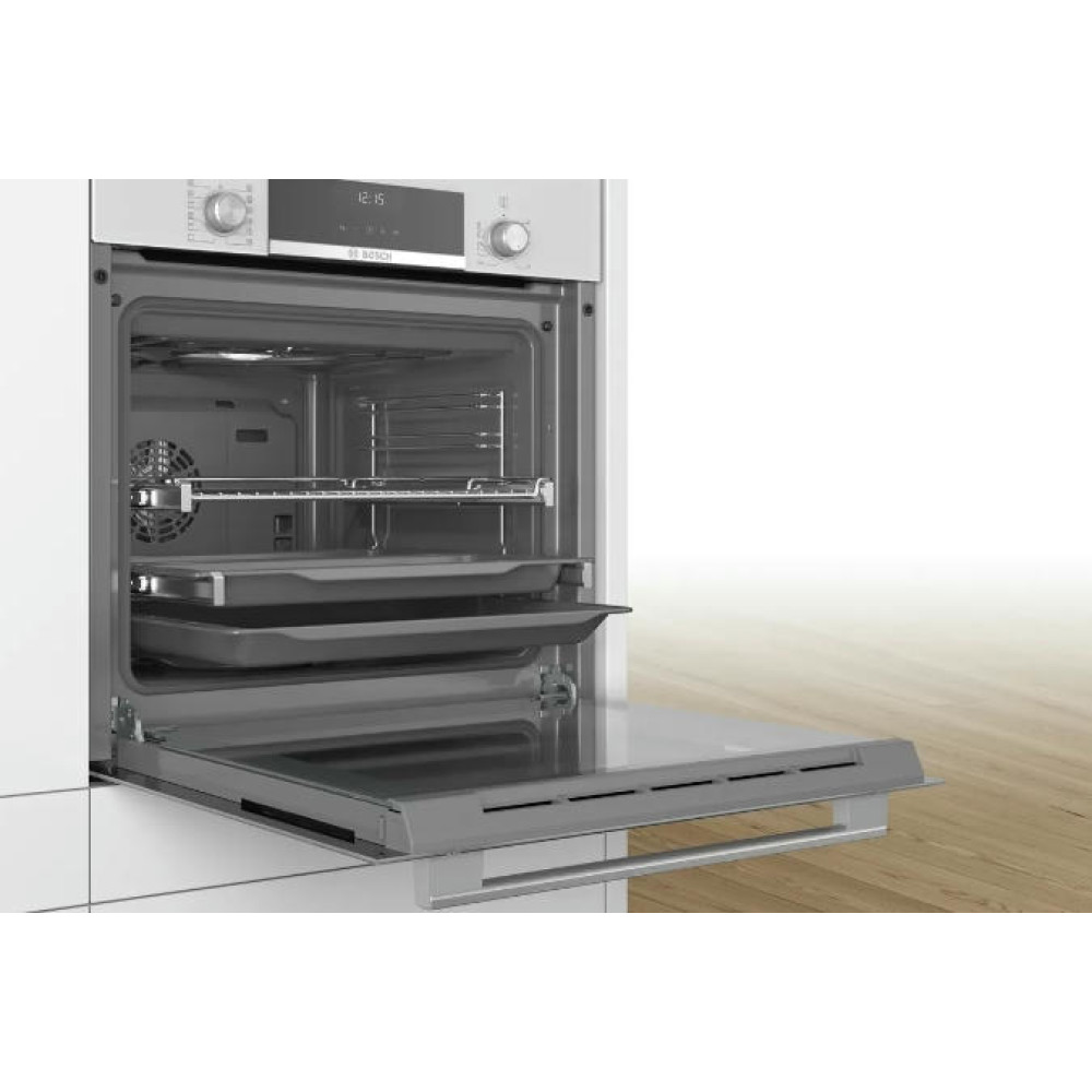 Духовой шкаф Bosch HIJ517YW2R оснащен 10-ю автоматическими программами AutoPilot и конвекцией 3D-горячий воздух — для приготовления нескольких блюд одновременно. Специальный амортизатор SoftClose позволяет закрывать дверцу плавно без усилий и хлопка, а телескопические направляющие на 2 уровнях обеспечат удобный доступ к блюдам.