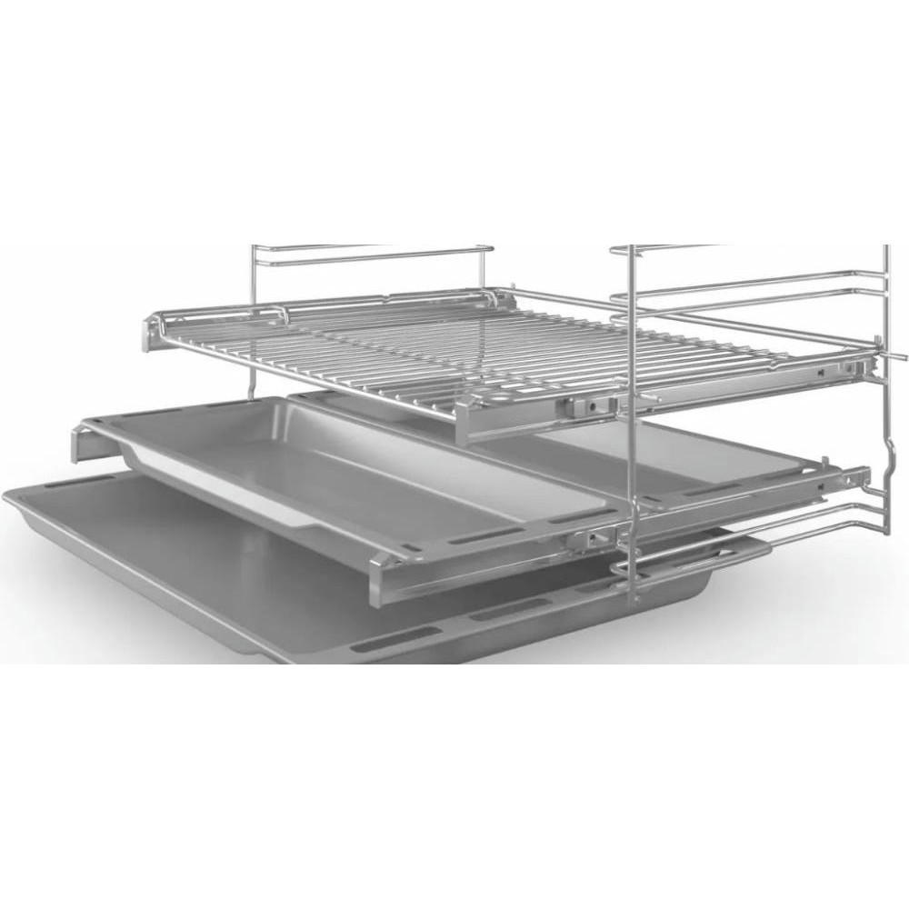 Особенность комплектации этого прибора — телескопические направляющие на двух уровнях и два узких противня. На них удобно печь пироги, разогревать полуфабрикаты.