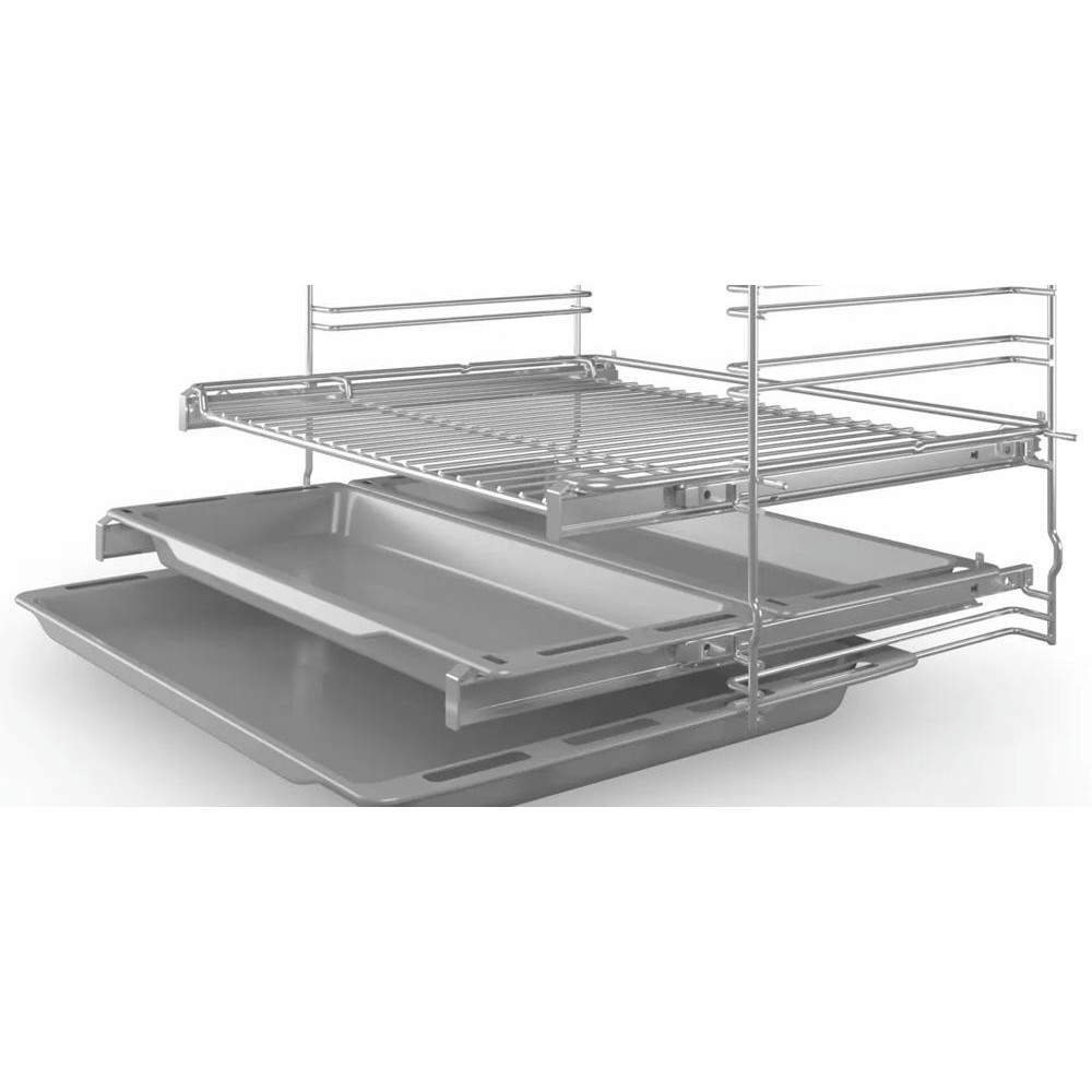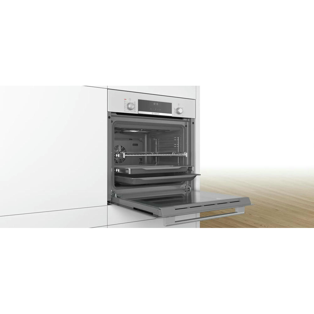 Духовой шкаф BOSCH HIJ557YW0R оснащен LCD дисплеем с сенсорными кнопками, поворотные переключатели утапливаются и обеспечивают удобную очистку. Функция 3D горячий воздух предназначена для одновременного приготовления на разных уровнях за счёт равномерного распределения горячего воздуха. Телескопические направляющие гарантируют безопасное извлечение противней.