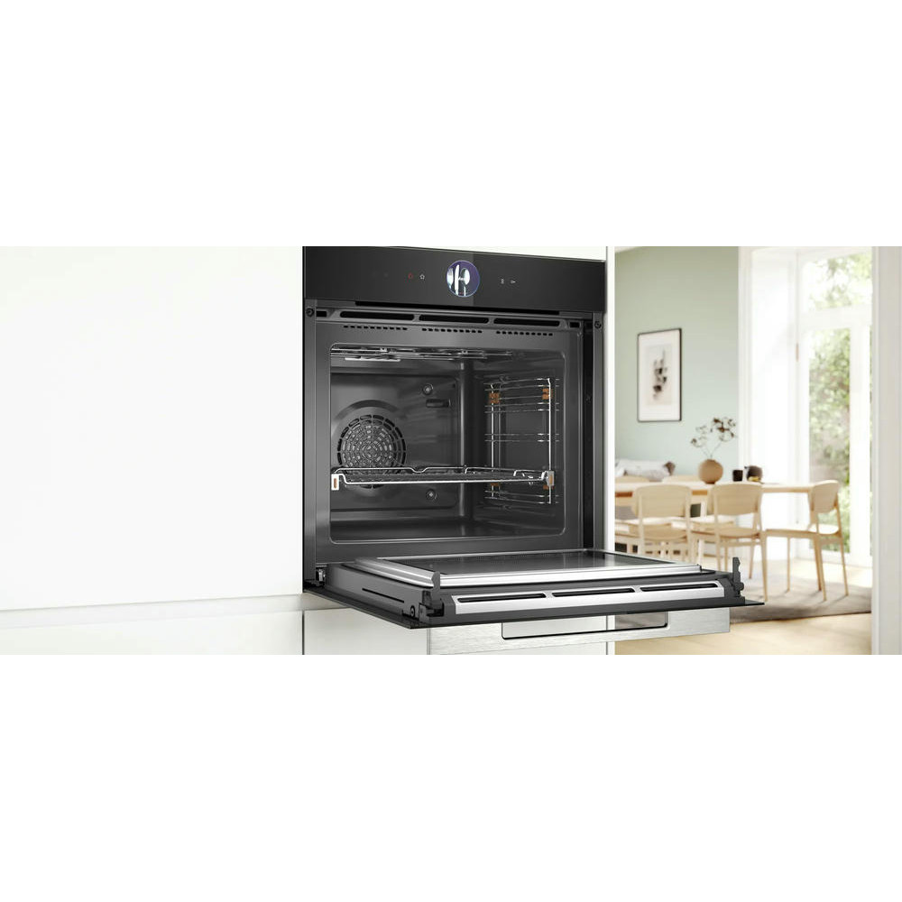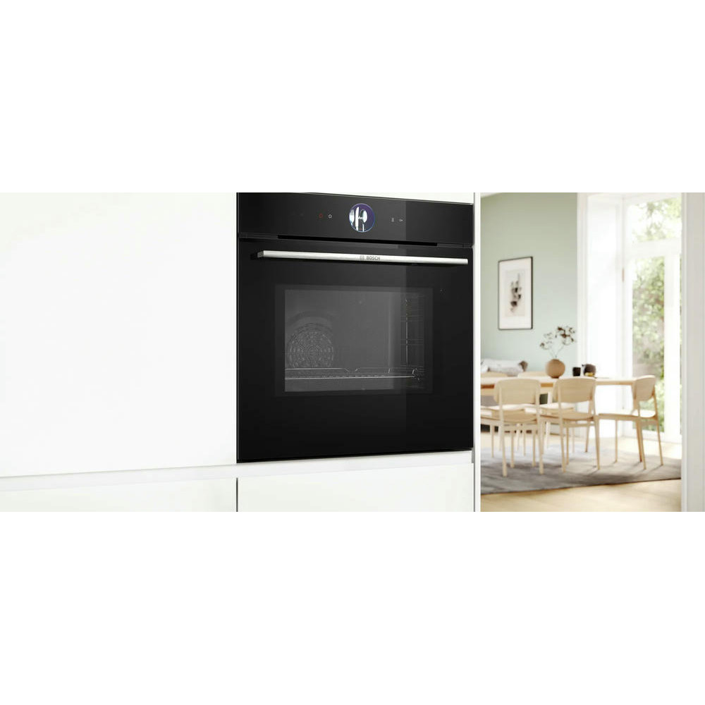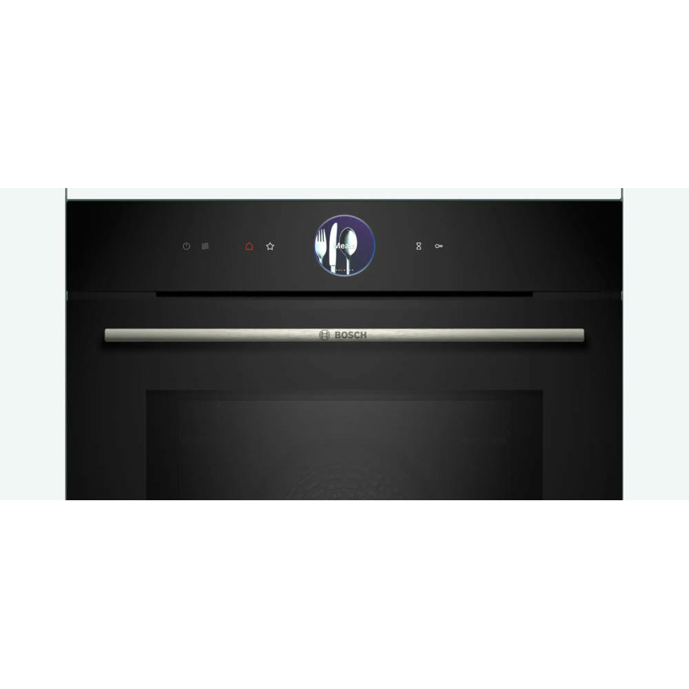 Духовой шкаф Bosch HMG776NB1 является высококачественным прибором от известного европейского производителя. Принадлежащий к серии Serie | 8, он обеспечивает превосходные возможности приготовления пищи благодаря своим продвинутым функциям и инновационным технологиям. Этот электрический духовой шкаф обладает внутренним объемом 67 литров, что позволяет приготовить большое количество блюд одновременно. Его уникальный черный цвет придает ему стильный и современный внешний вид, который будет гармонично сочетаться с любым интерьером кухни. Управление прибором осуществляется с помощью сенсорных кнопок на 2.5" цветном TFT дисплее, что делает его использование максимально удобным и интуитивно понятным. Встроенные электронные часы и таймер помогают контролировать процесс приготовления пищи и предотвращать ее пережаривание.