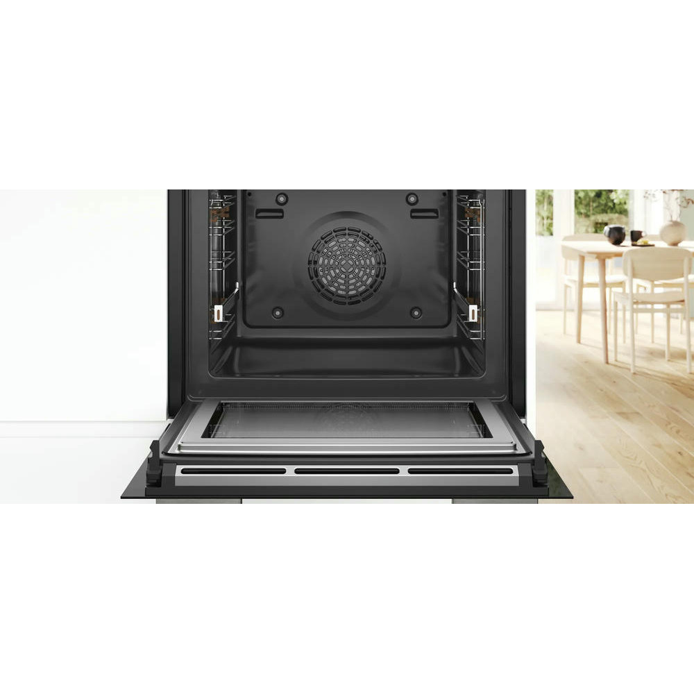 Особенностью этого духового шкафа является наличие 15 режимов нагрева, включая 4D-горячий воздух, верхний/нижний жар, большой и малый гриль, режим для пиццы, поддержание температуры и даже размораживание. Благодаря такому разнообразию функций, вы сможете приготовить любое блюдо, следуя своим кулинарным предпочтениям. Внутреннее освещение на основе LED-технологии обеспечивает яркое и равномерное освещение внутреннего пространства шкафа, что позволяет легко контролировать процесс приготовления пищи. Пиролитическая очистка обеспечивает легкую и эффективную очистку от жира и других загрязнений. Откидная дверца с амортизатором SoftOpen обеспечивает мягкое и безопасное открытие и закрытие дверцы. Четырехслойное остекление дверцы и температура нагрева наружного стекла всего 30 градусов обеспечивают безопасность использования духового шкафа. Духовой шкаф Bosch HMG776NB1 оснащен телескопическими направляющими, которые облегчают процесс установки и извлечения противней. Благодаря функции блокировки от детей, вы можете быть уверены в безопасности своих маленьких домочадцев.