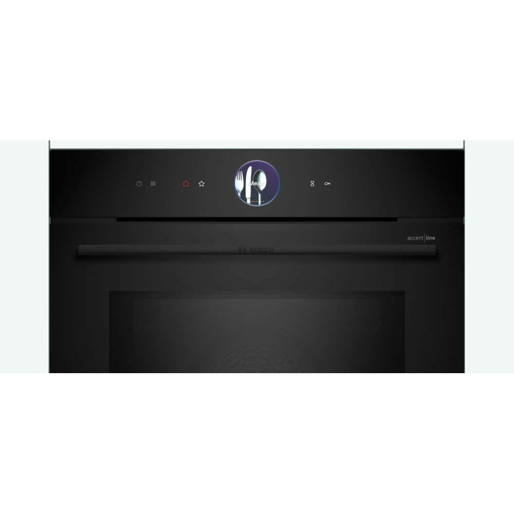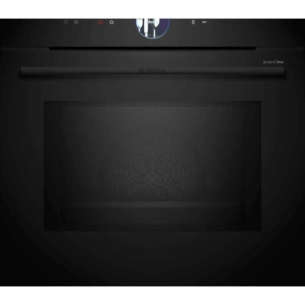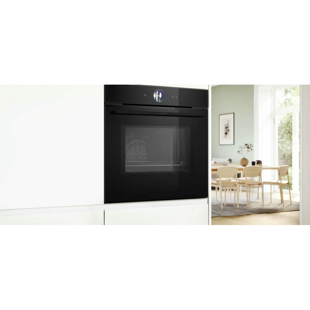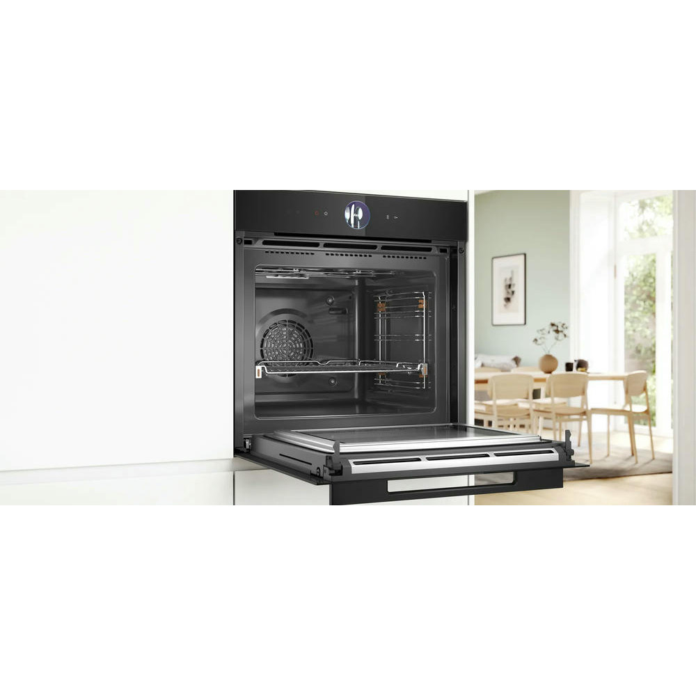 Духовой шкаф Bosch HMG976RB1S имеет функцию микроволной печи, вы можете готовить пищу исходя из характеристик указанных на упаковке продукта и выставлять мощность на устройстве. 4D Hotair равномерно распределяет горячий воздух по всем уровням приготовления. Телескопические направляющие нужны для безопасного извлечения противня.