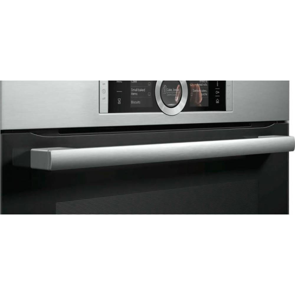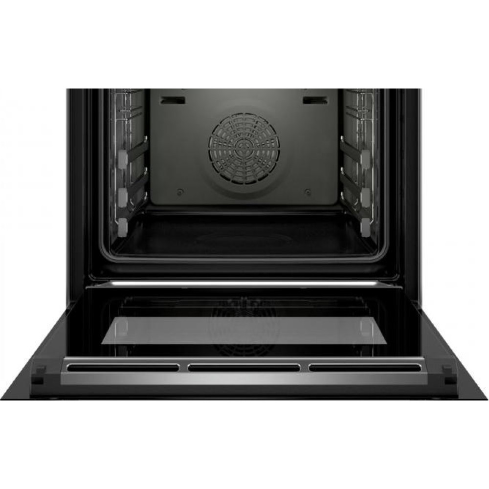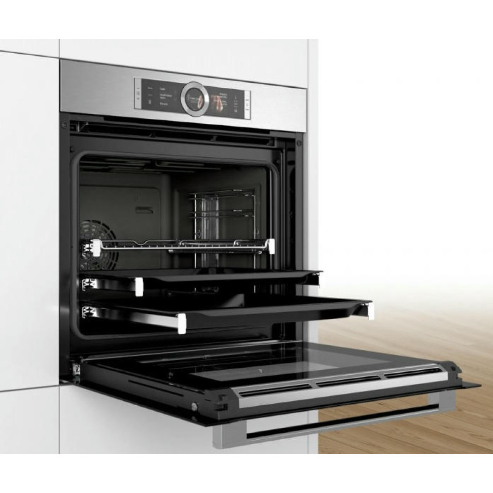 Электрический духовой шкаф HSG656XS1 выполнен в цвете «нержавеющая сталь». Полностью стеклянная внутренняя поверхность дверцы легко очищается от загрязнений. Трехуровневые телескопические направляющие уменьшают риск получения ожогов о горячую поверхность противней и решеток. Резервуар для воды находится за выдвижной панелью управления: такая особенность конструкции подчеркивает функциональность и минимализм в дизайне. Автоматическое защитное отключение выключает нагрев при длительной работе прибора без изменения настроек или превышении допустимой температуры.