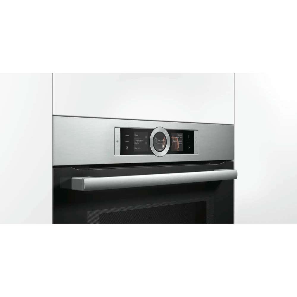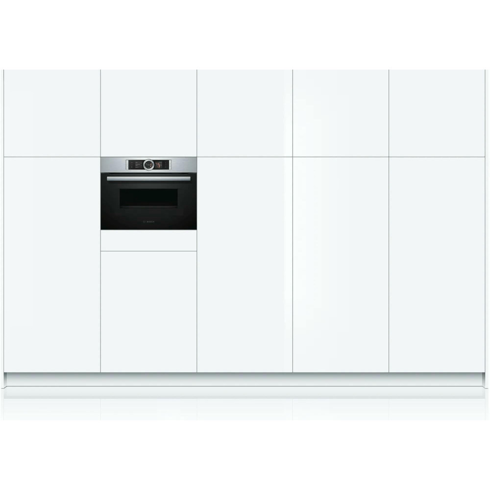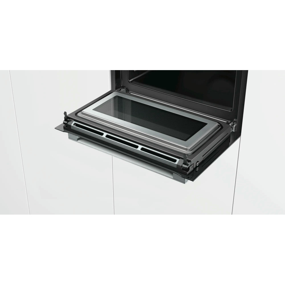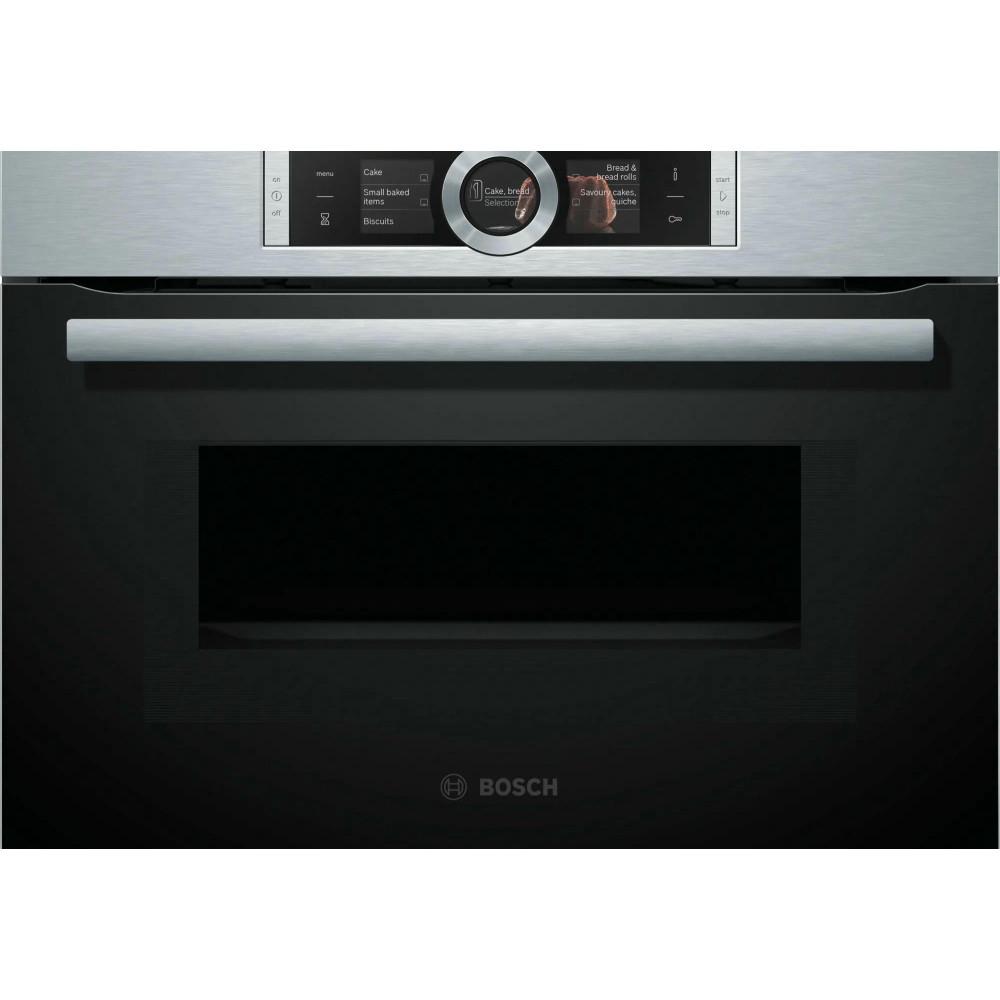Компактный духовой шкаф Bosch CMG656BS1M — небольшая модель черного цвета с цветным TFT-дисплеем и переключателем ControlRing. Прибор может работать не только в режиме духовки, но и в режиме микроволновой печи. Разогревать блюда стало намного проще. Эмаль EcoClean Direct упростит уход за устройством. Дверца духовки с амортизаторами SoftOpen и SoftClose бесшумна и не доставит неудобств.