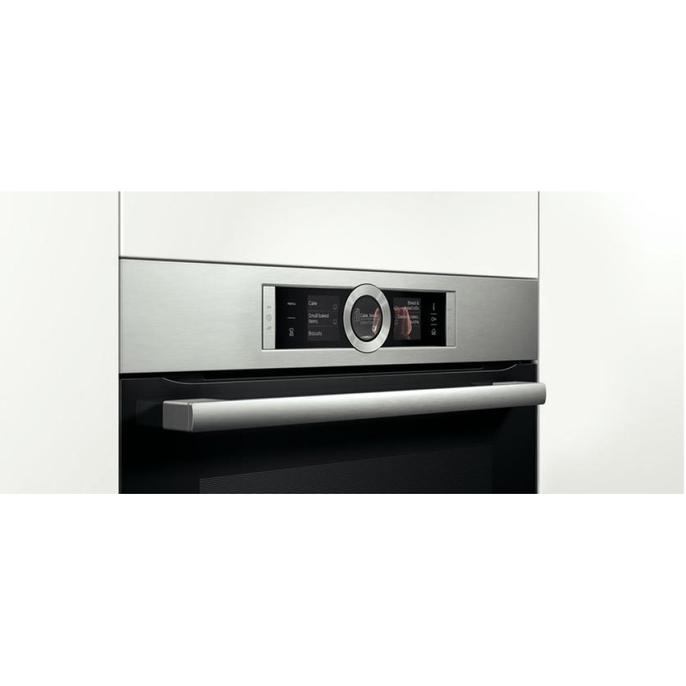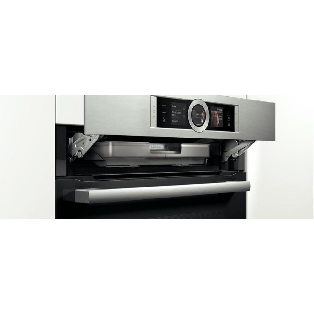Модель выполнена в одном стилевом решении с полноразмерной техникой, что позволяет создавать гармоничные линии и изысканные комбинации из встраиваемых приборов Bosch. Удобное анимационное меню Assist обеспечивает быстрый доступ к режимам и функциям, а также автоматически подбирает режим, оптимальную температуру и время приготовления для большого количества блюд. Самоочищающаяся панель EcoClean на задней стенке сокращает время и экономит силы на очистку камеры.