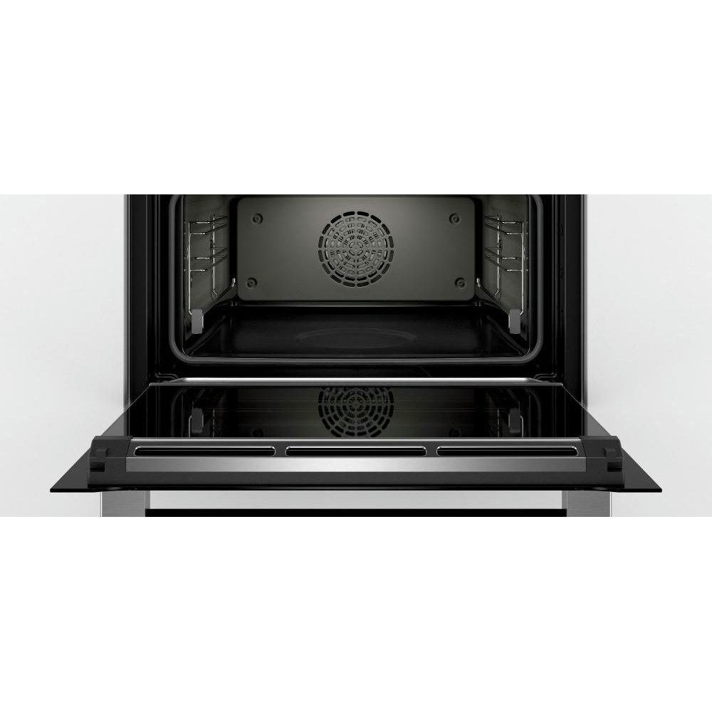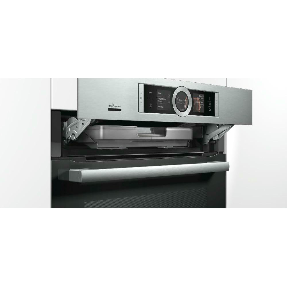 Компактный паровой духовой шкаф Bosch CSG656RS7 выполнен в цвете нержавеющей стали. Имеет 14 режимов нагрева, среди которых — гриль, конвекция, сушка и размораживание. На одном из трёх уровней установки противней предусмотрены телескопические направляющие со Stop-функцией и полным выдвижением. Дверца имеет три стекла и оснащена амортизатором SoftClose, который обеспечивает ей плавное закрытие. Наружное стекло нагревается не более чем до 40_С, что сводит к минимуму риск ожогов во время работы духового шкафа.