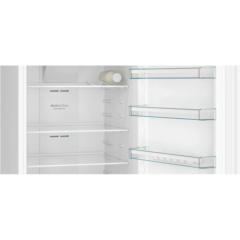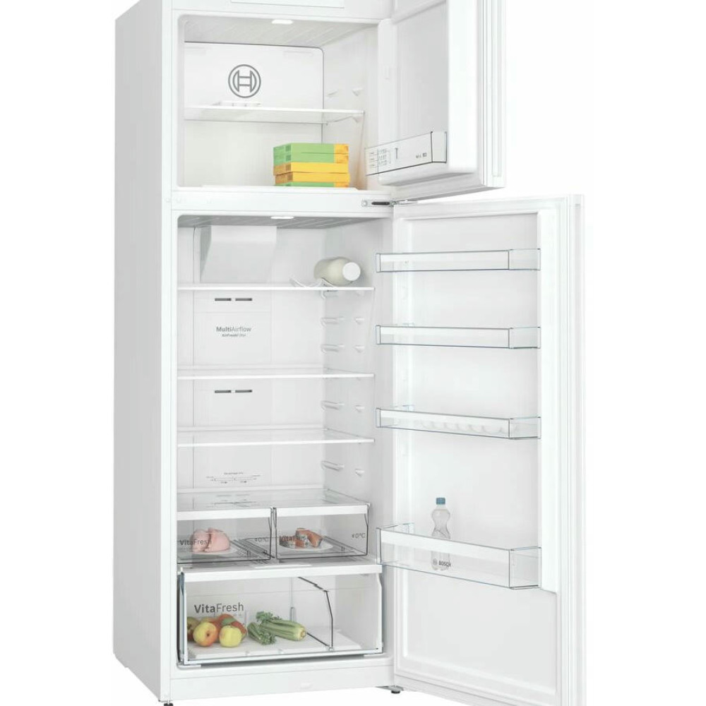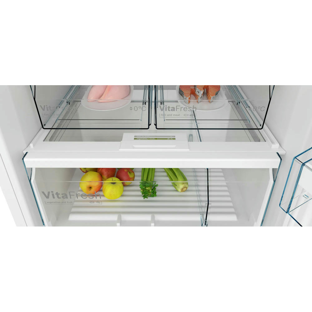Двухкамерный холодильник Bosch KDN56XW31U имеет систему SuperFreezing она нужна для восстановления баланса охлаждения после того, как вы положите свежие продукты. Датчики FreshSense их количество 6 постоянно контролируют температуру в морозильном и холодильном отделении. Контейнер VitaFresh позволят хранить свежие овощи фрукты дольше.