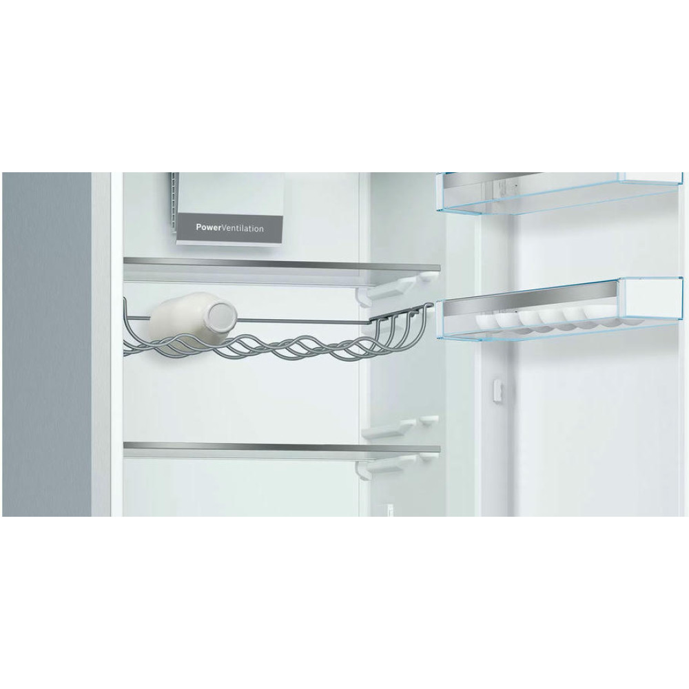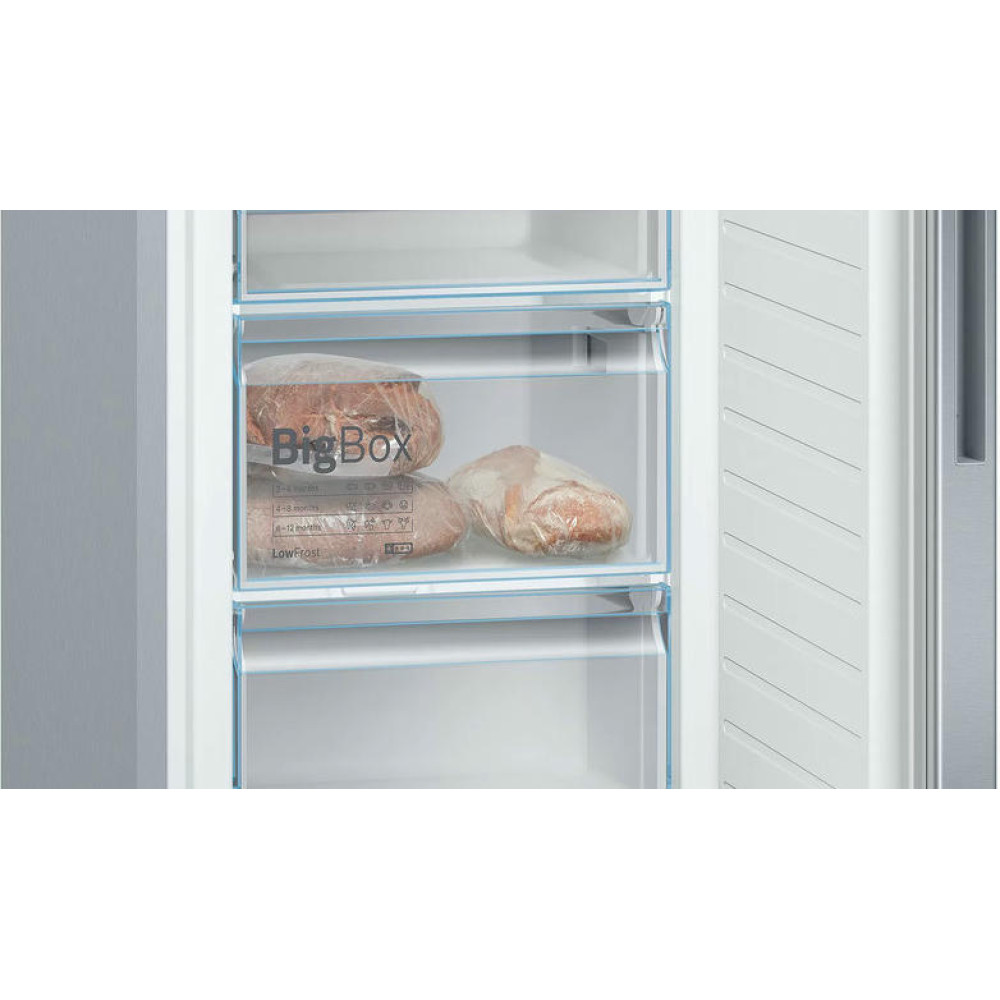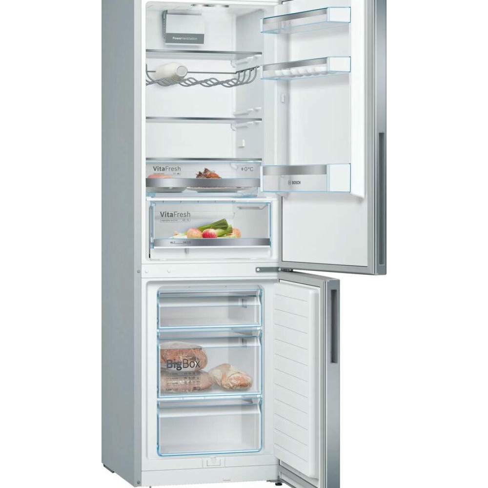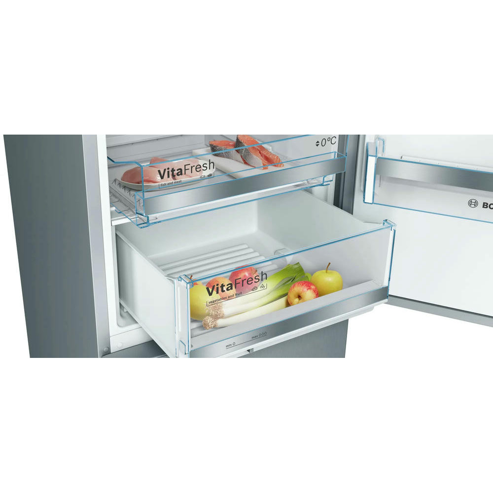 Двухкамерный холодильник Bosch KGE36ALCA оснащен технологией FreshSense ее датчики постоянно отслеживают температуру внешней среды и холодильника и уже от этих характеристик регулируют ее внутри устройства. Имеется полка Easy Access Shelf для быстрого доступа, вам нужно просто выдвинуть их холодильной камеры и достать продукты. Контейнер VitaFresh предназначен для хранения продуктов при 0°C температуре, например рыбы или мяса.