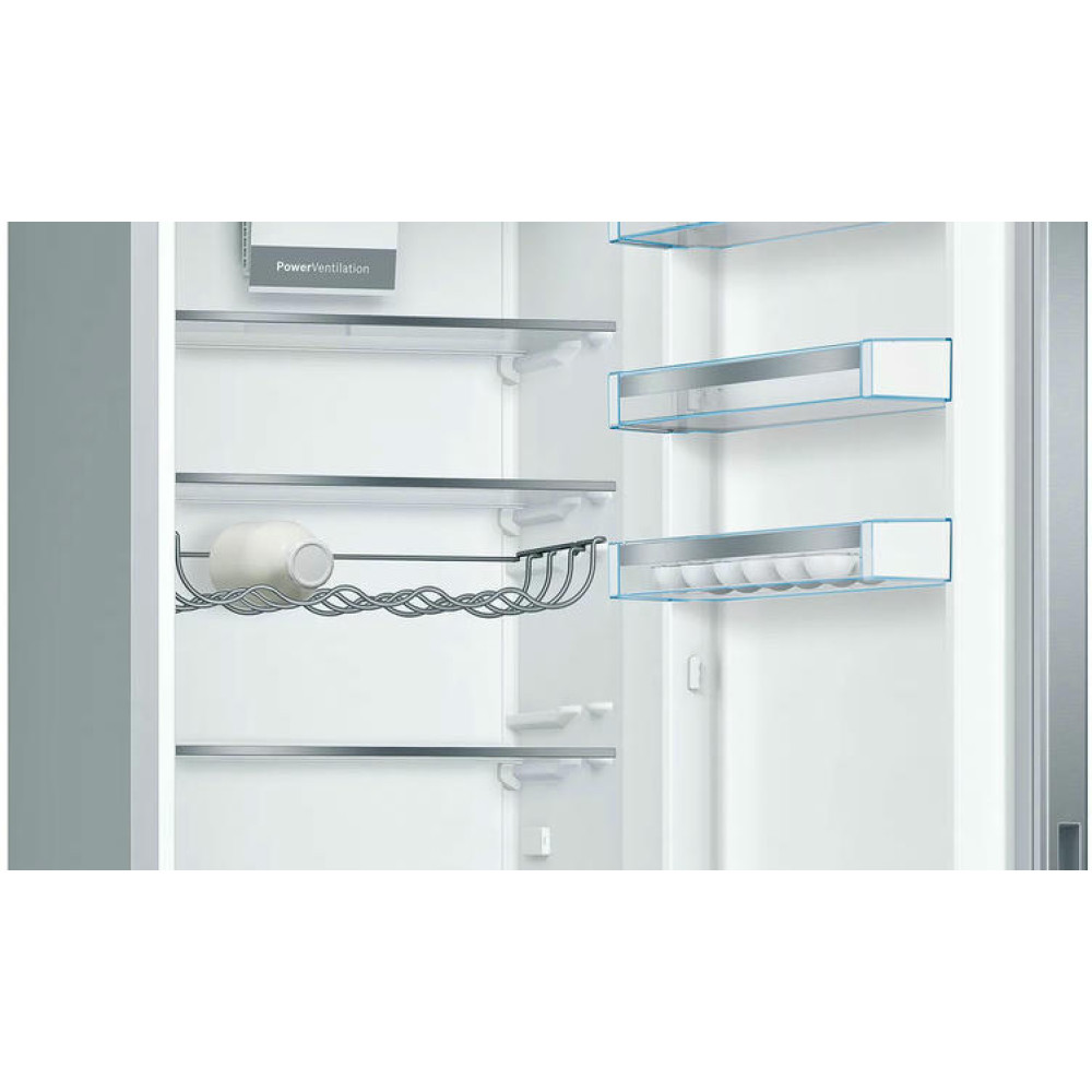 Этот отдельностоящий холодильник с морозильником, расположенным снизу, обладает общим полезным объемом 343 литра, что делает его идеальным для хранения большого количества продуктов. Полезный объем холодильной камеры составляет 249 литров, а морозильной камеры - 94 литра. Система охлаждения динамическая, а система размораживания - автоматическая, что значительно упрощает эксплуатацию устройства.