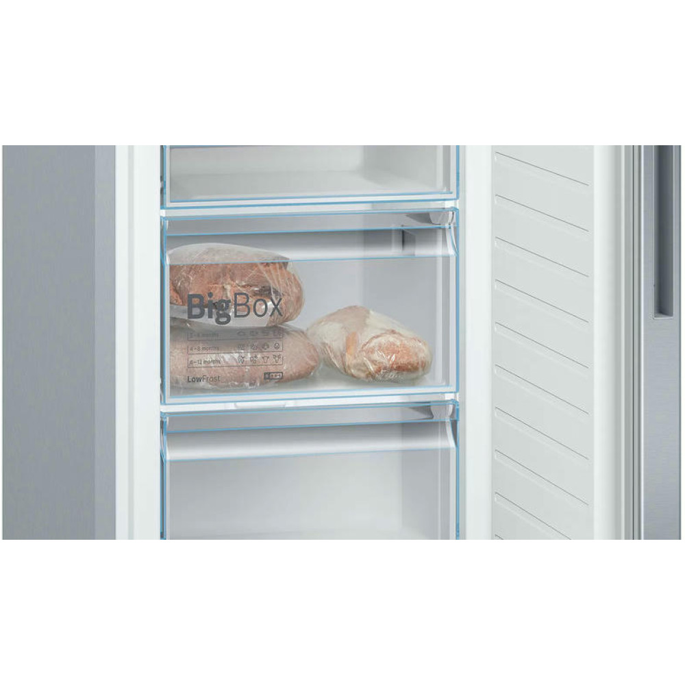 Морозильная камера оборудована системой охлаждения LowFrost и автоматической системой размораживания. Она имеет мощность замораживания 5,5 кг/24 ч и автономное сохранение холода в течение 18 часов. В ней предусмотрено три ящика, включая большой ящик BigBox для хранения крупногабаритных продуктов.