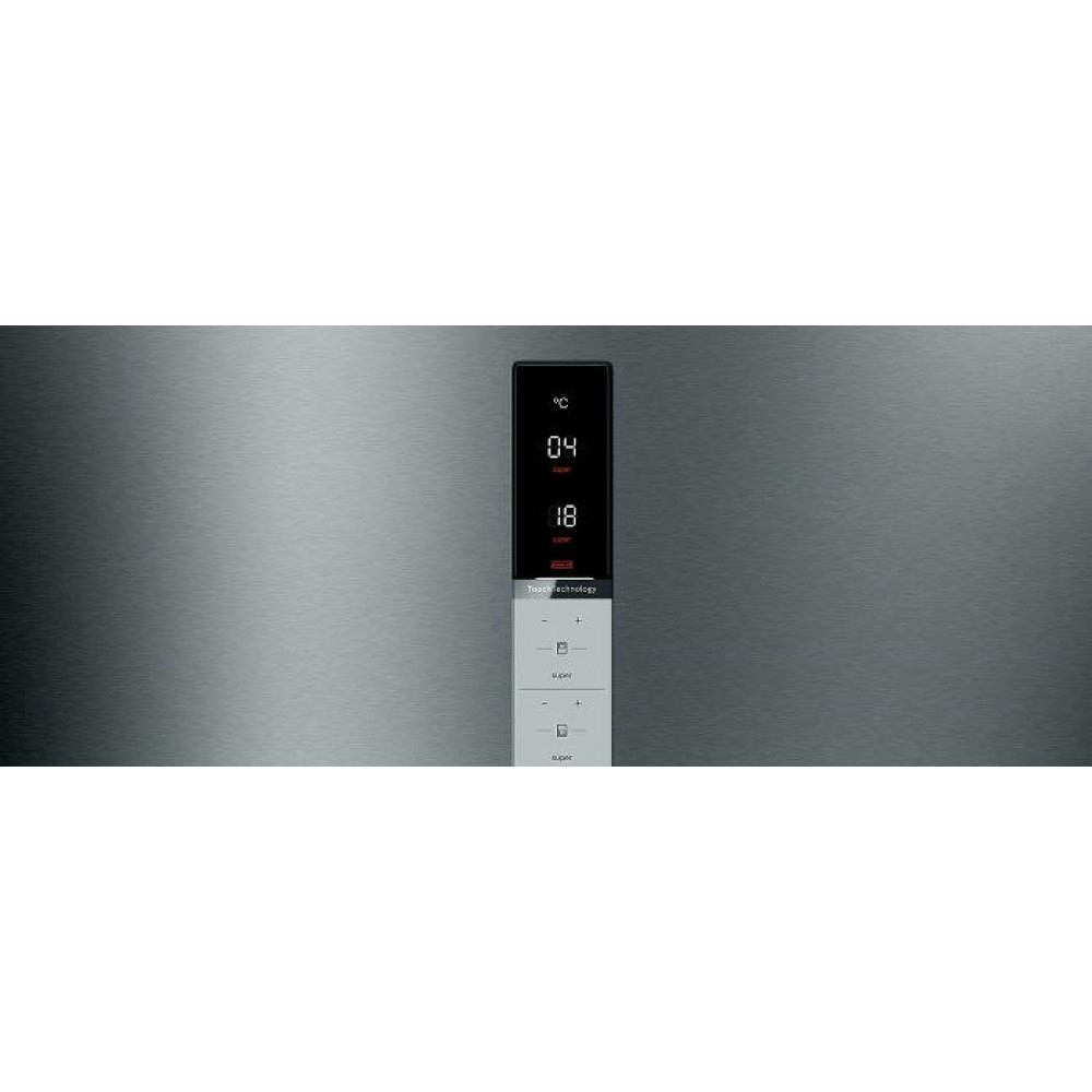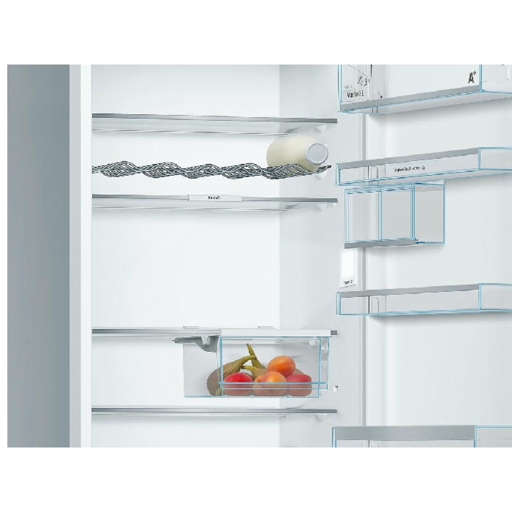 Холодильное отделение укомплектовано 5 полками из стекла, 4 из которых регулируются по высоте, хромированным подвесом для бутылок, зоной свежести и малым ящиком. Управление прибором осуществляется при помощи сенсорной системы TouchControl. Климатический класс модели — SN-T.