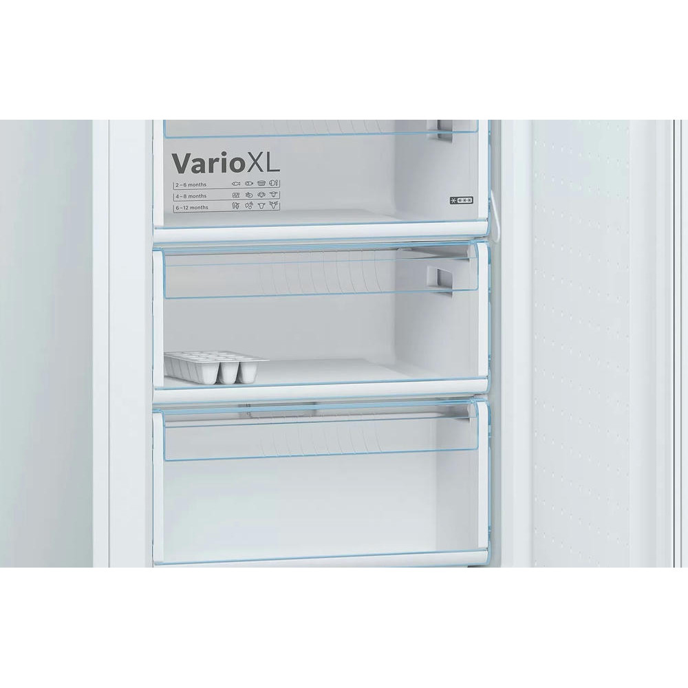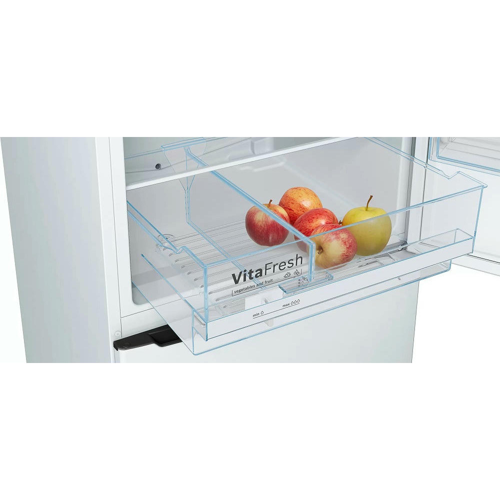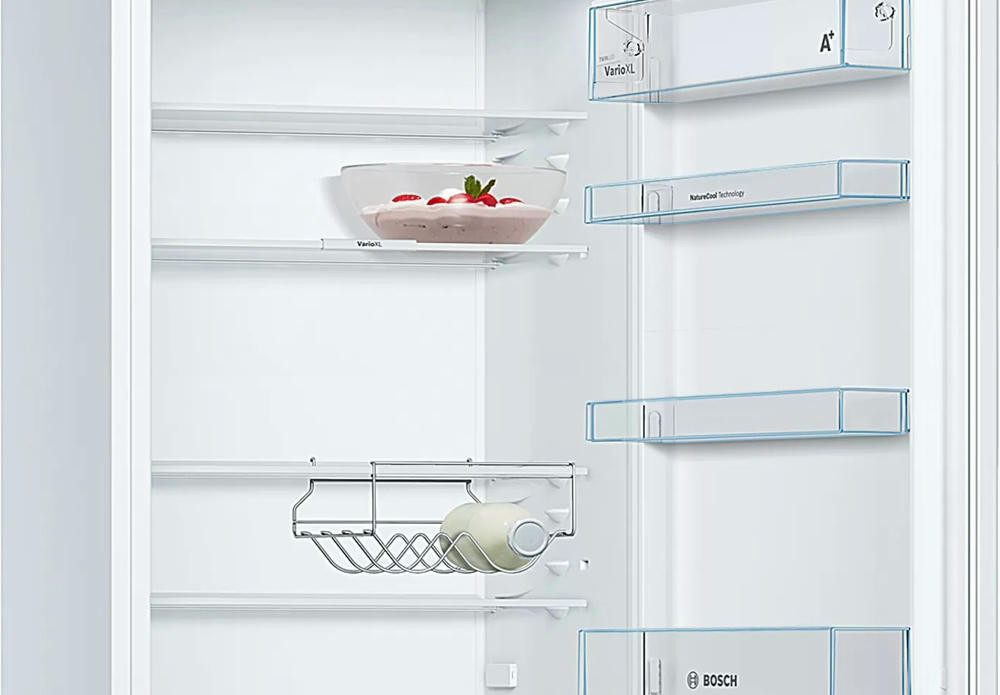 Холодильное отделение Бош KGE39XW21R с полезным объемом в 257 л оснащено полками из ударопрочного стекла, 1 из которых зафиксирована, а местоположение других можно менять на свое усмотрение.