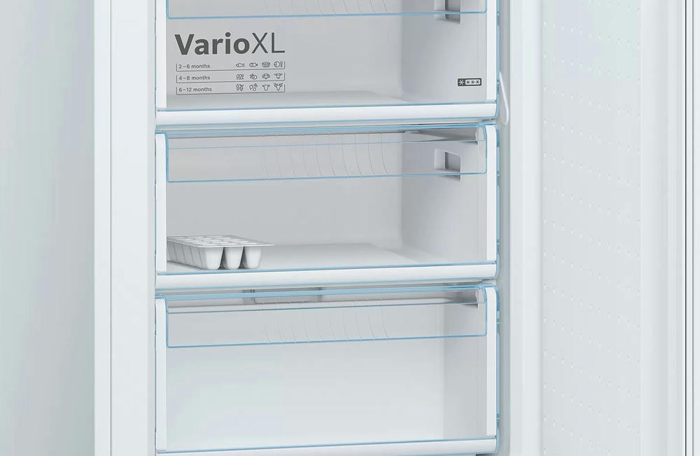 Морозильная камера имеет полезный объем в 94 л и расположена в нижней части прибора. Оснащена 3 прозрачными ящиками для хранения. В случае отключения электроэнергии продукты в морозилке могут храниться в течение 22 часов. Есть автоматический режим суперзамораживания.