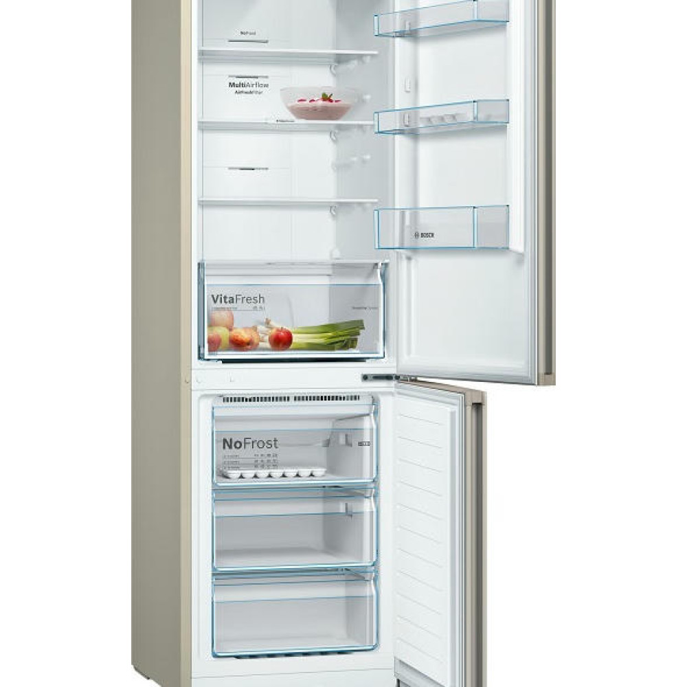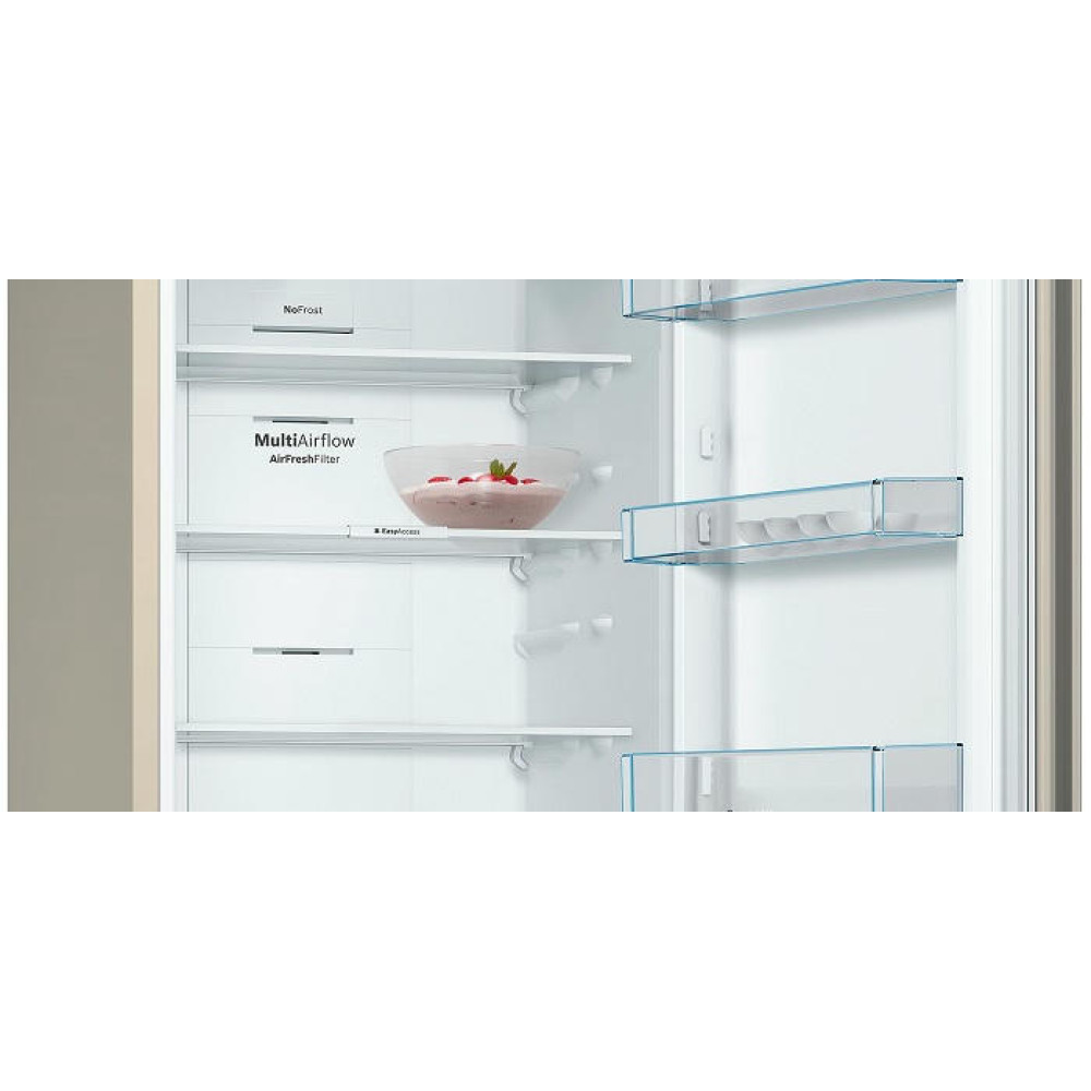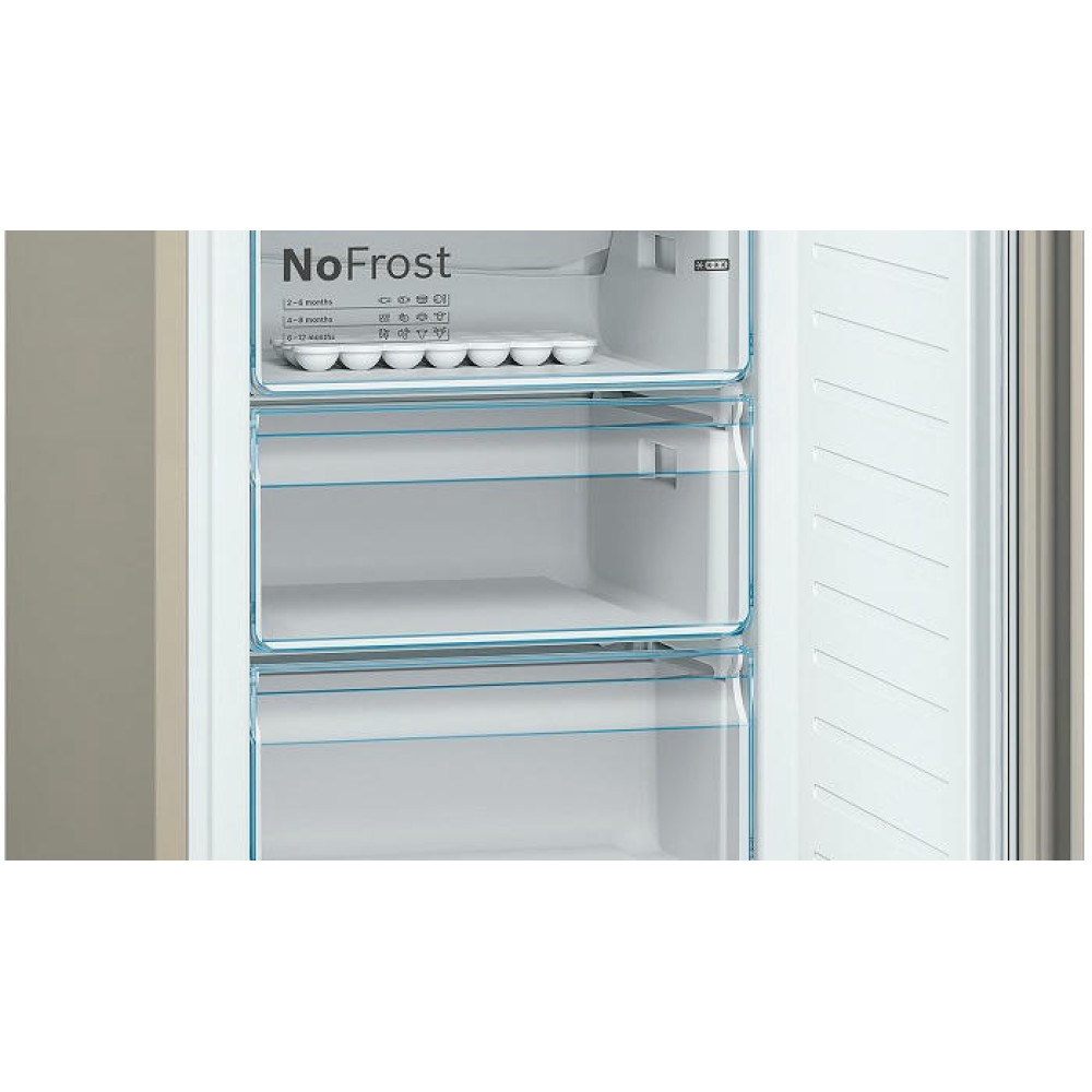 Двухкамерный холодильник Bosch KGN36NK21R из линейки Serie | 4 выполнен в бежевом цвете. Модель имеет 2 отделения, общий полезный объем составляет 324 л. Холодильная камера расположена сверху и имеет полезный объем 279 л, в то время как морозильник располагается снизу и имеет полезный объем 87 л. Габариты прибора оптимальны — 186x60x66 см (В х Ш х Г): можно установить плотно к стенам и мебели, избежав зазоров сзади и по бокам. Двери открываются на 90°, позволяя полностью выдвигать полки и ящики.