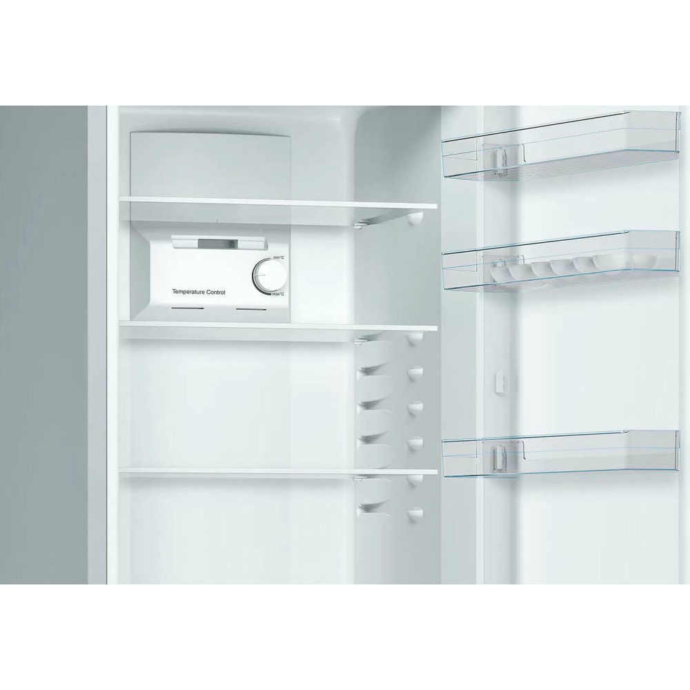 Двухкамерный холодильник Bosch KGN36NL30U имеет ящик MultiBox для овощей и фруктов с волнистым дном, который защищает от конденсации. Электронная регулировка температуры при помощи кнопок понятна и проста в использовании. Система MultiAirflow предполагает под собой постоянную циркуляцию воздуха на всех уровнях, что сохраняет свежесть продуктов надолго.