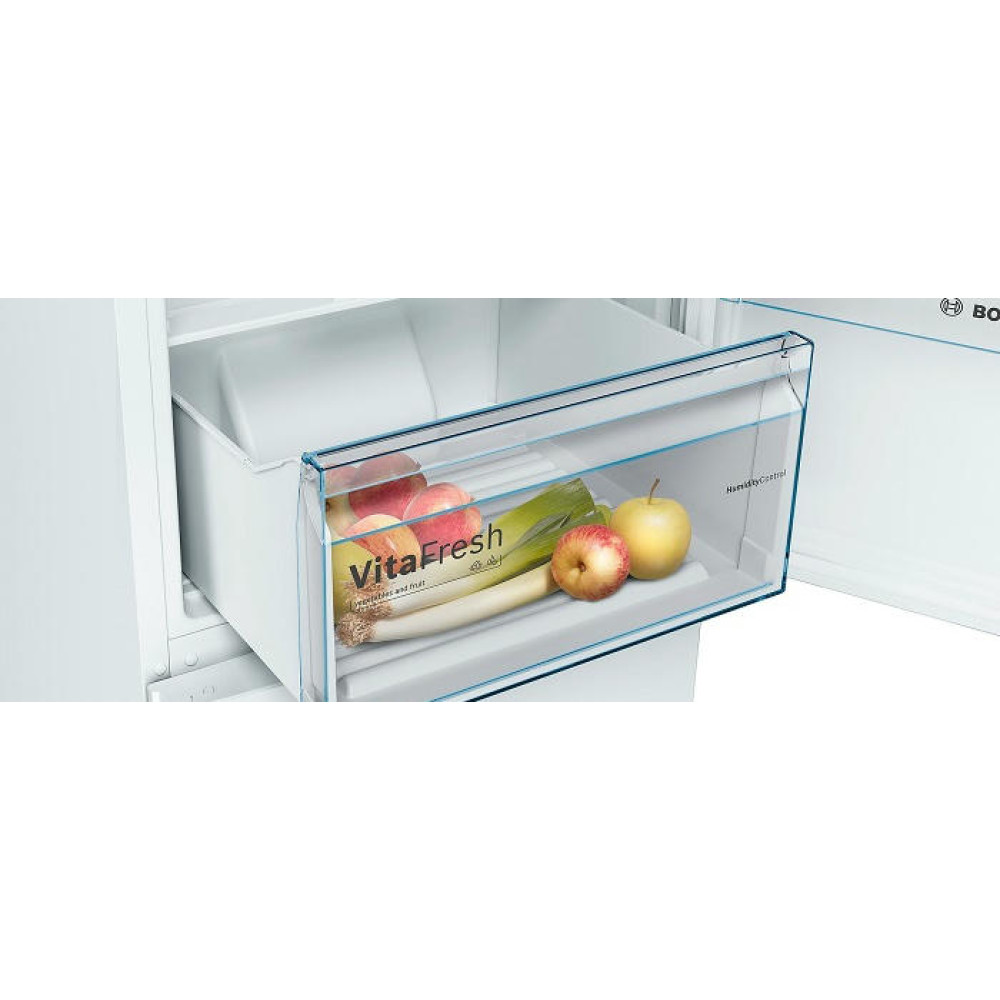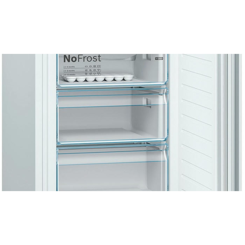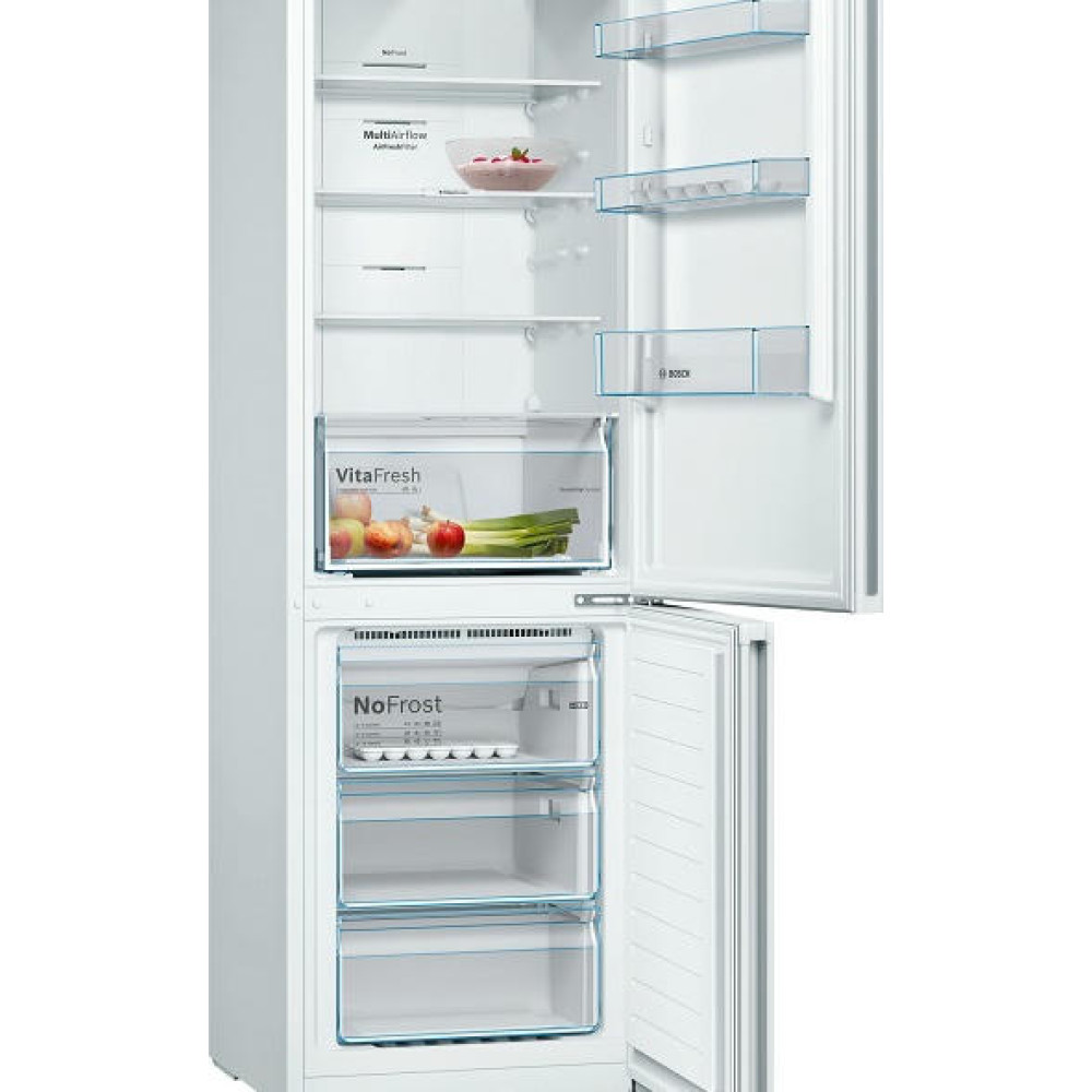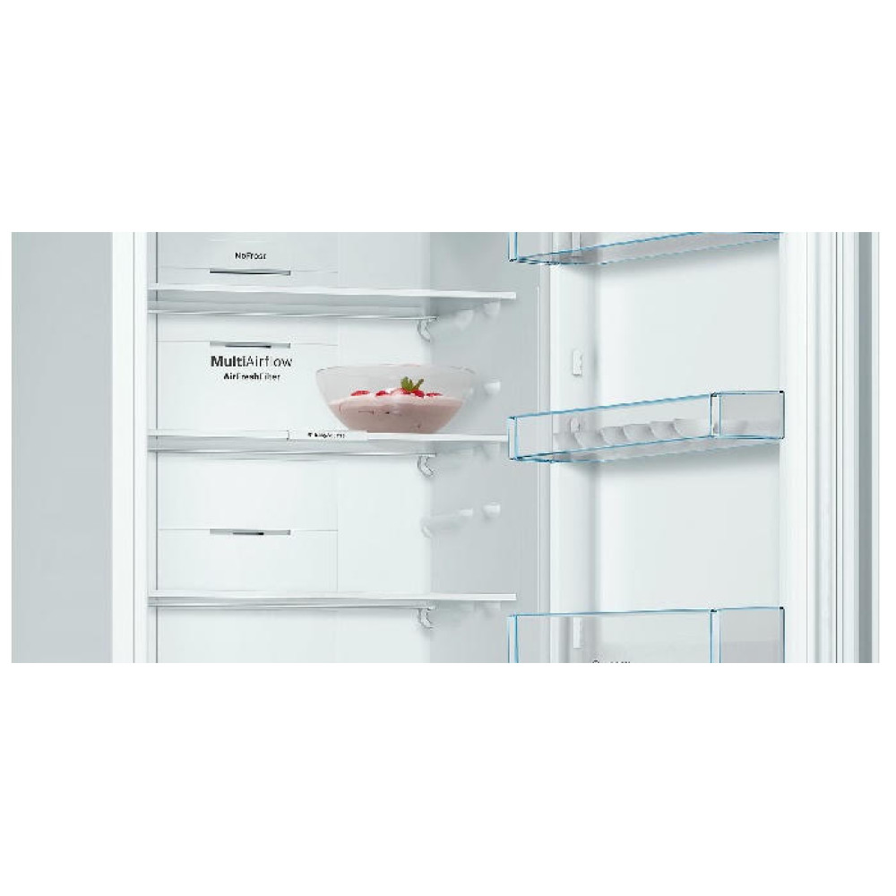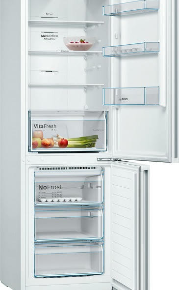 Двухкамерный холодильник Bosch KGN36NW21R — модель из линейки Serie | 4, выполненная в белом цвете. Модель имеет 2 отделения, общий полезный объем составляет 324 л. Холодильная камера расположена сверху и имеет полезный объем 279 л, в то время как морозильник располагается снизу и имеет полезный объем 87 л. Габариты прибора оптимальны — 186x60x66 см (В х Ш х Г): можно установить плотно к стенам и мебели, избежав зазоров сзади и по бокам. Двери открываются на 90°, позволяя полностью выдвигать полки и ящики.