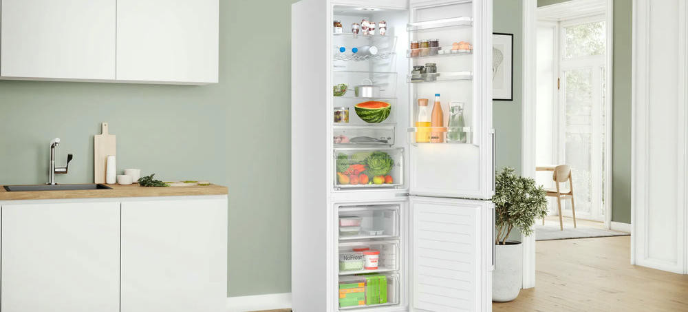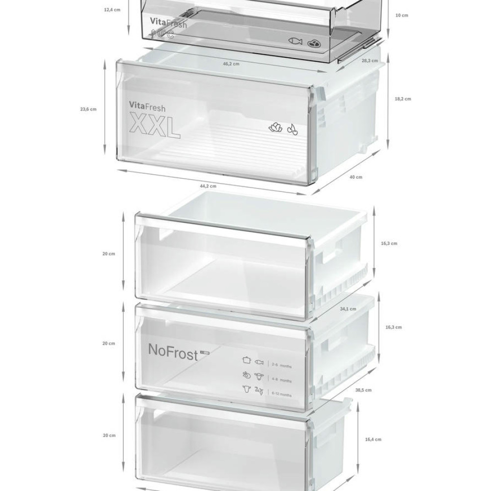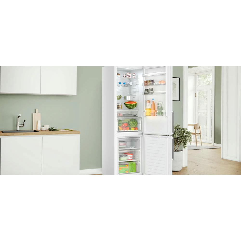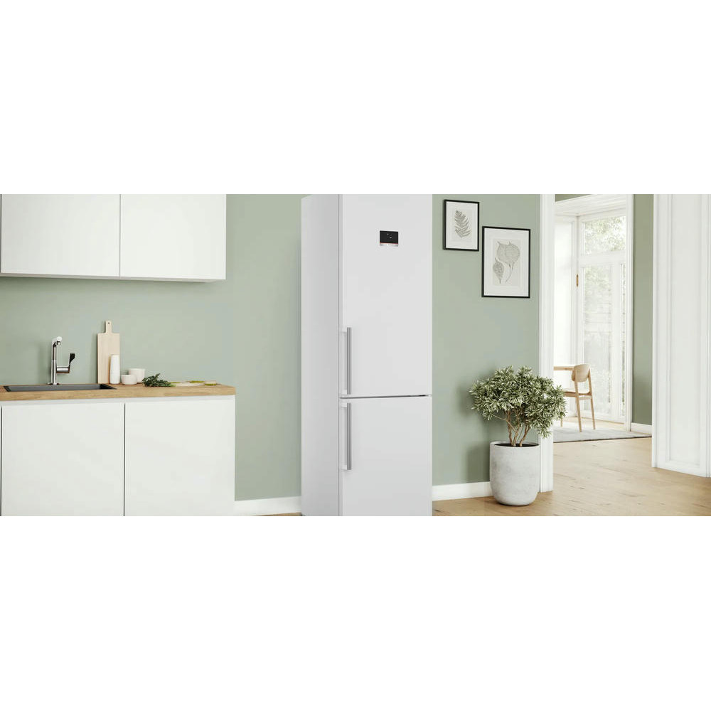 Двухкамерный холодильник Bosch KGN397WCT - это высокотехнологичное устройство, которое сочетает в себе функциональность, элегантный дизайн и надежность. Общий полезный объем 363 литра, что делает его идеальным выбором для больших семей. Электронное управление с сенсорными элементами и дисплеем делает использование холодильника удобным и простым. Также он оснащен функцией Home Connect, которая позволяет управлять устройством дистанционно с помощью смартфона или планшета. Система охлаждения No Frost обеспечивает равномерное распределение холода внутри холодильника, предотвращая образование льда и инея. Автоматическая система размораживания упрощает обслуживание и эксплуатацию. Система MultiAirflow обеспечивает оптимальное распределение температуры, сохраняя продукты свежими дольше.