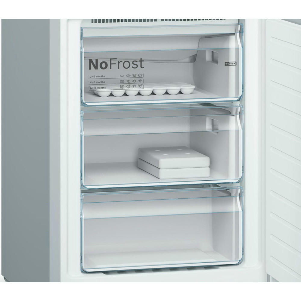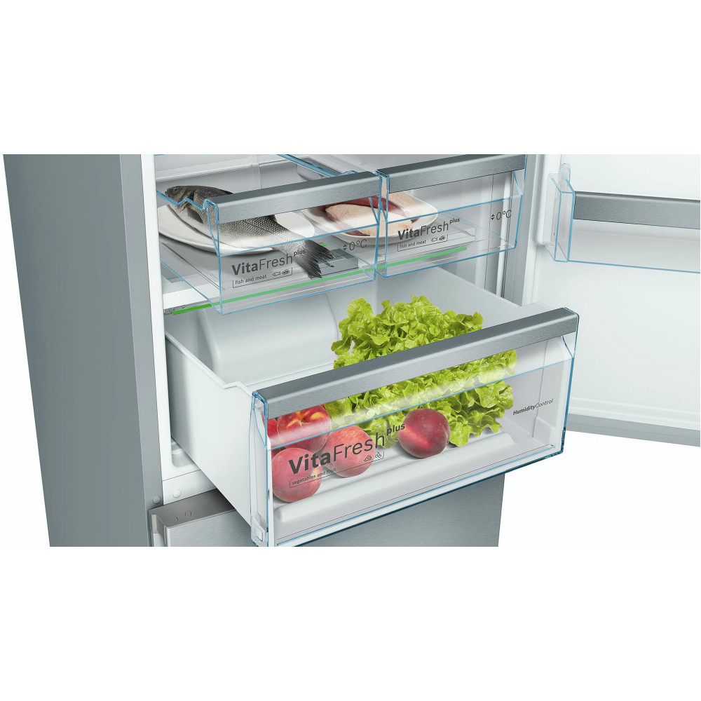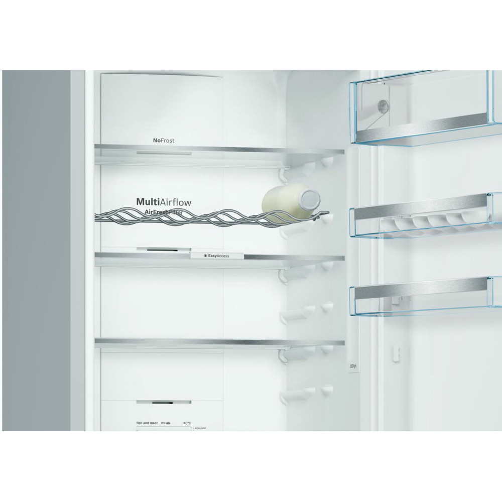 Двухкамерный холодильник Bosch KGN39AI3AR — мощный функциональный прибор с системой охлаждения NoFrost и зоной свежести VitaFresh plus. Ящики для мяса и рыбы в зоне свежести можно убрать, чтобы поставить на их место большие блюда или бутылки.