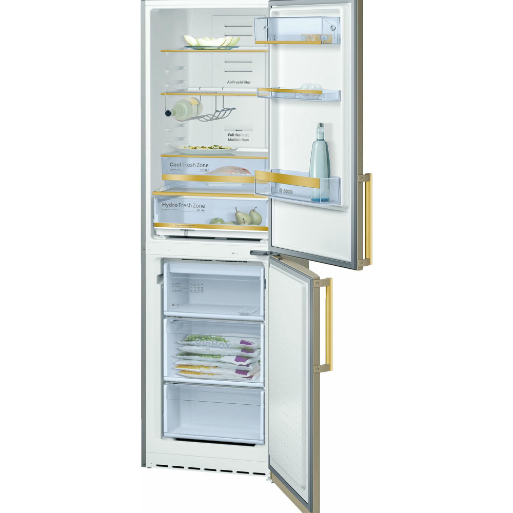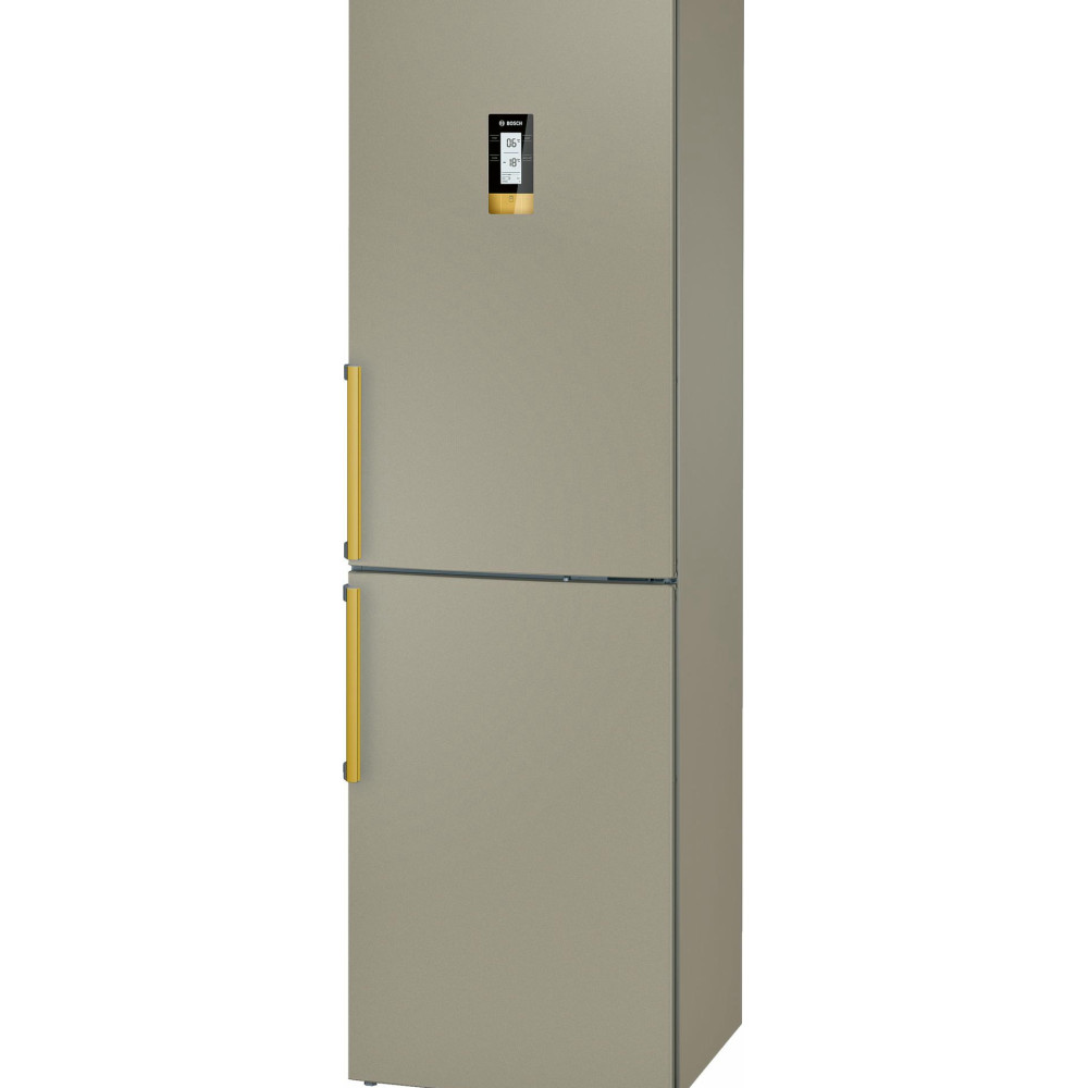 Необычный глубокий карамельный цвет холодильника Bosch KGN39AK18R сразу же выделяет его из ряда других бытовых приборов. Вертикальные накладные ручки с золотистым напылением выгодно контрастируют с корпусом. Вставкой из такого же металла декорирован электронный дисплей на верхней дверце.