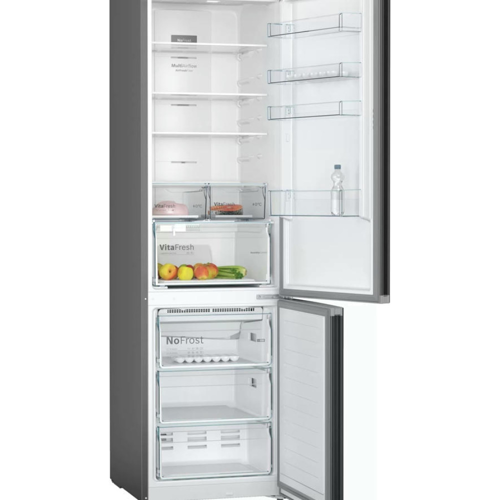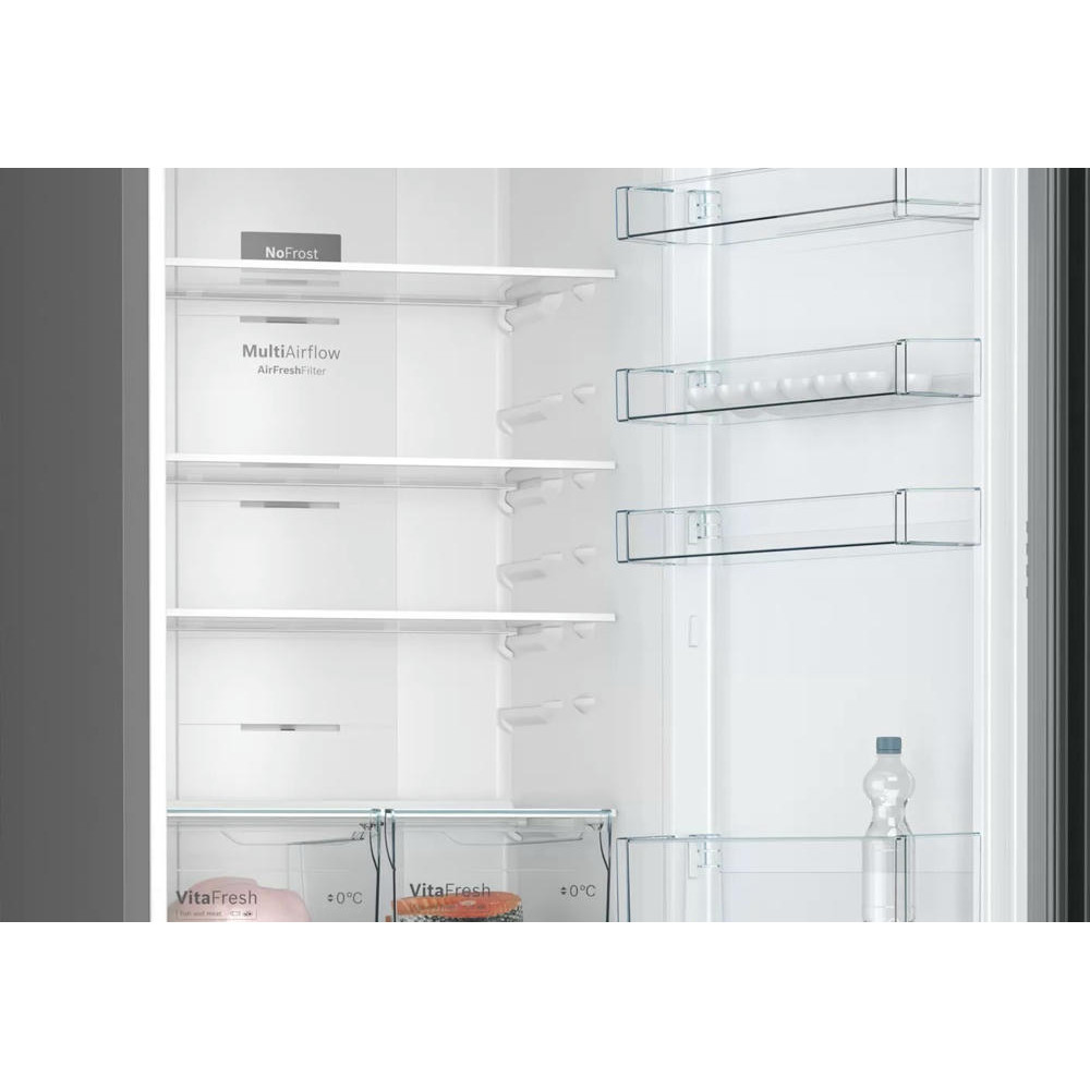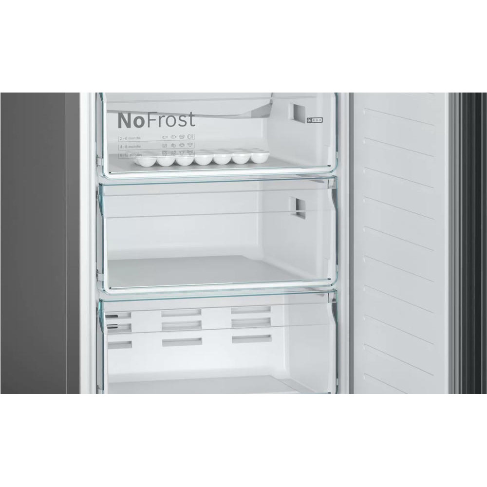 Двухкамерный холодильник Bosch KGN39UC27R выполнен в строгом сером цвете и обладает большой вместимостью при стандартных габаритах. EasyAccess — это система крепления полок из закаленного ударопрочного стекла, которые плавно выдвигаются даже при полной загрузке, чтобы можно было с легкостью достать продукты даже из самого дальнего уголка холодильника.