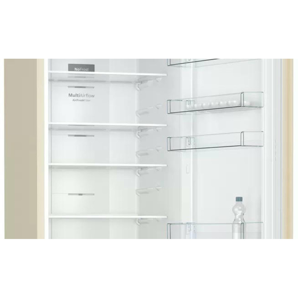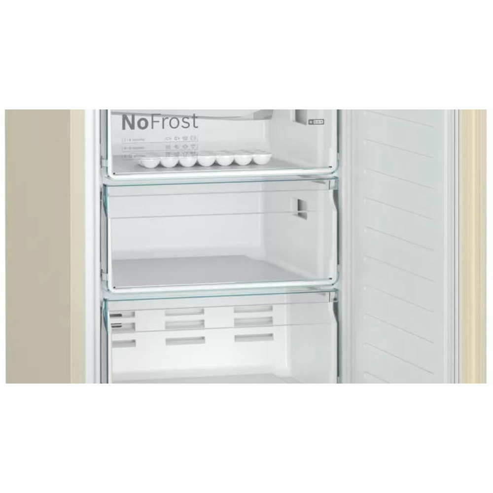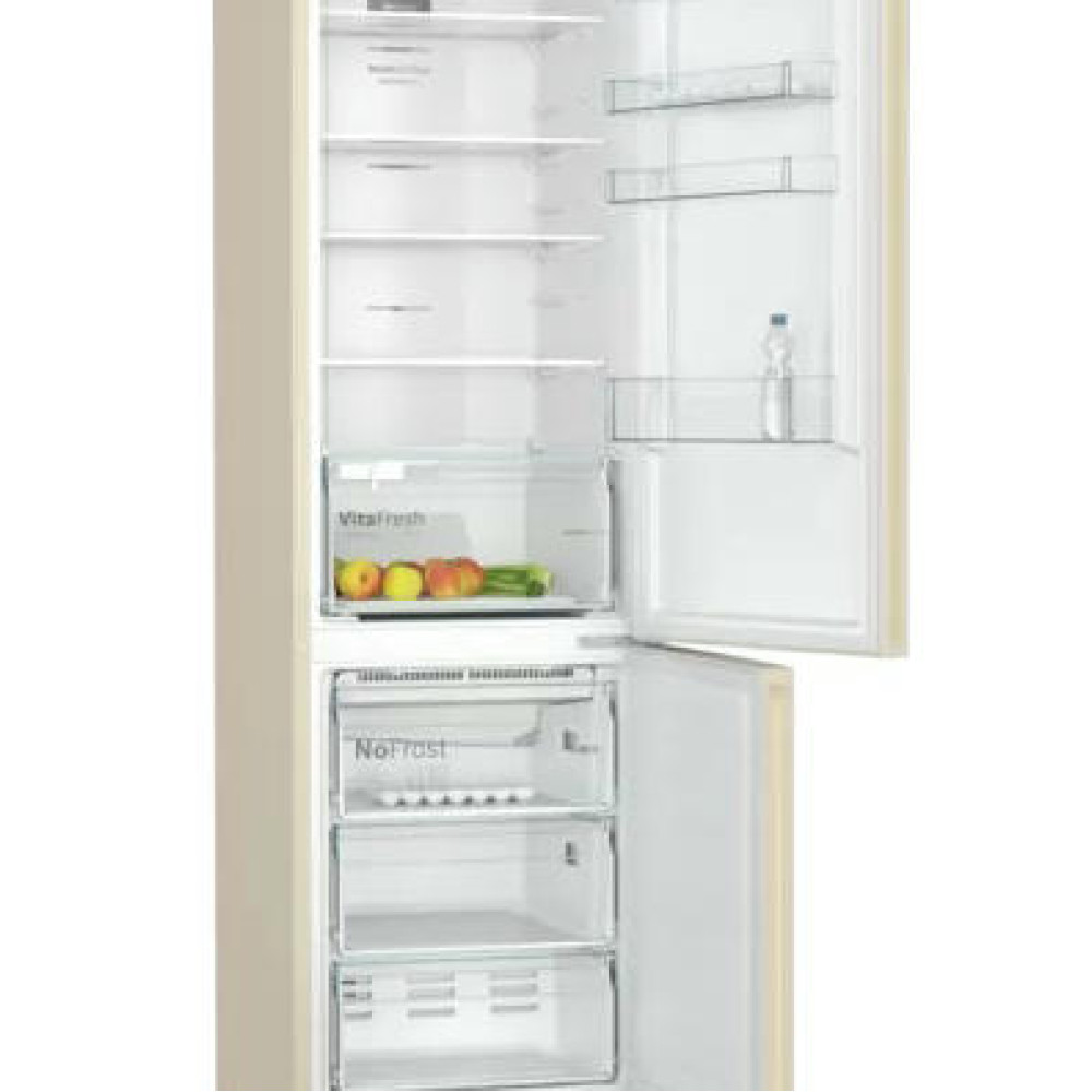 Двухкамерный холодильник BOSH KGN39UK25R выполнен в тёплом, бежевом цвете по системе, которая позволяет встроить его с зазором до миллиметра. Конструкция PerfectFit допускает установить прибор с минимальным отступом сзади и по бокам в 1 мм. При этом дверки открываются на 90 градусов и не мешают извлечению ящиков.