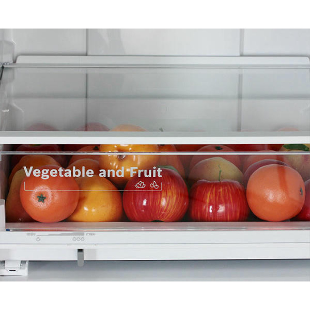 Ящик для овощей и фруктов с волнистым дном защищает продукты от конденсата. Многопоточная система охлаждения равномерно распределяет потоки холодного воздуха по всей холодильной камерой.