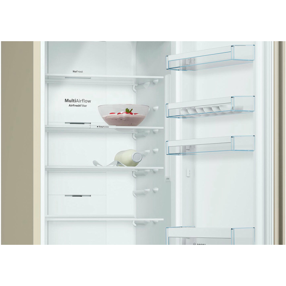 Дополнительные аксессуары Бош KGN39VK21R оптимизируют размещение продуктов внутри каждой камеры. Выдвижные полки EasyAccess сделаны из прочного стекла, устойчивого к ударам и резким перепадам температур. Прозрачные контейнеры в зоне свежести и морозильнике облегчают загрузку и выгрузку покупок и обеспечивают максимальный обзор.