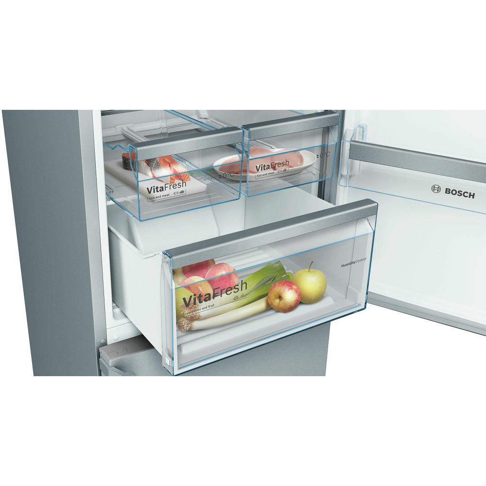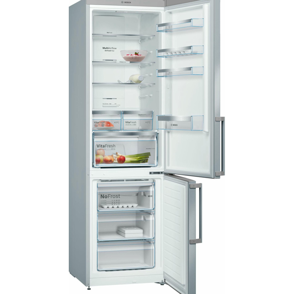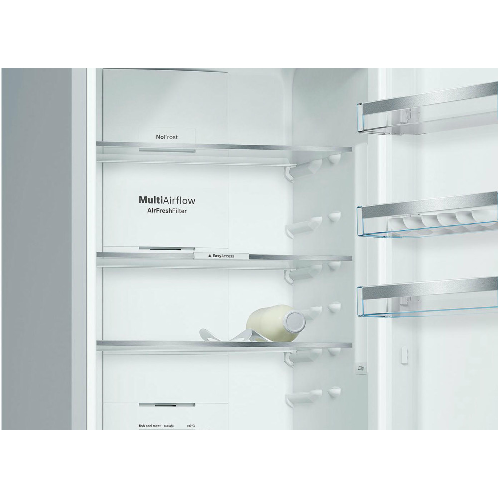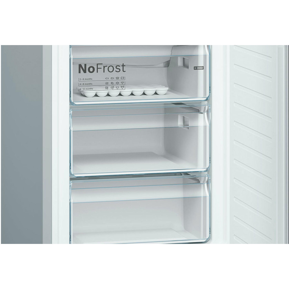 Двухкамерный холодильник KGN39XW3OR одель относится к числу приборов с одним из самых больших холодильных отделений 279 л. Система NoFrost не требует разморозки. Для длительного хранения свежих овощей предусмотрен большой ящик VitaFresh, для рыбы и мяса предназначены два малых контейнера с поддержанием нулевой температуры.