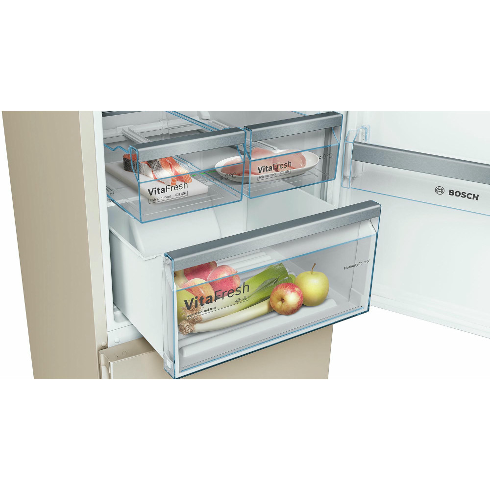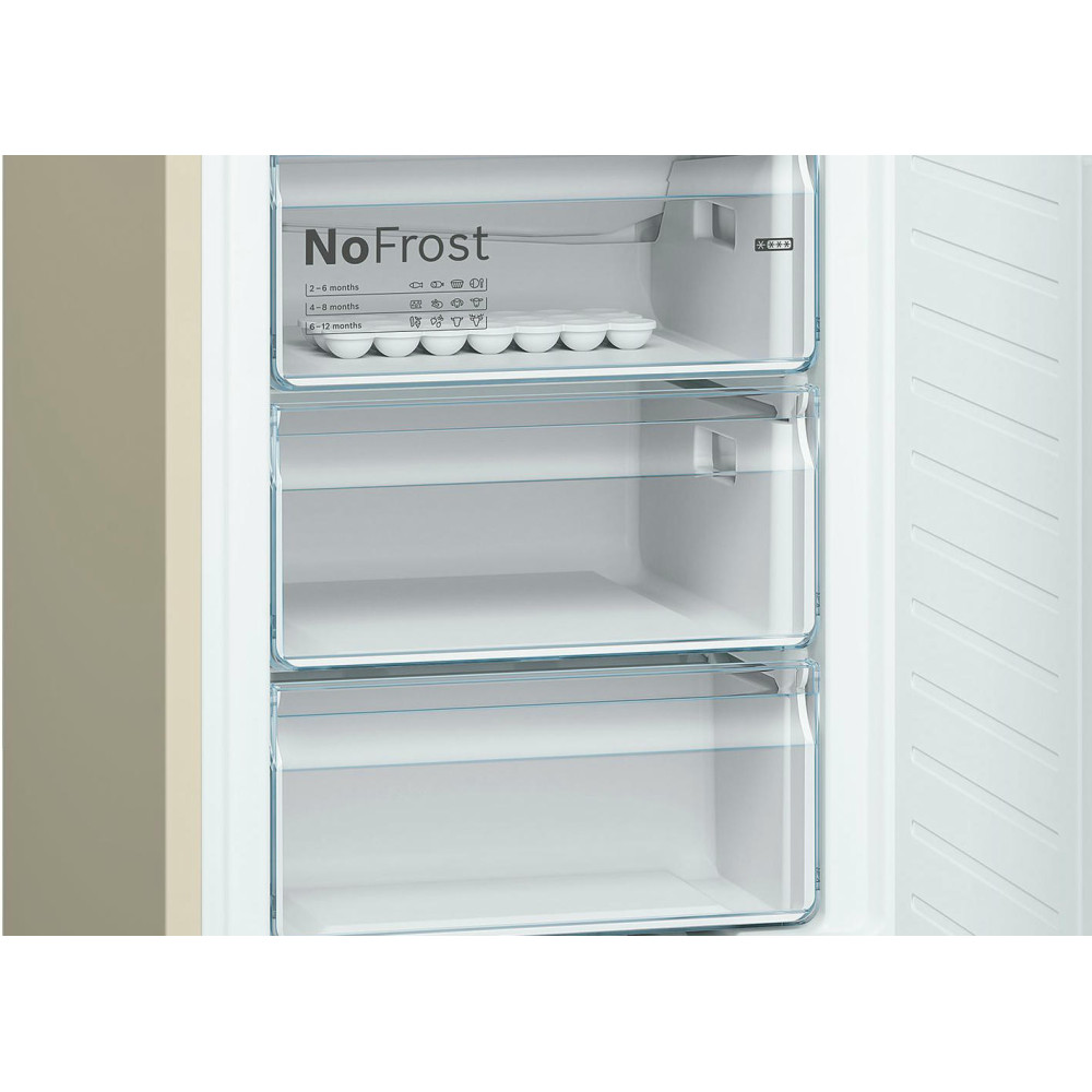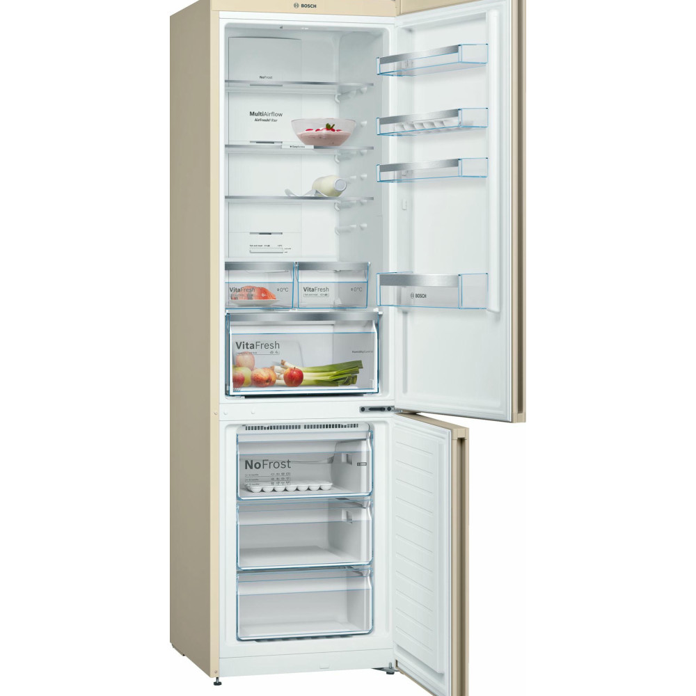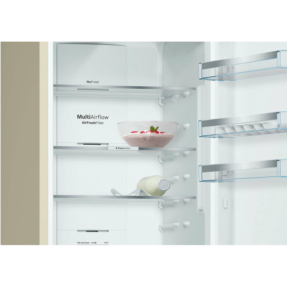 Антибактериальный угольный фильтр, установленный в Бош KGN39XK3AR, не позволяет запахам смешиваться и застаиваться. Таким образом, в холодильнике не возникает затхлость, и не размножаются бактерии. К достоинствам данной модели также относятся низкий уровень шума и класс энергоэффективности А++ .