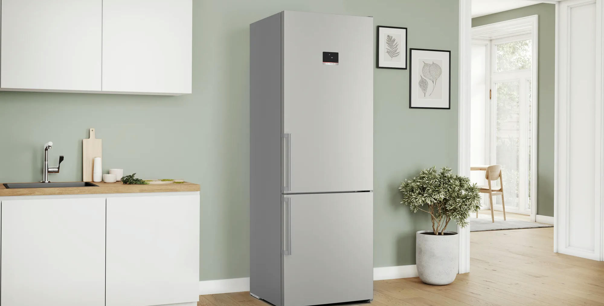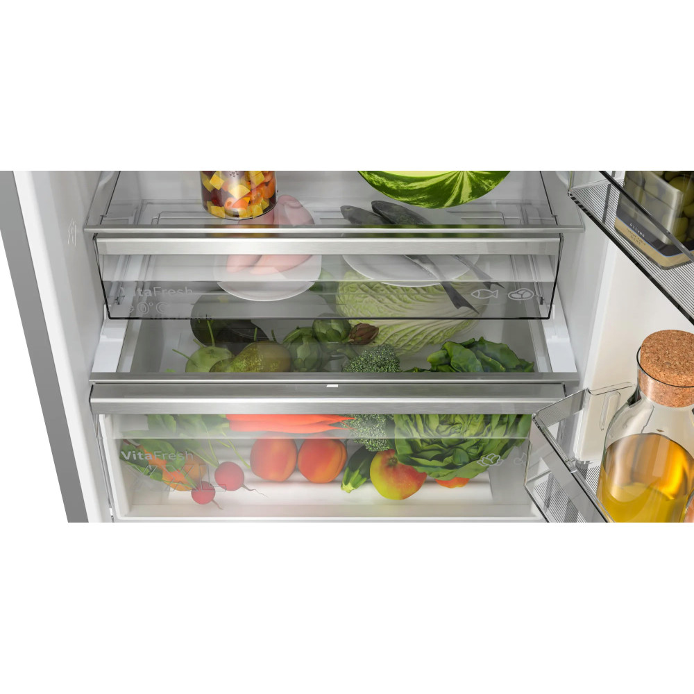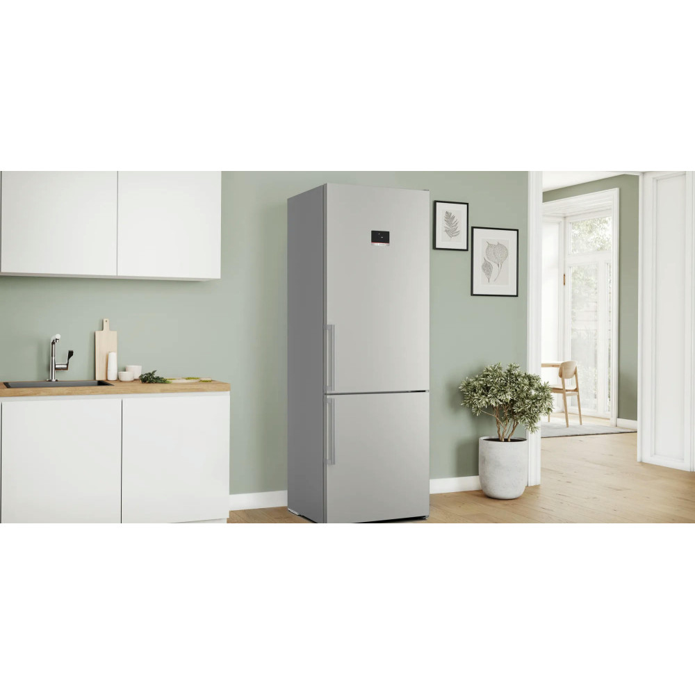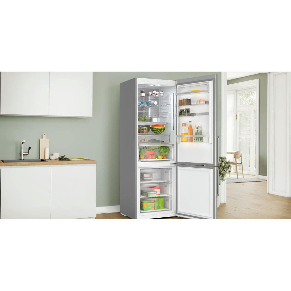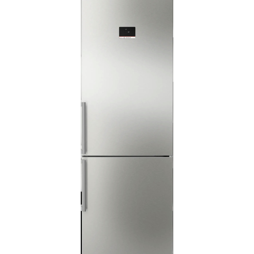Двухкамерный холодильник Bosch KGN49AIBT — это превосходный выбор для тех, кто ценит качество, надежность и функциональность. Произведенный в Евросоюзе, он обеспечивает высокий уровень производительности и долговечность, подтвержденную гарантией на 12 месяцев. Стильный и современный дизайн холодильника выполнен в цвете нержавеющей стали, что делает его идеальным дополнением к любому интерьеру. Особенностью является обработка против отпечатков пальцев, благодаря которой поверхность всегда остается чистой и аккуратной. Управление холодильником осуществляется при помощи сенсорных элементов и электронного дисплея, что обеспечивает удобство и простоту использования. Система охлаждения No Frost и автоматическое размораживание обеспечивают оптимальные условия для сохранения свежести продуктов. С общим полезным объемом в 440 литров, в том числе 311 литров в холодильной камере и 129 литров в морозильной, этот холодильник предоставляет достаточно места для хранения большого количества продуктов. Внутри холодильника есть 5 полок, из которых 3 регулируемые и 2 фиксированные, а также специальная полка для бутылок и 4 полки на дверце. Все полки изготовлены из высокопрочного стекла, что обеспечивает их долговечность и надежность. Особое внимание заслуживает зона свежести VitaFresh, которая создает идеальные условия для хранения овощей, фруктов и мясных продуктов. В морозильной камере предусмотрены 3 ящика для замороженных продуктов и функция суперзамораживание SuperFreezing, позволяющая быстро заморозить большое количество продуктов.