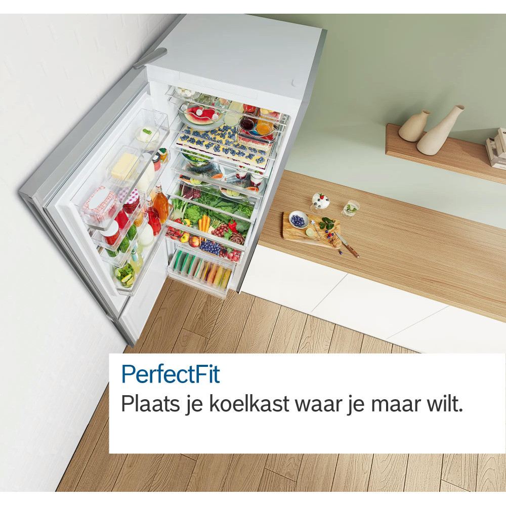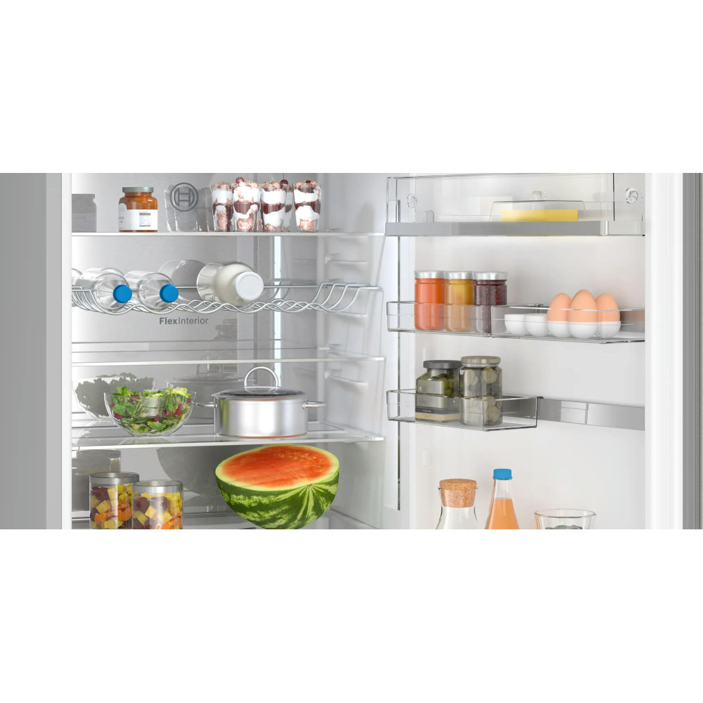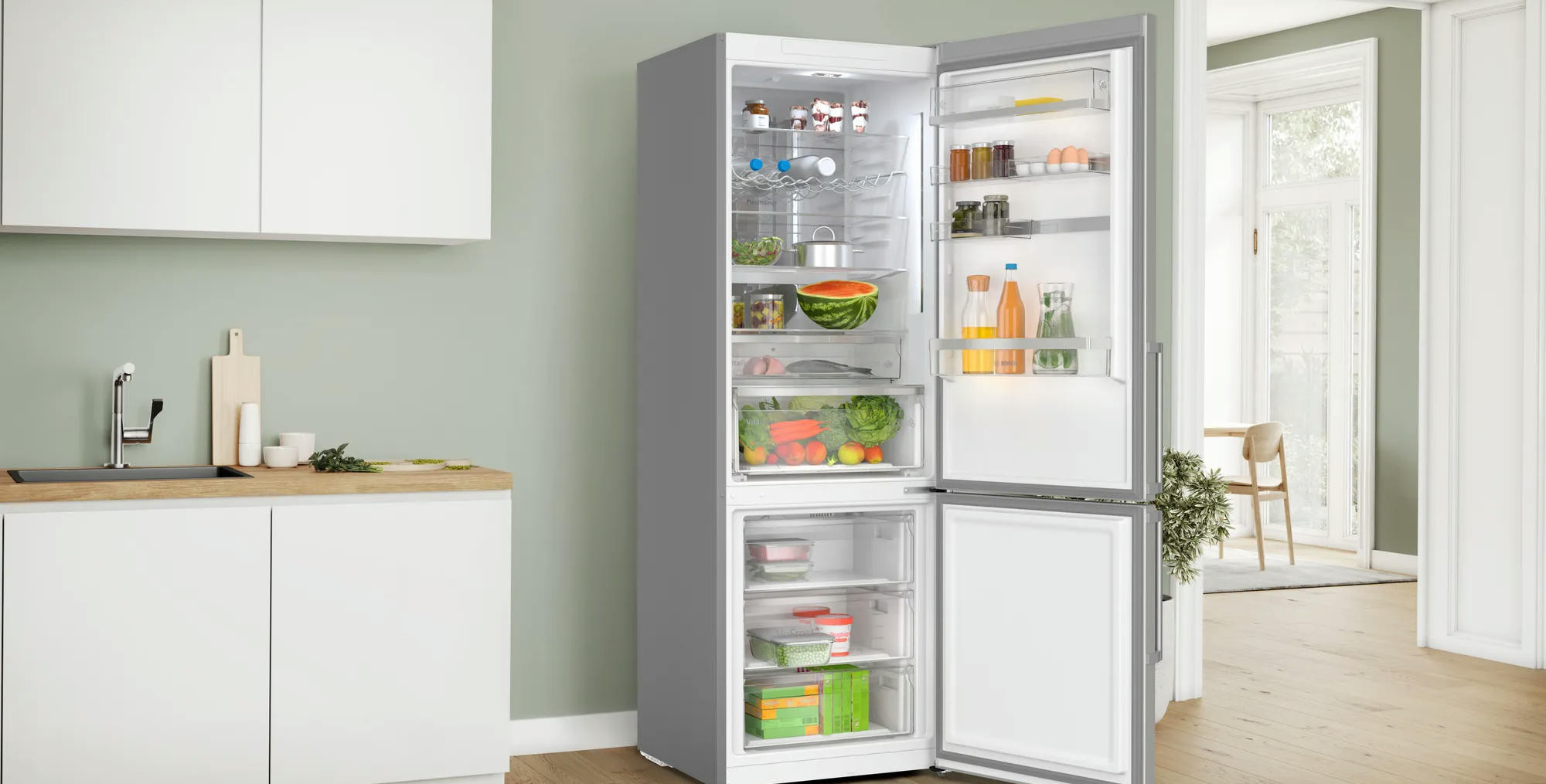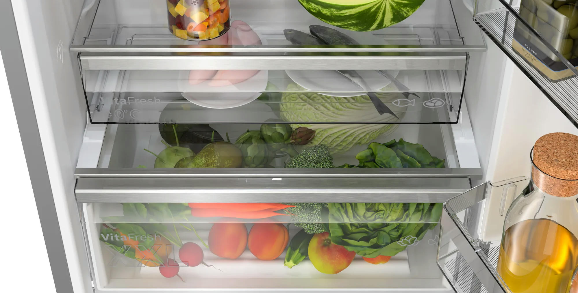Двухкамерный холодильник Bosch KGN49AIBT — это превосходный выбор для тех, кто ценит качество, надежность и функциональность. Произведенный в Евросоюзе, он обеспечивает высокий уровень производительности и долговечность, подтвержденную гарантией на 12 месяцев. Стильный и современный дизайн холодильника выполнен в цвете нержавеющей стали, что делает его идеальным дополнением к любому интерьеру. Особенностью является обработка против отпечатков пальцев, благодаря которой поверхность всегда остается чистой и аккуратной. Управление холодильником осуществляется при помощи сенсорных элементов и электронного дисплея, что обеспечивает удобство и простоту использования. Система охлаждения No Frost и автоматическое размораживание обеспечивают оптимальные условия для сохранения свежести продуктов. С общим полезным объемом в 440 литров, в том числе 311 литров в холодильной камере и 129 литров в морозильной, этот холодильник предоставляет достаточно места для хранения большого количества продуктов. Внутри холодильника есть 5 полок, из которых 3 регулируемые и 2 фиксированные, а также специальная полка для бутылок и 4 полки на дверце. Все полки изготовлены из высокопрочного стекла, что обеспечивает их долговечность и надежность. Особое внимание заслуживает зона свежести VitaFresh, которая создает идеальные условия для хранения овощей, фруктов и мясных продуктов. В морозильной камере предусмотрены 3 ящика для замороженных продуктов и функция суперзамораживание SuperFreezing, позволяющая быстро заморозить большое количество продуктов.