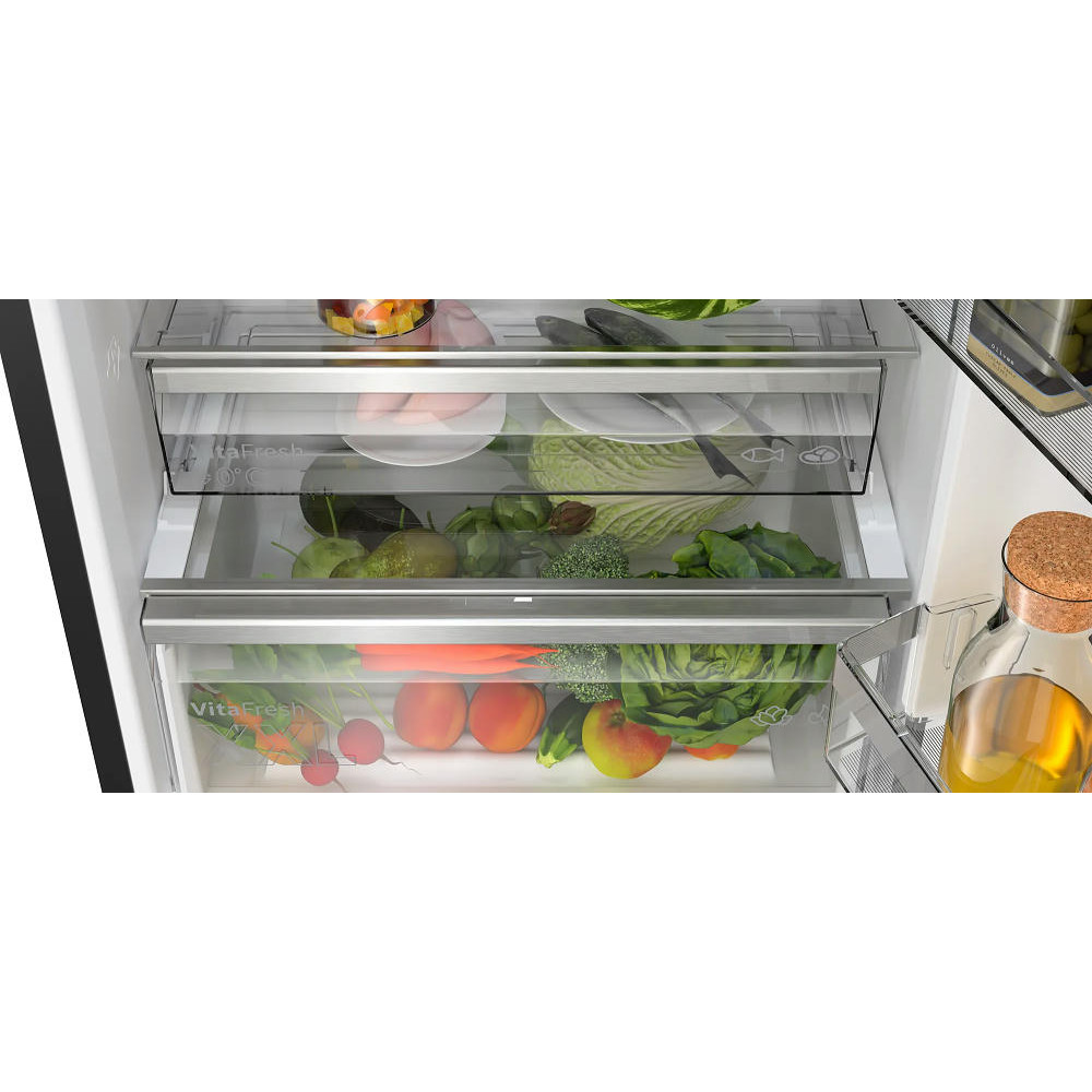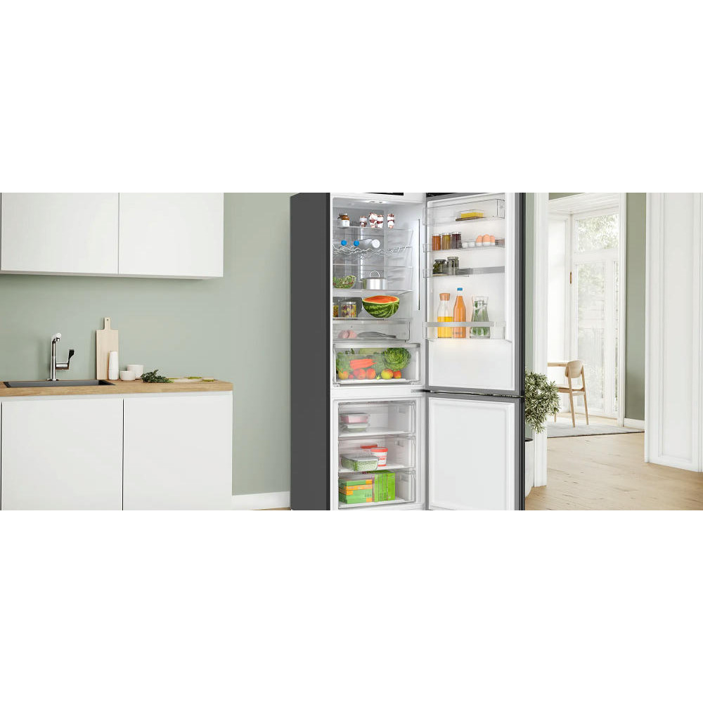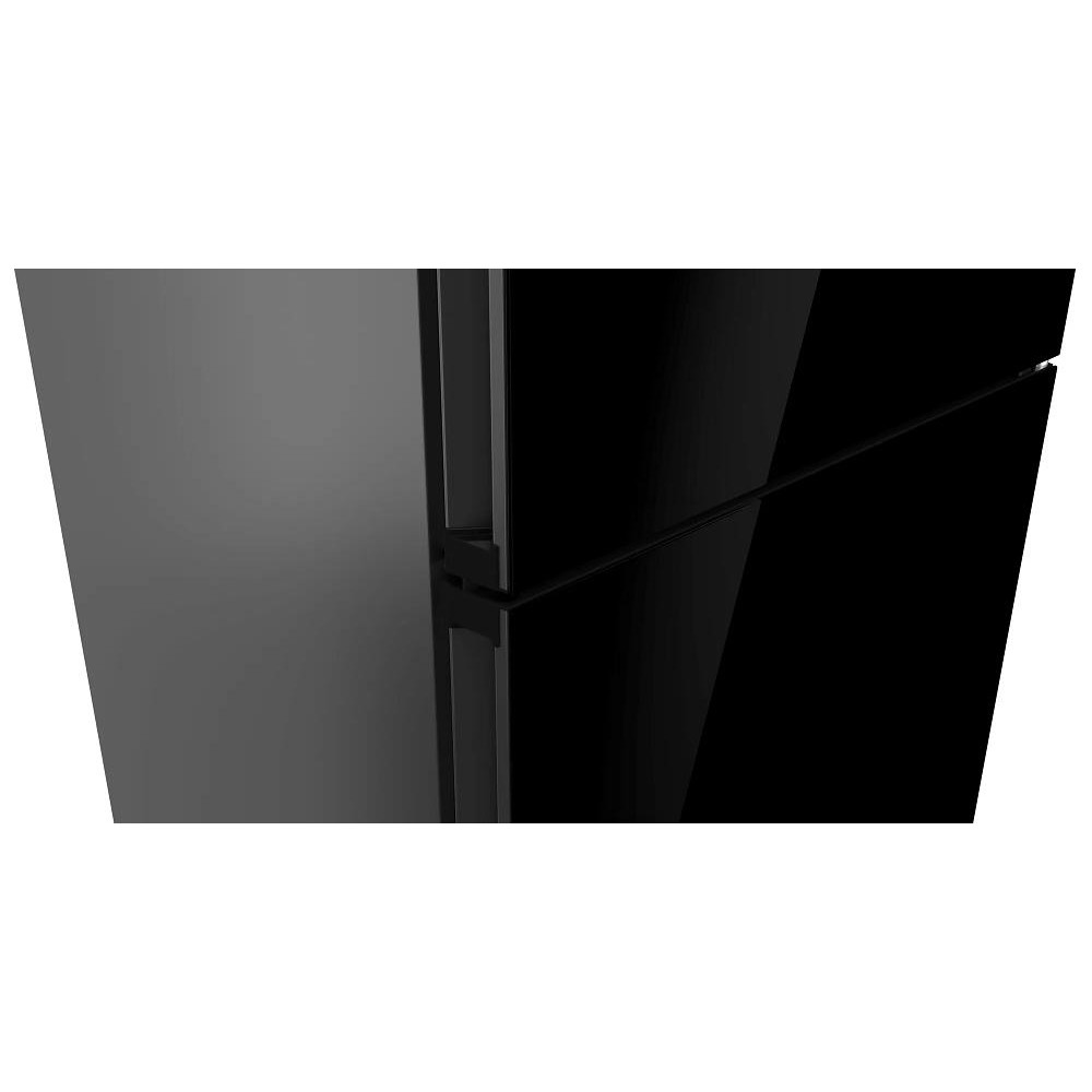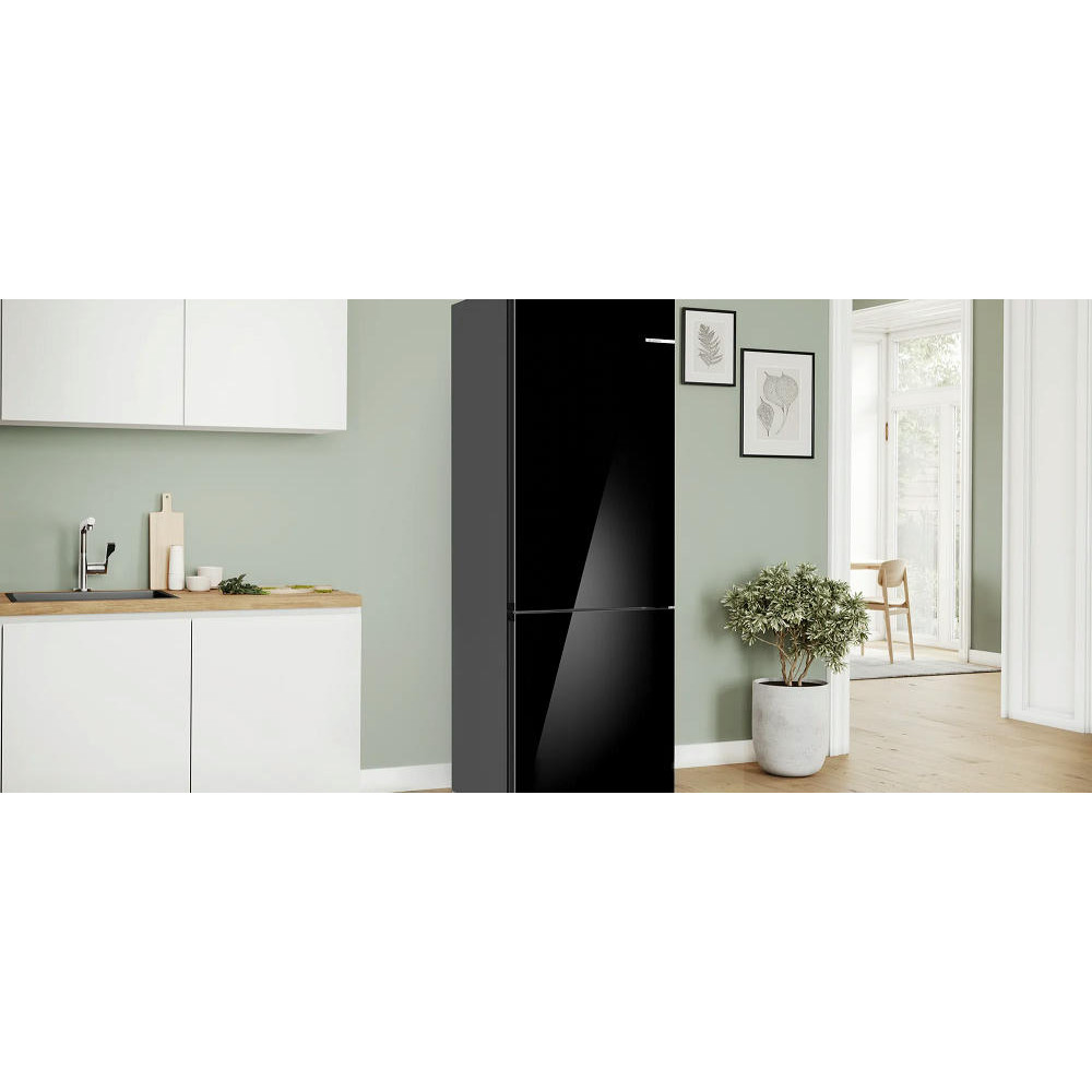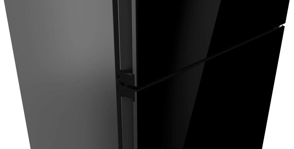 Двухкамерный холодильник Bosch KGN49LBCF — это идеальное сочетание стильного дизайна и продуманной функциональности. Элегантный черный цвет корпуса и стеклянное покрытие дверцы придают устройству премиальный вид, который станет изысканным дополнением любого интерьера. Встроенная вертикальная ручка обеспечивает удобство открытия, а возможность перенавешивания двери позволяет адаптировать холодильник под любое пространство. Уникальность данной модели обусловлена ее вместительностью и продуманной внутренней организацией. Общий полезный объем составляет 440 литров, из которых 311 литров отведено под холодильную камеру, а оставшиеся 129 литров — под морозильную. В холодильной камере предусмотрено 5 полок из высокопрочного стекла, три из которых регулируемые, что позволяет гибко настраивать пространство под хранение продуктов различного размера. Также есть специальная полка для бутылок и 4 полки на дверце. Особенностью холодильника является наличие зоны свежести VitaFresh, которая помогает сохранять продукты свежими на протяжении длительного времени. В морозильной камере расположены 3 ящика, что позволяет эффективно организовать хранение замороженных продуктов. Управление холодильником осуществляется с помощью сенсорных элементов и электронного дисплея, что делает его использование максимально удобным и интуитивно понятным. Функция «Отпуск» позволяет снизить энергопотребление при отсутствии дома, а системы No Frost и автоматического размораживания обеспечивают стабильную работу и продлевают срок службы устройства.