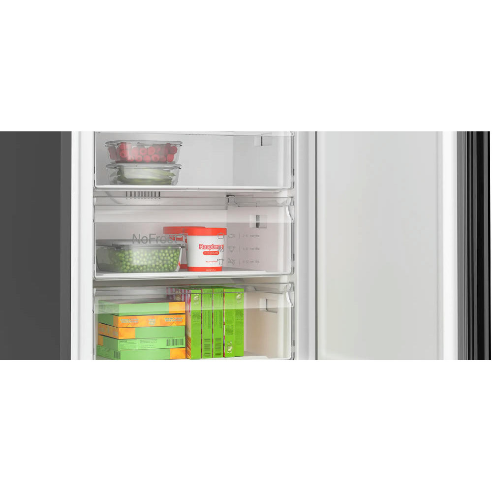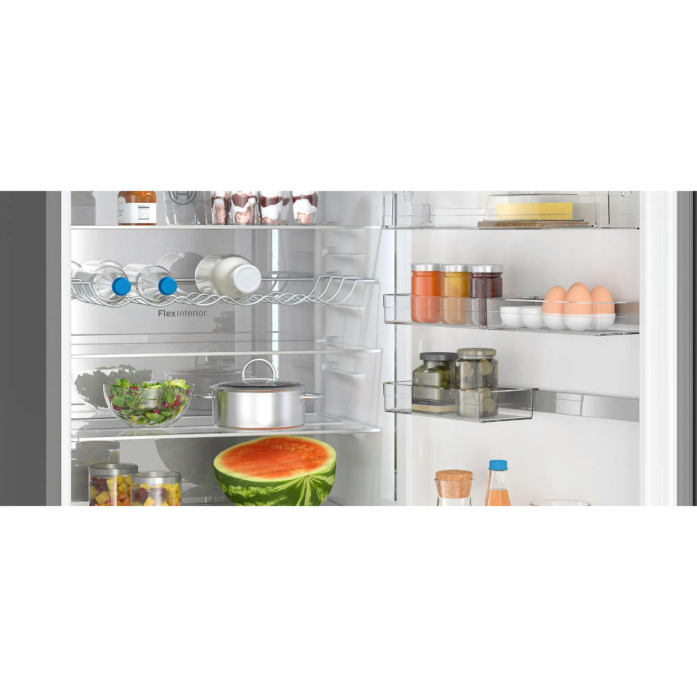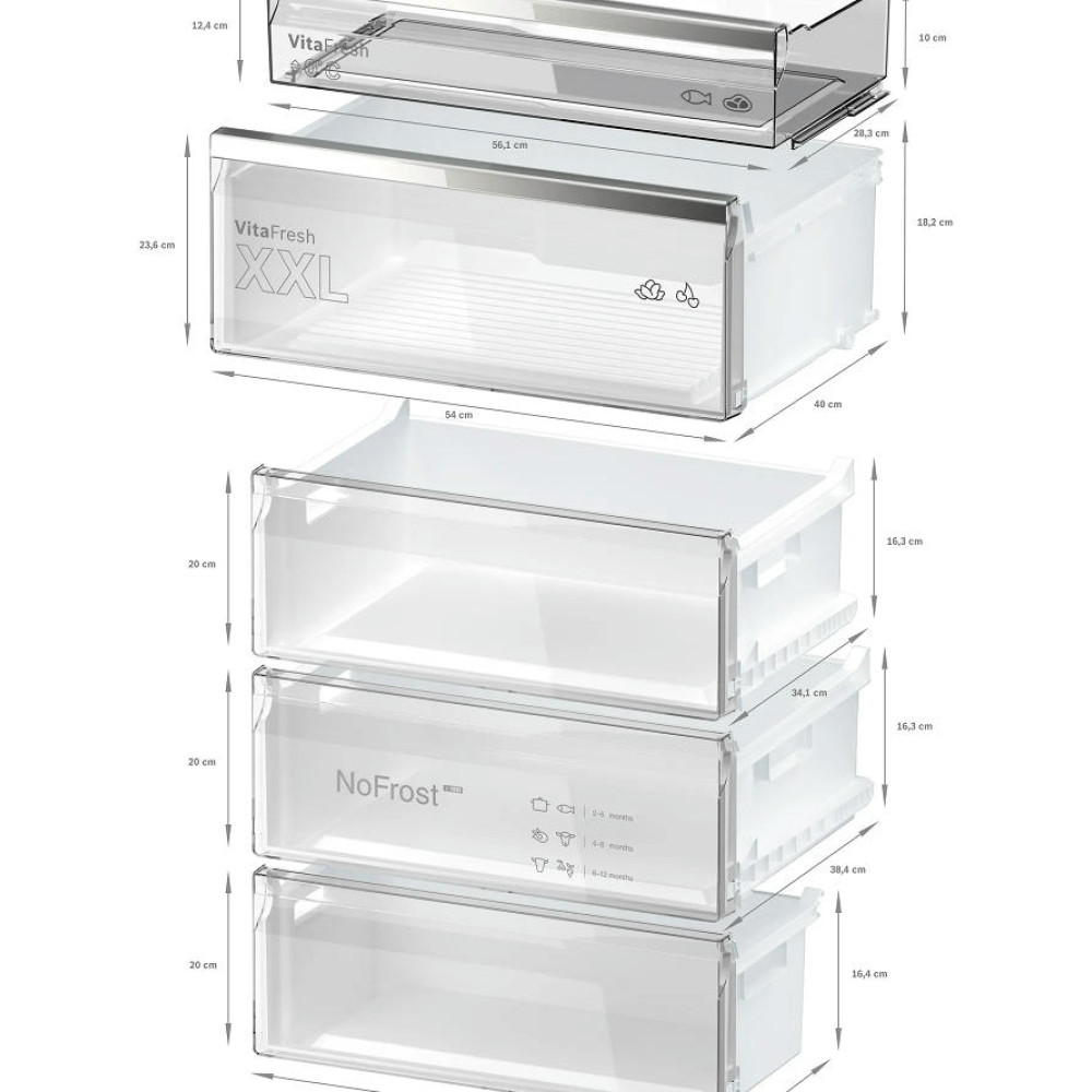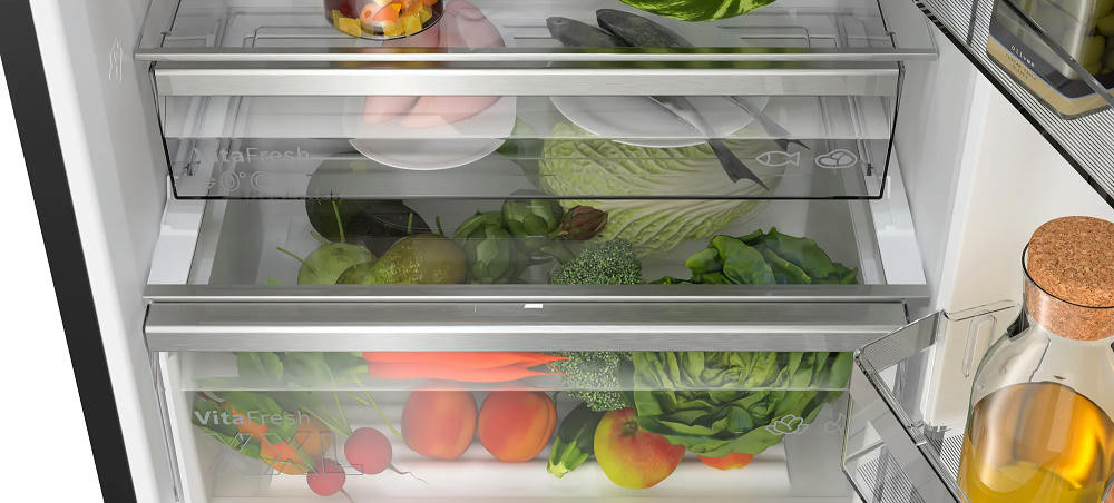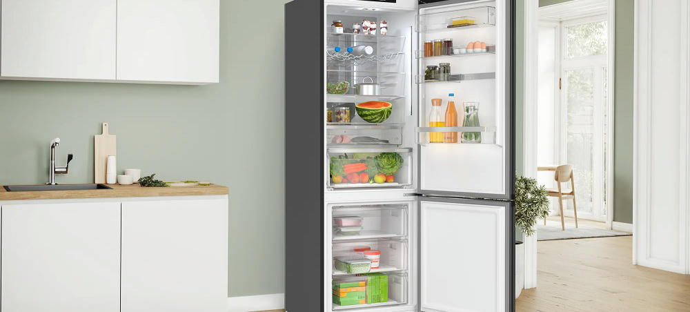 Двухкамерный холодильник Bosch KGN49LBCF — это идеальное сочетание стильного дизайна и продуманной функциональности. Элегантный черный цвет корпуса и стеклянное покрытие дверцы придают устройству премиальный вид, который станет изысканным дополнением любого интерьера. Встроенная вертикальная ручка обеспечивает удобство открытия, а возможность перенавешивания двери позволяет адаптировать холодильник под любое пространство. Уникальность данной модели обусловлена ее вместительностью и продуманной внутренней организацией. Общий полезный объем составляет 440 литров, из которых 311 литров отведено под холодильную камеру, а оставшиеся 129 литров — под морозильную. В холодильной камере предусмотрено 5 полок из высокопрочного стекла, три из которых регулируемые, что позволяет гибко настраивать пространство под хранение продуктов различного размера. Также есть специальная полка для бутылок и 4 полки на дверце. Особенностью холодильника является наличие зоны свежести VitaFresh, которая помогает сохранять продукты свежими на протяжении длительного времени. В морозильной камере расположены 3 ящика, что позволяет эффективно организовать хранение замороженных продуктов. Управление холодильником осуществляется с помощью сенсорных элементов и электронного дисплея, что делает его использование максимально удобным и интуитивно понятным. Функция «Отпуск» позволяет снизить энергопотребление при отсутствии дома, а системы No Frost и автоматического размораживания обеспечивают стабильную работу и продлевают срок службы устройства.