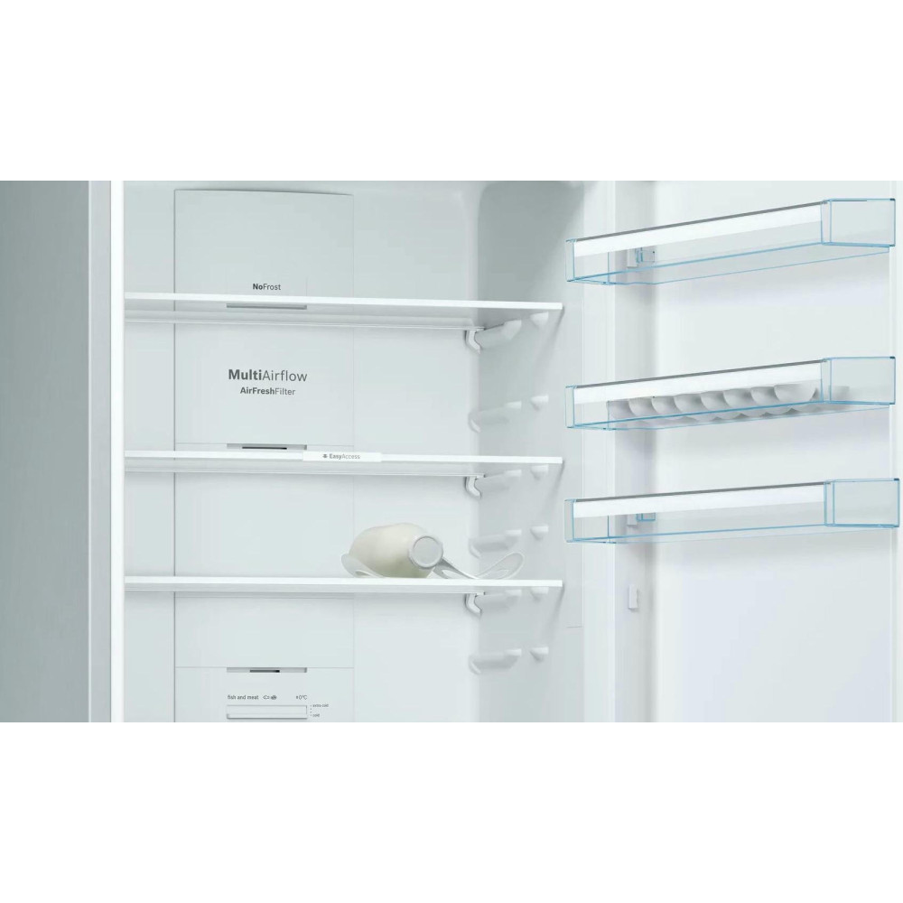 В холодильной камере есть четыре полки, три из которых можно регулировать по высоте, а также выдвижные полки EasyAccess для удобства использования. Кроме того, есть специальная полка для бутылок и четыре полки на дверце, что позволяет эффективно использовать пространство холодильника. В холодильнике также есть зона свежести VitaFresh 0°С, которая идеально подходит для хранения мяса и рыбы.