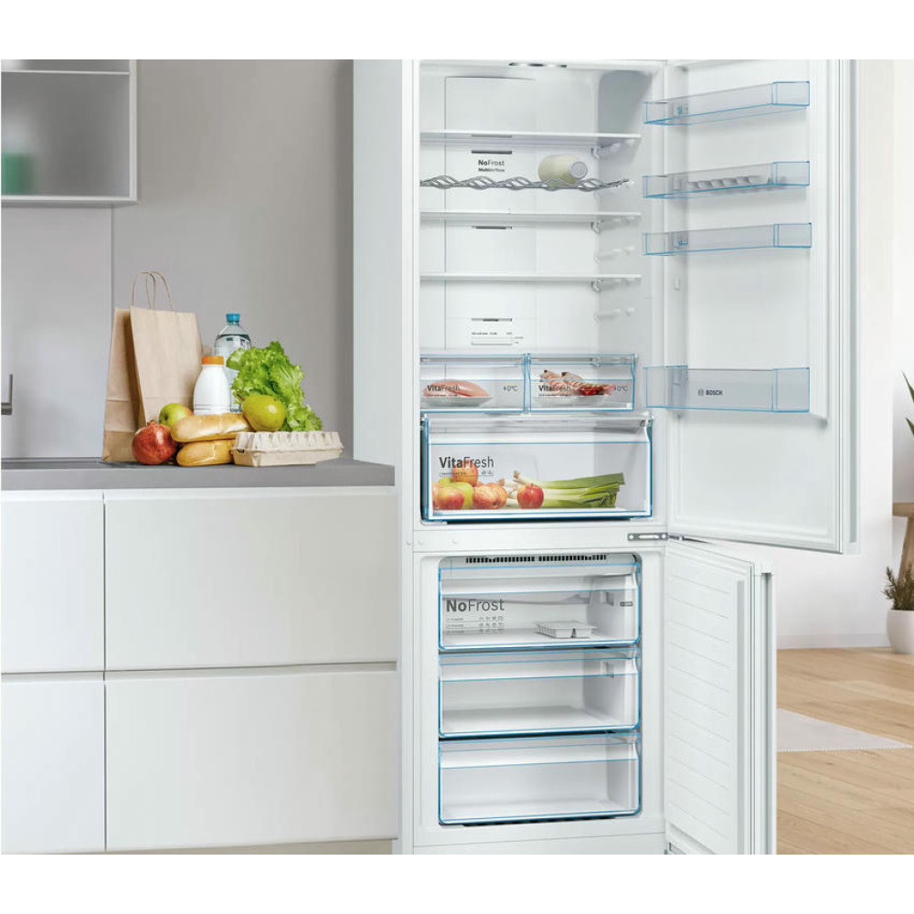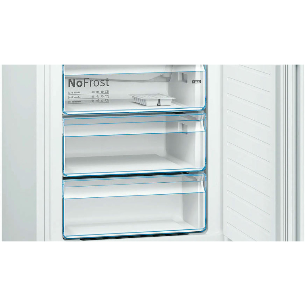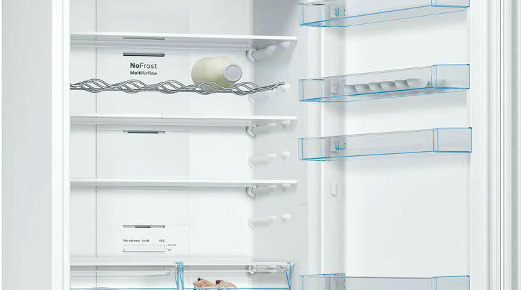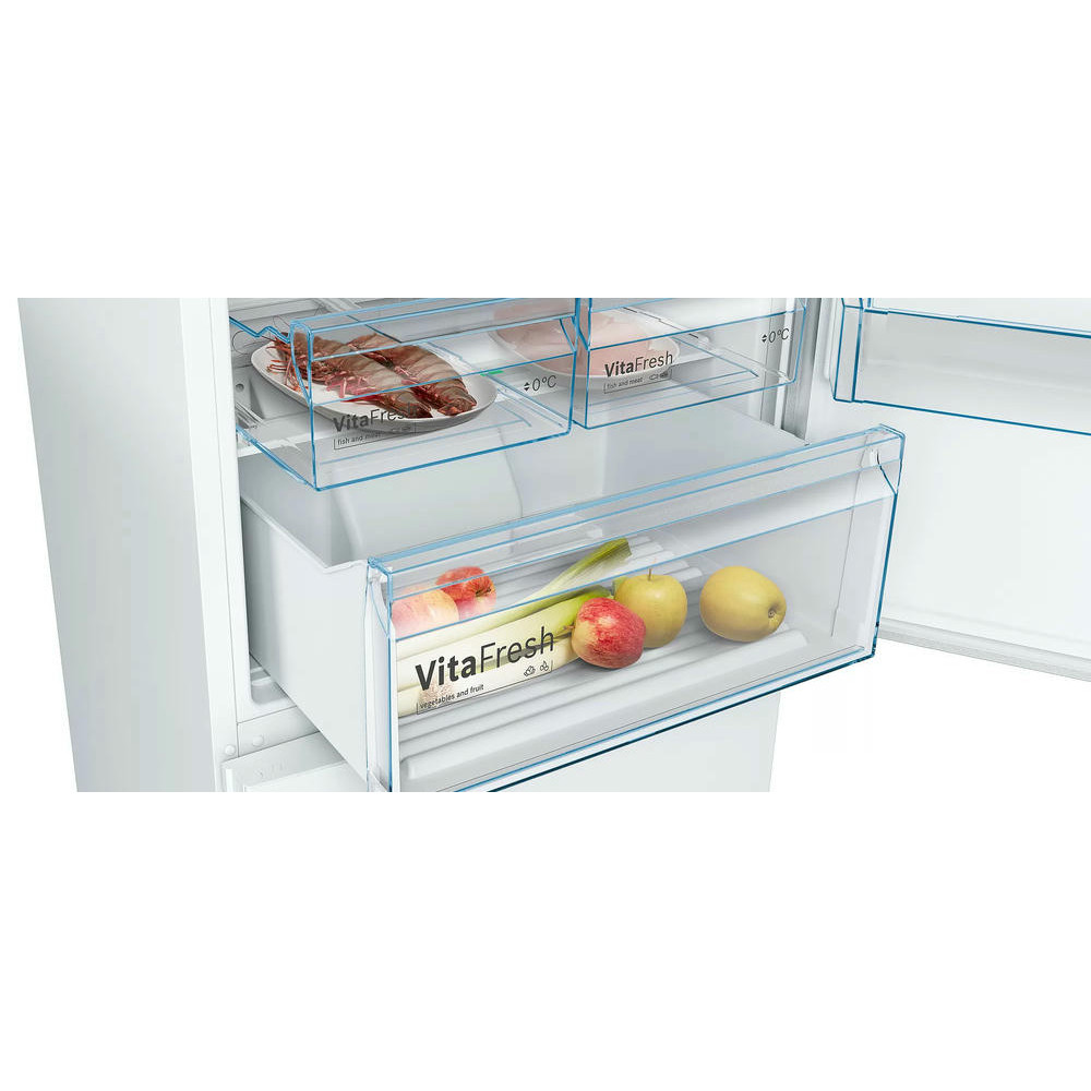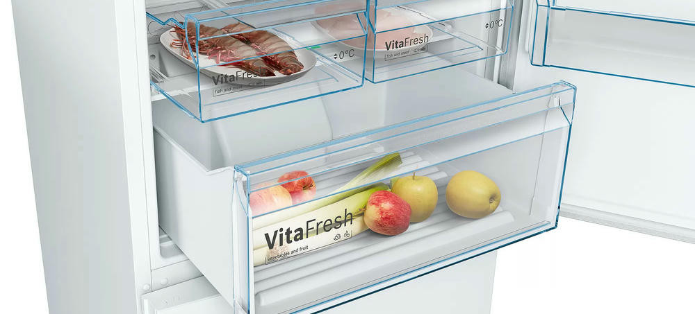 Двухкамерный холодильник Bosch KGN49XWEA имеет систему No Frost, она поддерживает постоянный поток сухого воздуха и предотвращает образование льда, вы можете забыть о размораживании холодильного и морозильного отделения. Выдвижная полка EasyAccess удобна, если холодильник полностью укомплектован. Имеется зона свежести прожуктов VitaFresh в ней удобно хранить свежую рыбу, мясо, овощи и фрукты до 0°C.