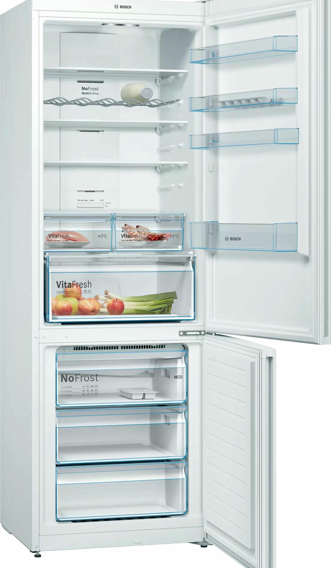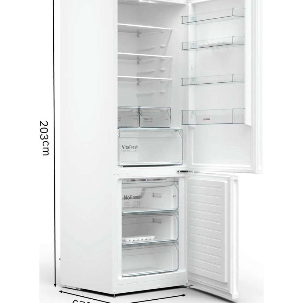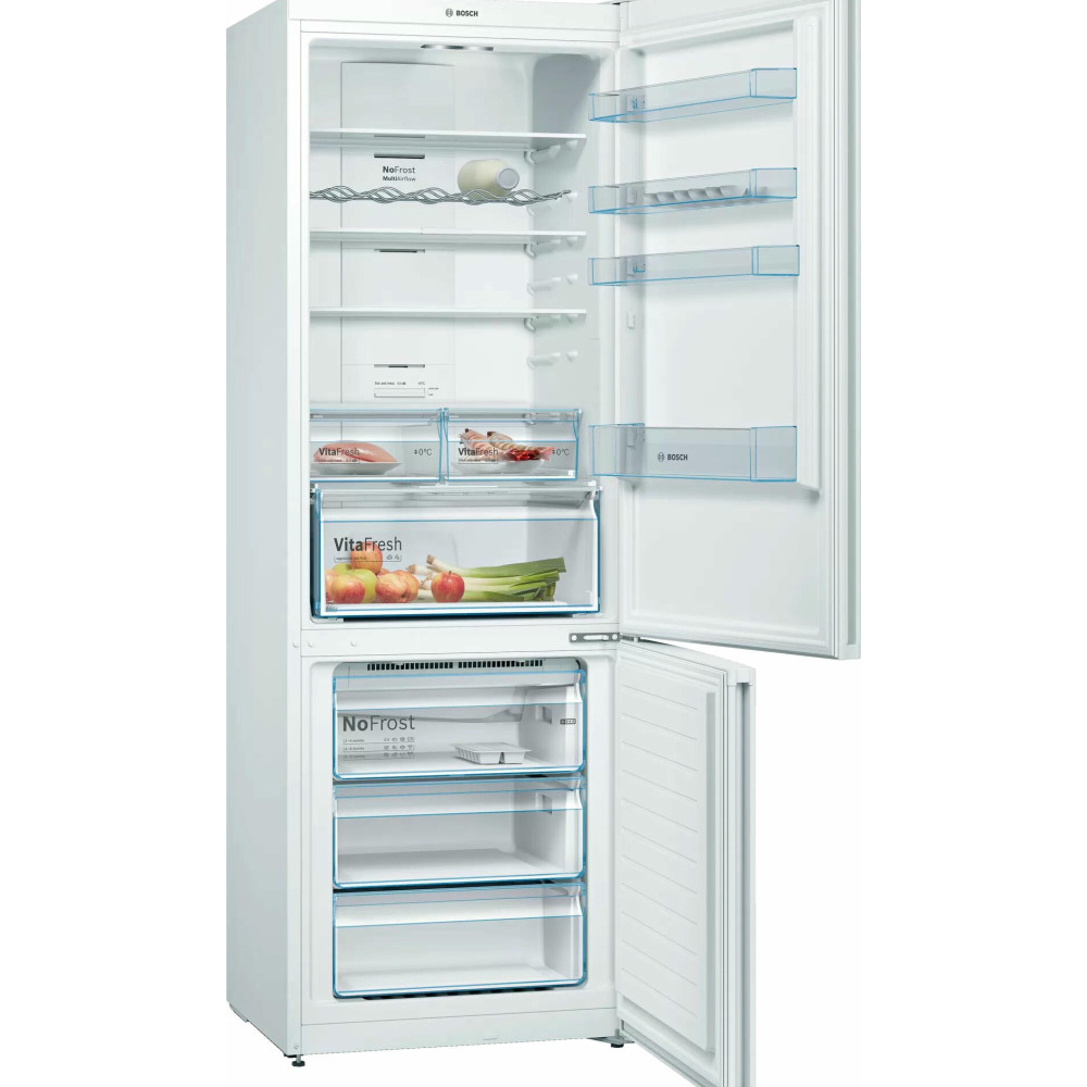 Двухкамерный холодильник Bosch KGN49XWEA имеет систему No Frost, она поддерживает постоянный поток сухого воздуха и предотвращает образование льда, вы можете забыть о размораживании холодильного и морозильного отделения. Выдвижная полка EasyAccess удобна, если холодильник полностью укомплектован. Имеется зона свежести прожуктов VitaFresh в ней удобно хранить свежую рыбу, мясо, овощи и фрукты до 0°C.