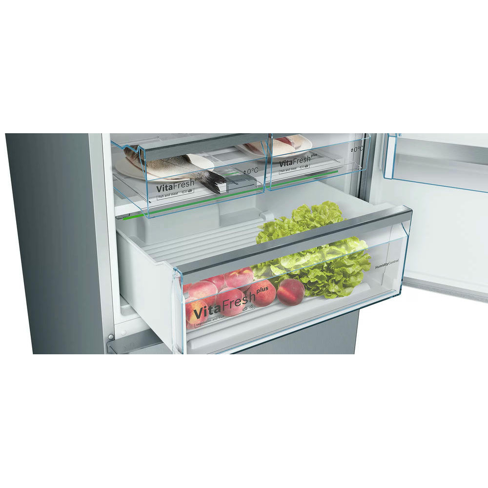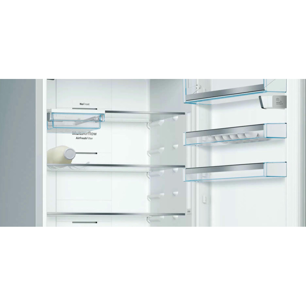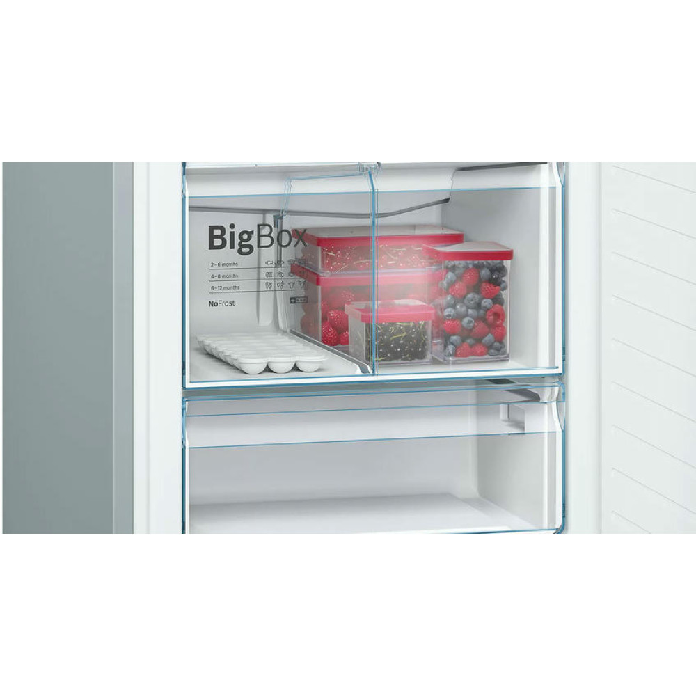 Двухкамерный холодильник Bosch KGN56HI30M оснащен полкой EasyAccess, она выдвигается из устройства, благодаря ей вы легко получаете доступ к продуктам. Ящик BigBox расположенный в морозильной камере позволяет хранить, даже большой торт или пиццу. Home Connect позволяет отслеживать состояние вашего прибора удаленно с вашего смартфона.