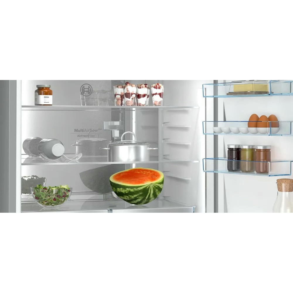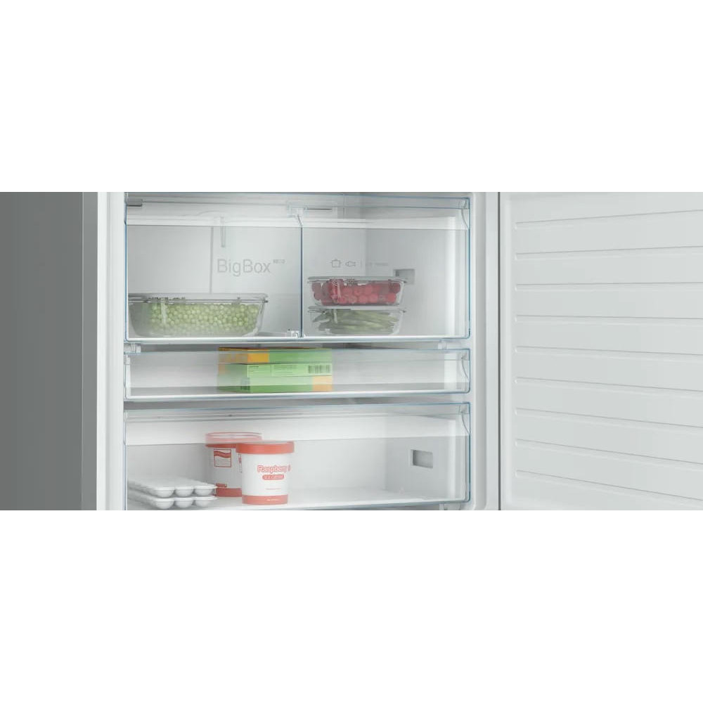 В холодильной камере установлены три полки, две из которых регулируемые, а одна - фиксированная. Такое решение позволяет максимально эффективно использовать пространство внутри холодильника. Кроме того, в холодильнике есть полка для бутылок и шесть полок на дверце, что обеспечивает дополнительное пространство для хранения продуктов. Морозильная камера расположена снизу и оснащена системой охлаждения No Frost. Это позволяет сократить время размораживания и увеличить срок службы устройства. В морозильной камере установлены три ящика, включая большой ящик BigBox, который идеально подходит для хранения крупных продуктов.