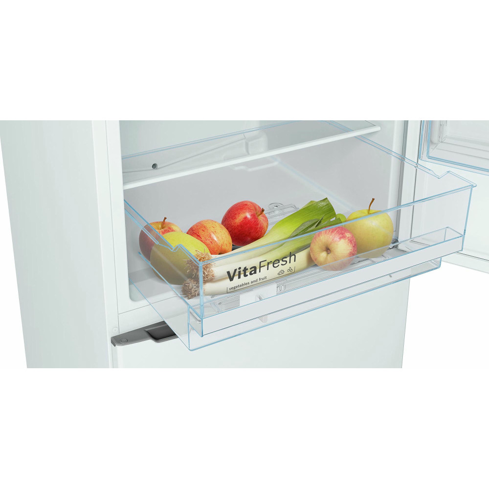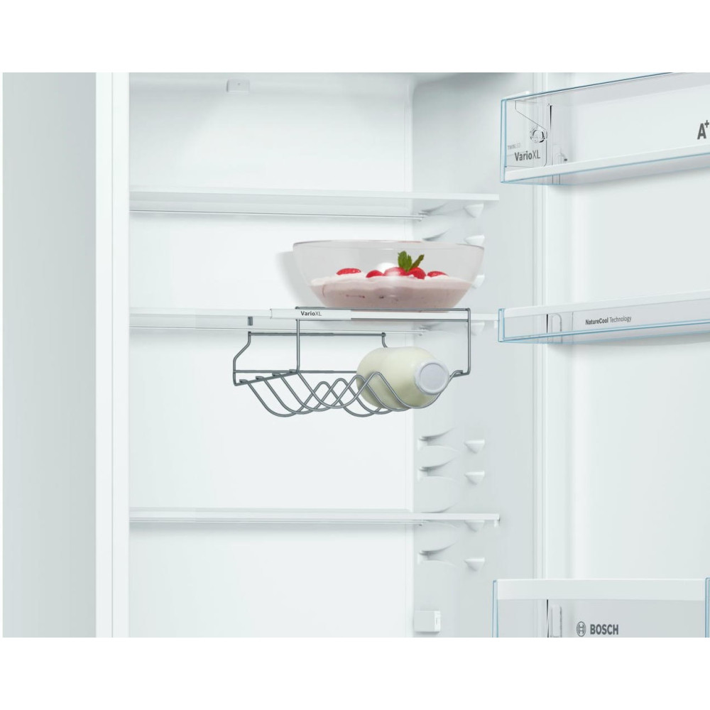Двухкамерный холодильник Bosch KGV36XW21R из новой линейки приборов NatureCool работает очень тихо, уровень шума всего 38 дБ. Благодаря отсутствию принудительной вентиляции в холодильной камере поддерживается оптимальный уровень влажности, поэтому продукты надолго сохраняют свежесть и привлекательный внешний вид.