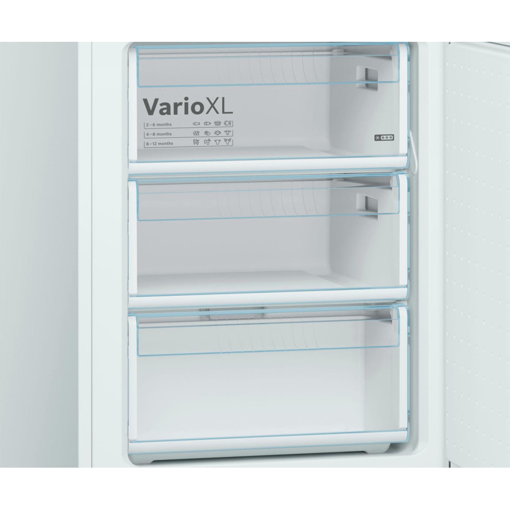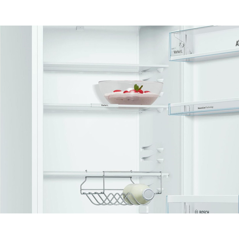 Двухкамерный холодильник Bosch KGV36XW2AR из новой линейки NatureCool оборудован системой охлаждения LowFrost. Лед на стенках образуется медленно и тонким слоем, размораживание требуется 1-2 раза в году. Прибор отличается низким уровнем шума.