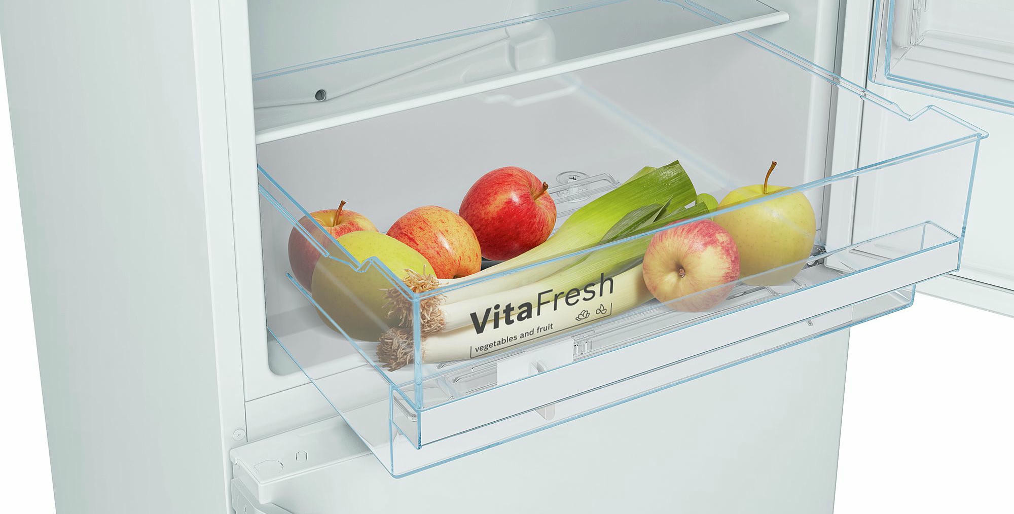 Двухкамерный холодильник Bosch KGV36XW2O отличается тихой работой, он издает шум всего 38 дБ. Технология NatureCool обеспечивает оптимальный уровень влажности в и поддерживает натуральную свежесть продуктов. Система VarioXL позволяет организовать внутреннее пространство с учетом потребностей пользователя.