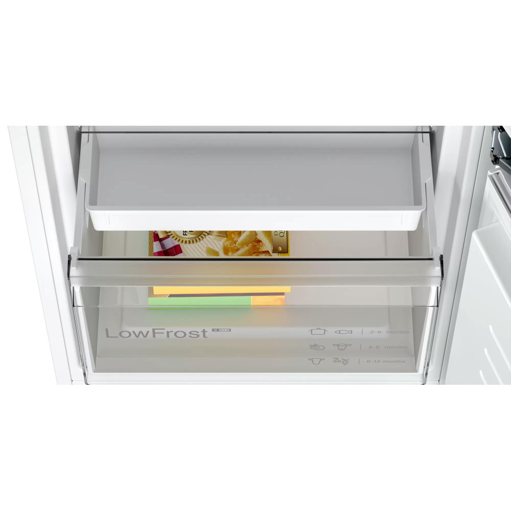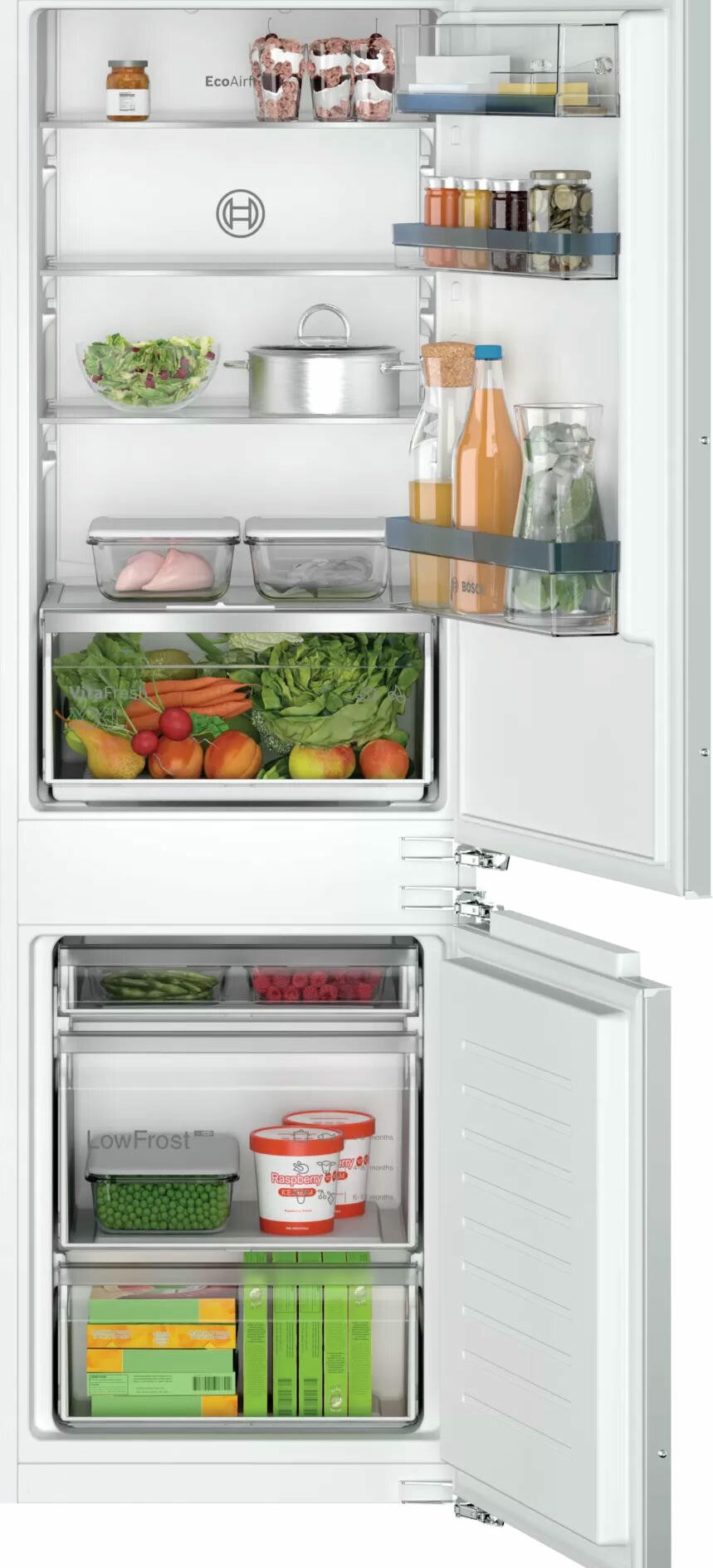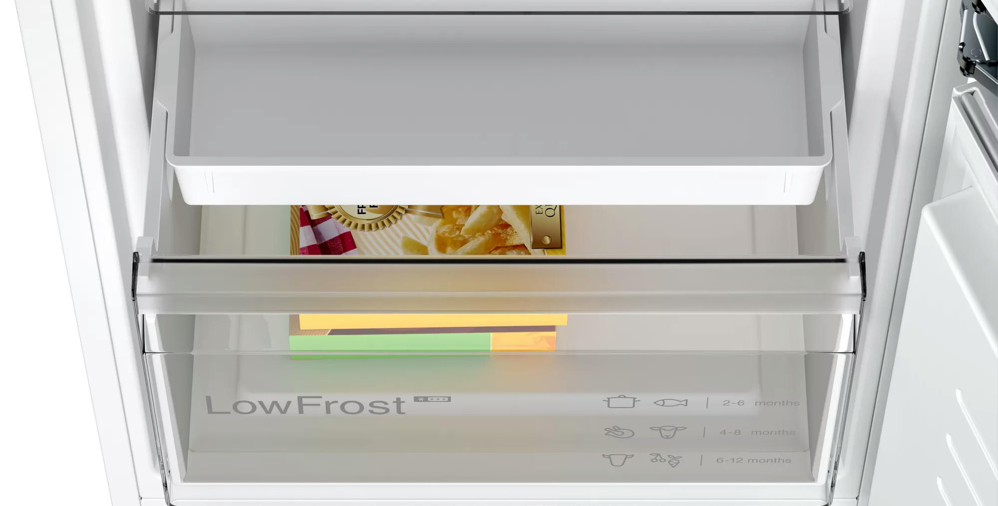 Двухкамерный холодильник Bosch KIV86VFE1 оснащен светодиодными лампами, которые освещают всю рабочую камеру. Ящик VitaFresh позволяет дольше сохранять свежесть фруктов и овощей. Система Low Frost уменьшает образование льда на стенках устройства и не требует частого размораживания.