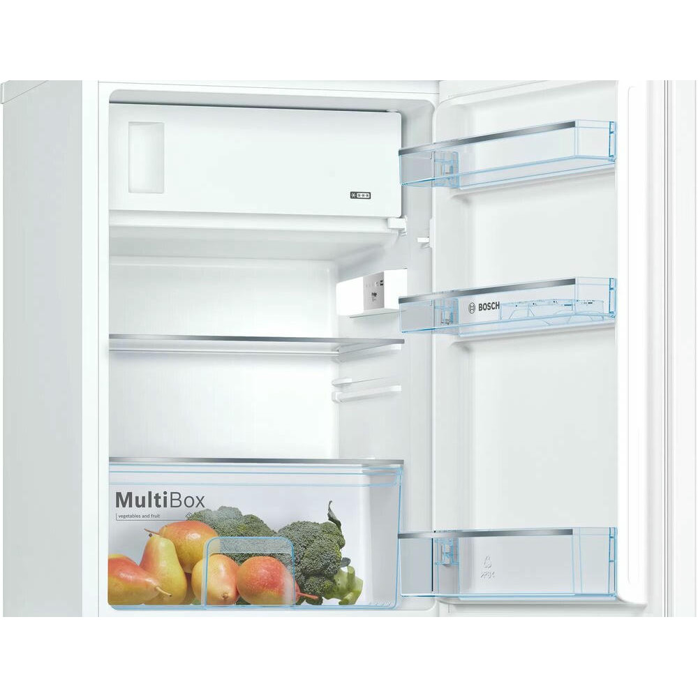 Двухкамерный холодильник Bosch KTL15NWFA оснащен светодиодное освещением оно равномерно освещает все полки устройства, и не требует постоянной замены. При отключении энергии морозильная камерна будет поддерживать температуру 9 часов. Имеется контейнер для овощей и фруктов MultiBox.
