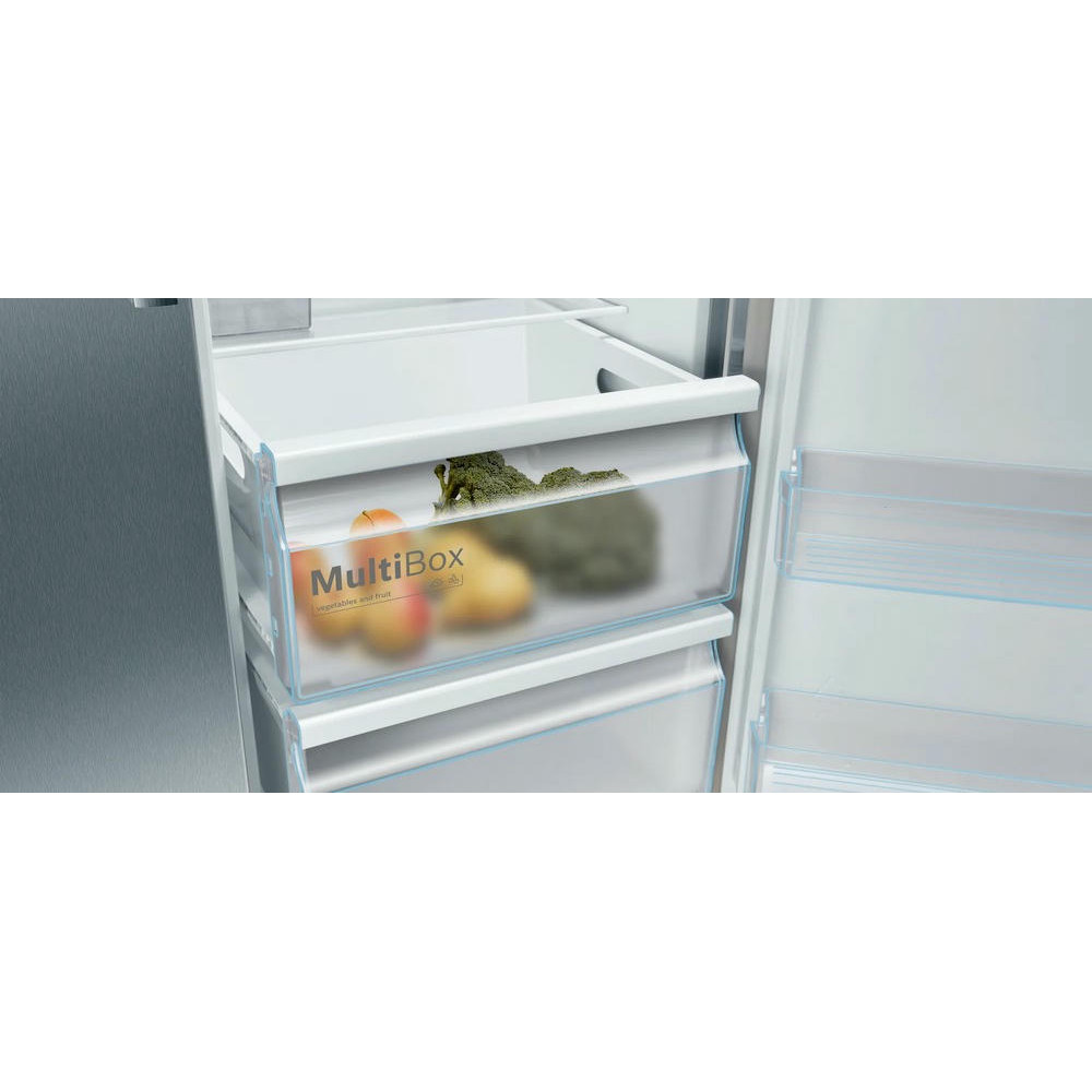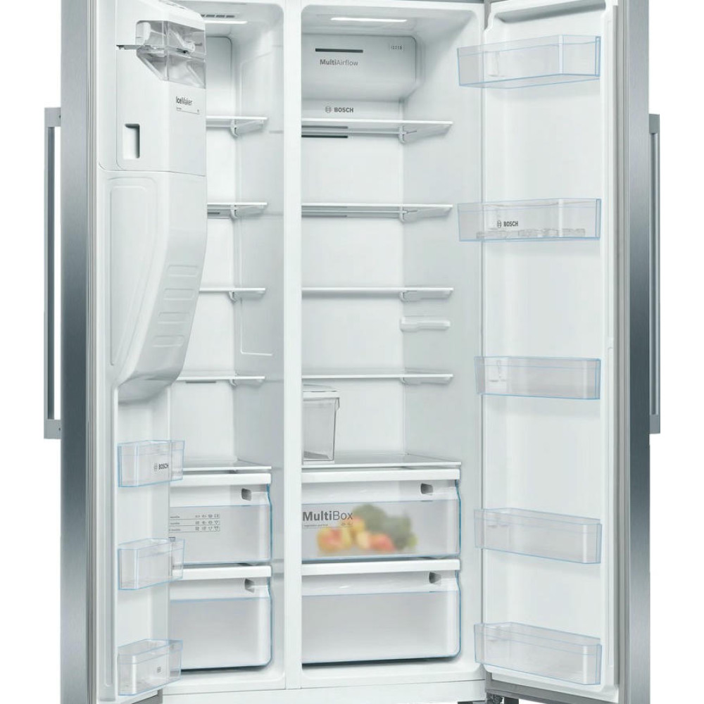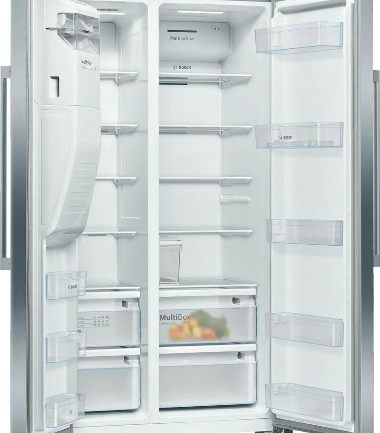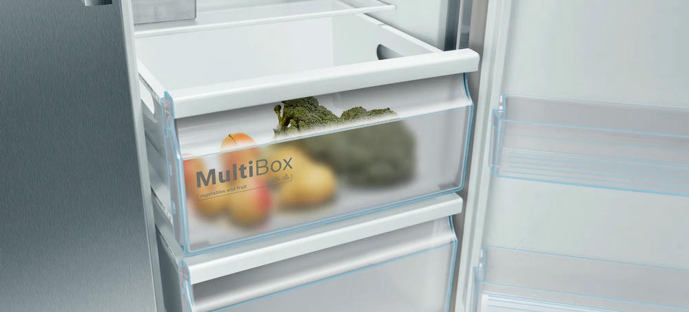 Двухкамерный холодильник Side by Side Bosch KAI93VI304 — современная модель, выполненная в цвете нержавеющей стали. Прибор имеет систему MultiBox — прозрачный контейнер для фруктов и овощей, который сохраняет свежесть продуктов.
